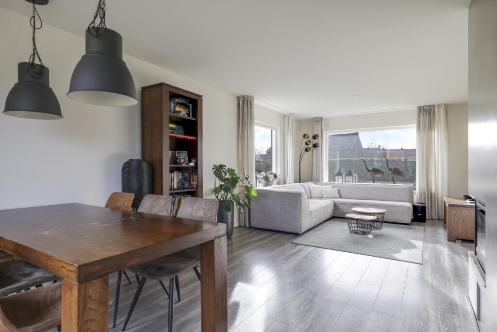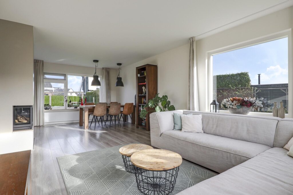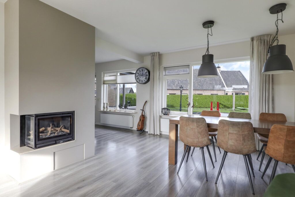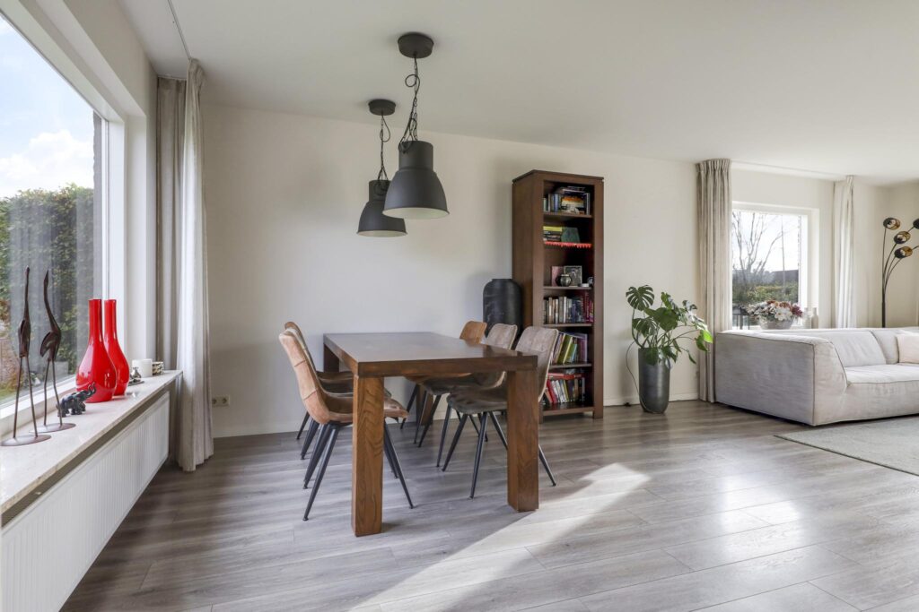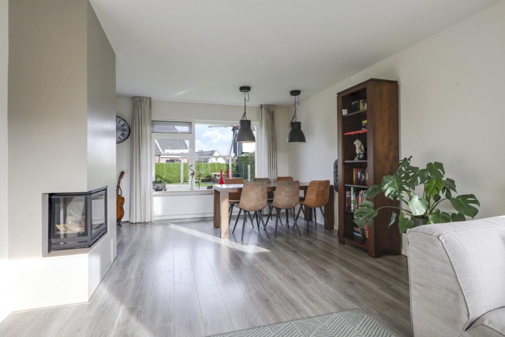Opvallend aan deze woonkamer is de prettige lichtinval. Grote raampartijen zorgen niet alleen voor veel daglicht, maar ook voor een mooi zicht in de tuin (rondom). Dit zorgt voor een prettige woonsfeer zonder enige inkijk. De woonkamer is in te richten met bijvoorbeeld een lekkere hoekbank. Ook kun je er met gemak een lange 6- of 8-persoons eettafel kwijt. Een eye-catcher centraal in de woonkamer is de ingebouwde gashaard die in de koude maanden voor gezellige winteravonden kan zorgen.