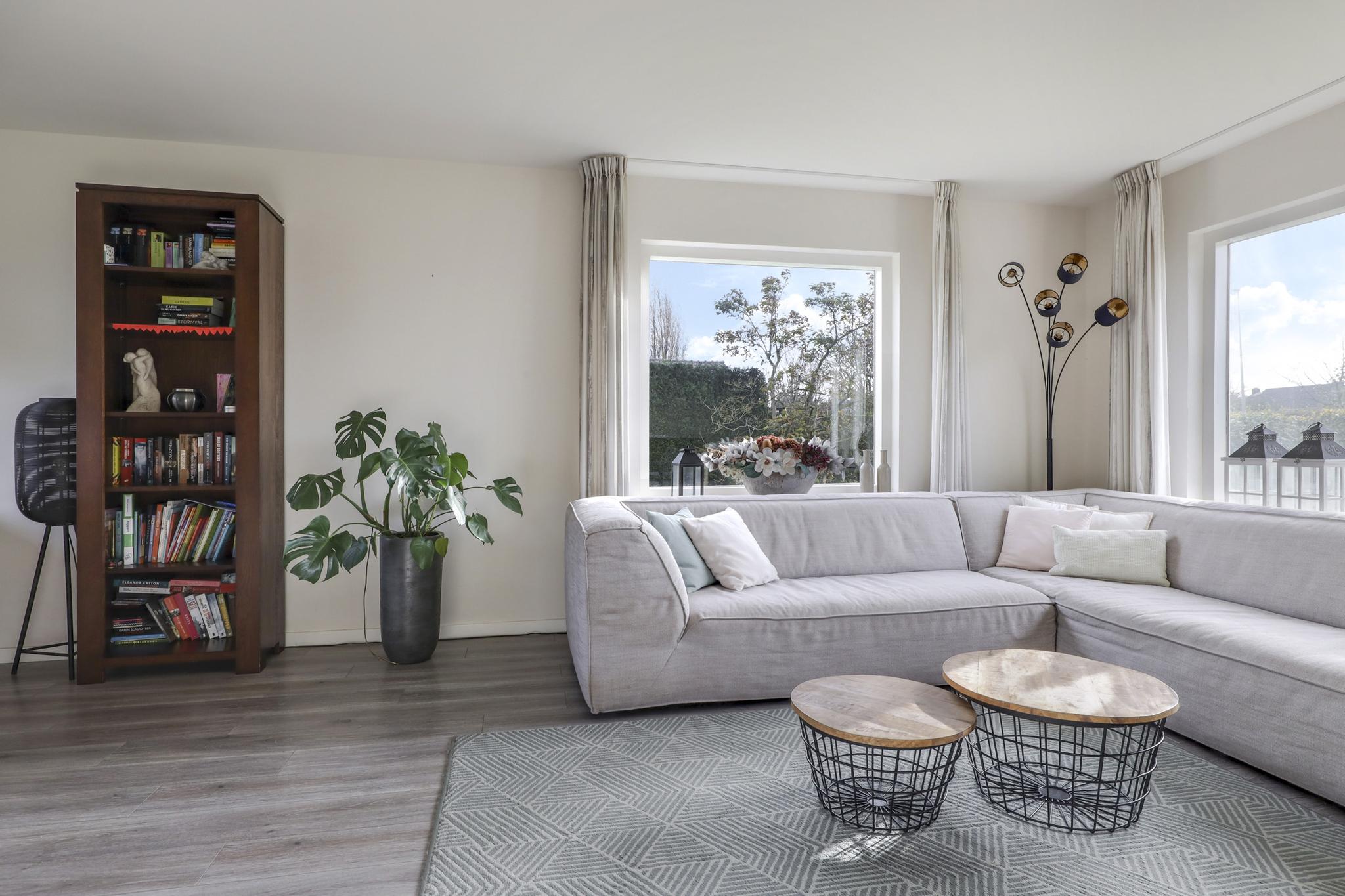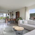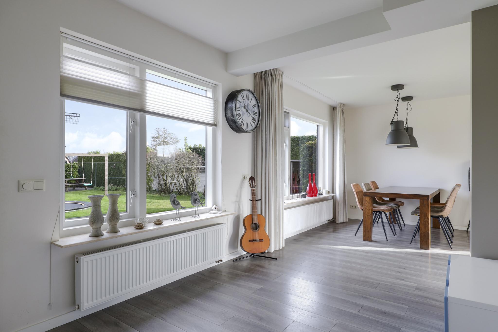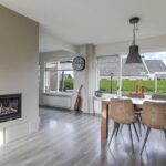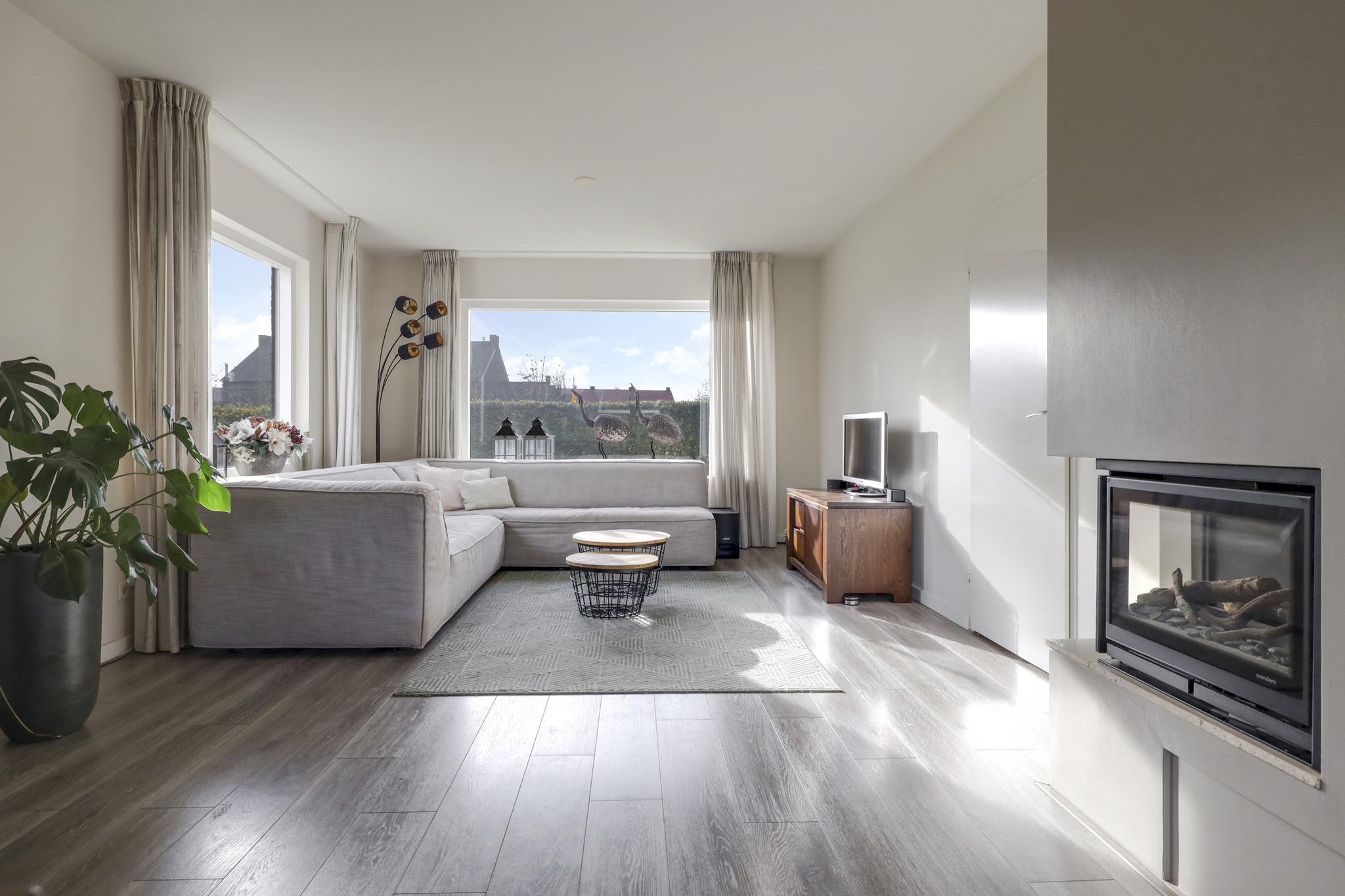 Opvallend aan deze woonkamer is de prettige lichtinval. Grote raampartijen zorgen niet alleen voor veel daglicht, maar ook voor een mooi zicht in de tuin (rondom). Dit zorgt voor een prettige woonsfeer zonder enige inkijk. De woonkamer is in te richten met bijvoorbeeld een lekkere hoekbank. Ook kun je er met gemak een lange 6- of 8-persoons eettafel kwijt. Een eye-catcher centraal in de woonkamer is de ingebouwde gashaard die in de koude maanden voor gezellige winteravonden kan zorgen.