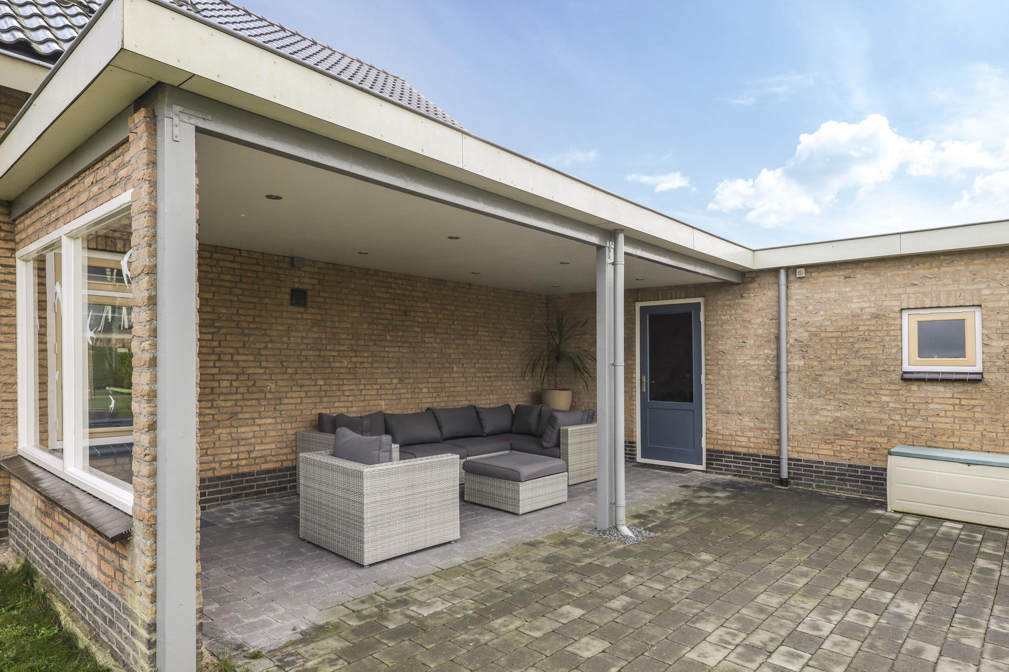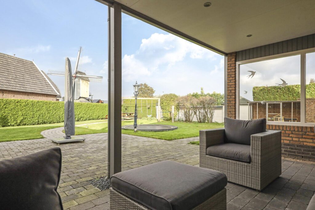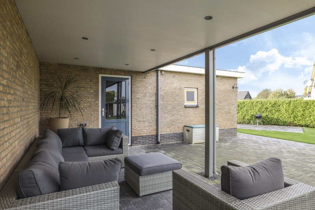 Vanuit de garage loop je via de zijdeur naar buiten de veranda in. De veranda schakelt de woning en de garage aan elkaar waardoor je droog van de één naar de andere kunt lopen. Tevens is het een heerlijk, overdekt buitenterras (19m2) waar je met gemak een lekkere loungebank kwijt kunt. In het plafond zijn inbouwspots aangebracht.