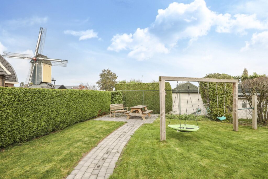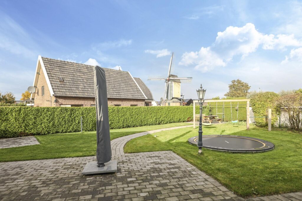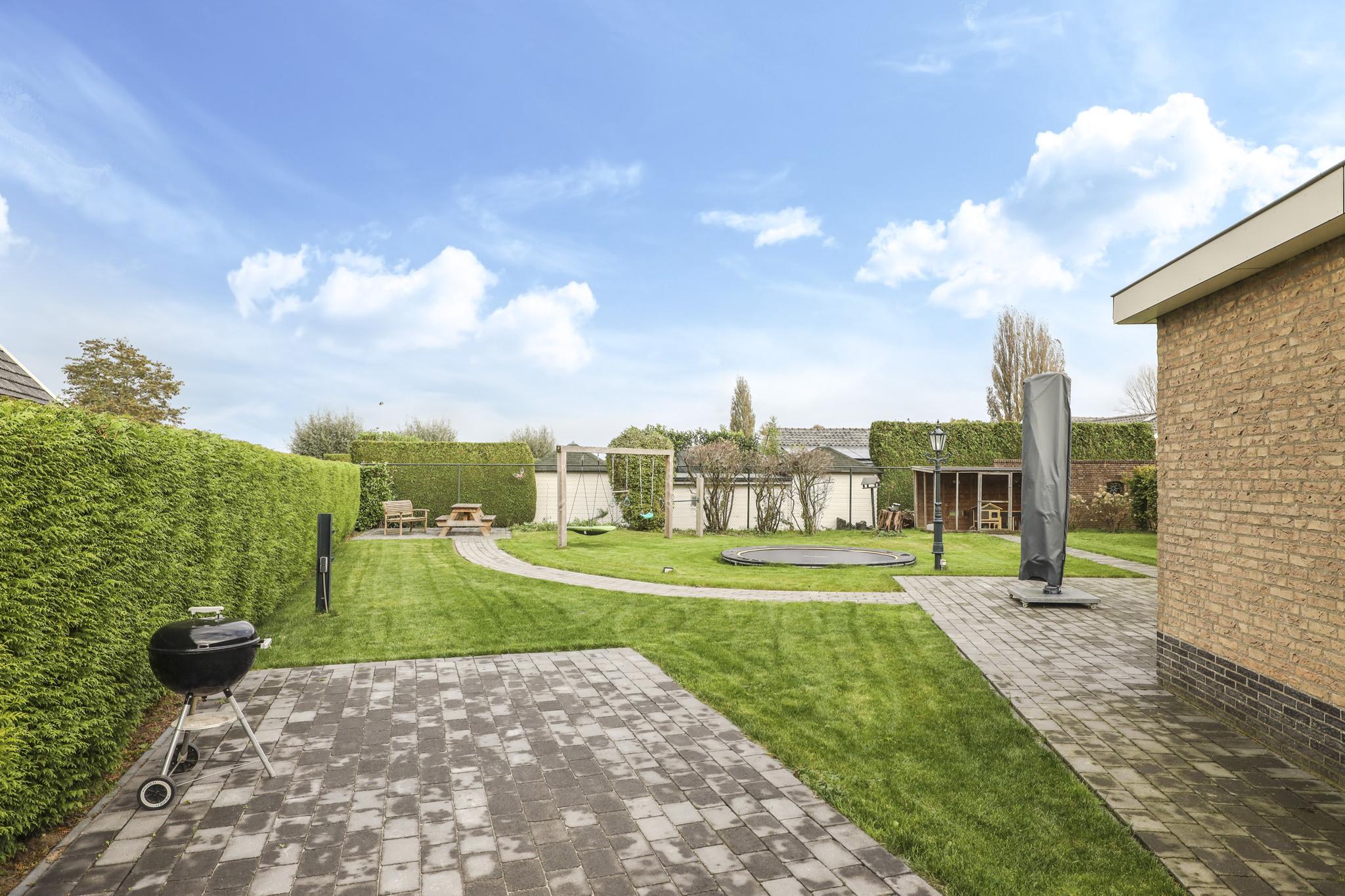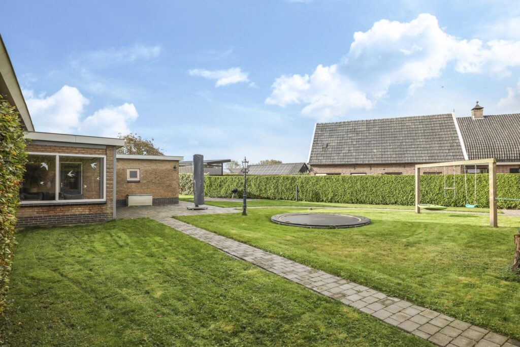 Het perceel kent geen haakse hoeken, maar is wel lekker breed waarbij de woning gunstig op de kavel staat. Elke zijde van de tuin heeft zijn eigen ruimtelijke vrijheid waardoor het veel potentie te bieden heeft om er je eigen invulling aan te geven. De linkerzijde heeft de ruimte om er bijvoorbeeld een moestuin te creëren. Vanzelfsprekend vinden we de (zonnige) terrassen aan de achterzijde. Hier vind je ook de speeltoestellen zoals de ingegraven trampoline en de schommel. De tuin wordt omsloten met groene hagen die tevens voor de nodige privacy zorgen. En ook aan gras is er geen gebrek. Een balletje trappen kan hier ook prima in de voortuin. Om de tuin in een warme zomer ook groen te houden, kun je de puls gebruiken om (gratis) grondwater op te pompen. Alle toebehoren blijven achter, net zoals de waterstopcontacten, aan te sluiten sectorsproeiers en het aangelegde druppelsysteem.