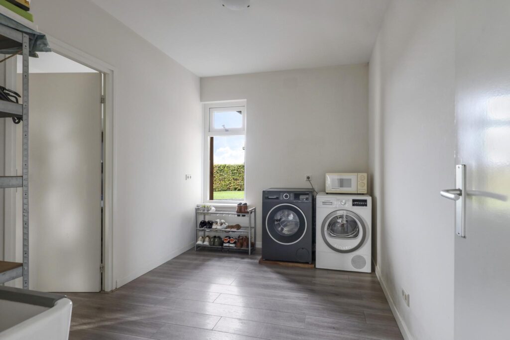 In de keuken is een tuindeur aanwezig. Hierdoor loop je direct het overdekte buitenterras (veranda) op. Een rolhor zorgt ervoor dat insecten geen kans krijgen om naar binnen te vliegen. De andere deur in de keuken geeft toegang tot de bijkeuken waar je bijvoorbeeld een vriezer kwijt kunt.