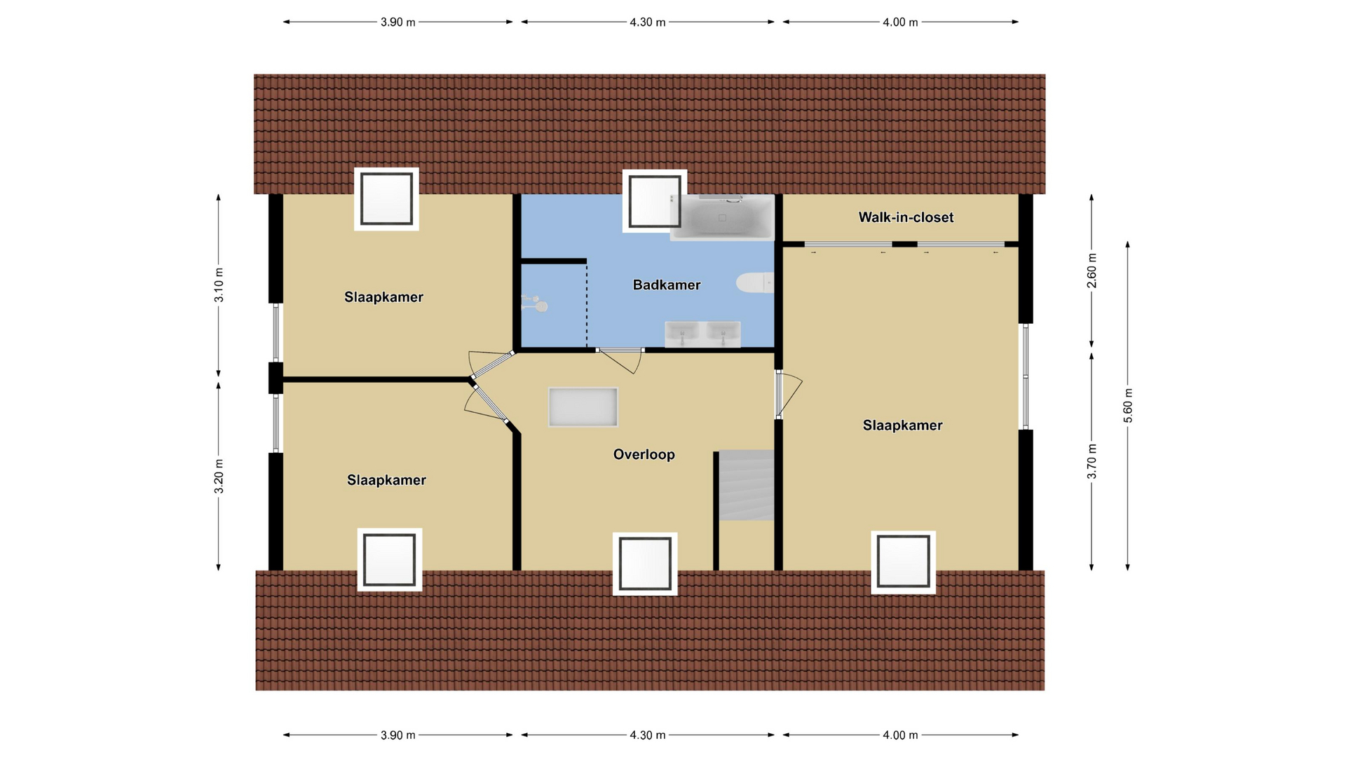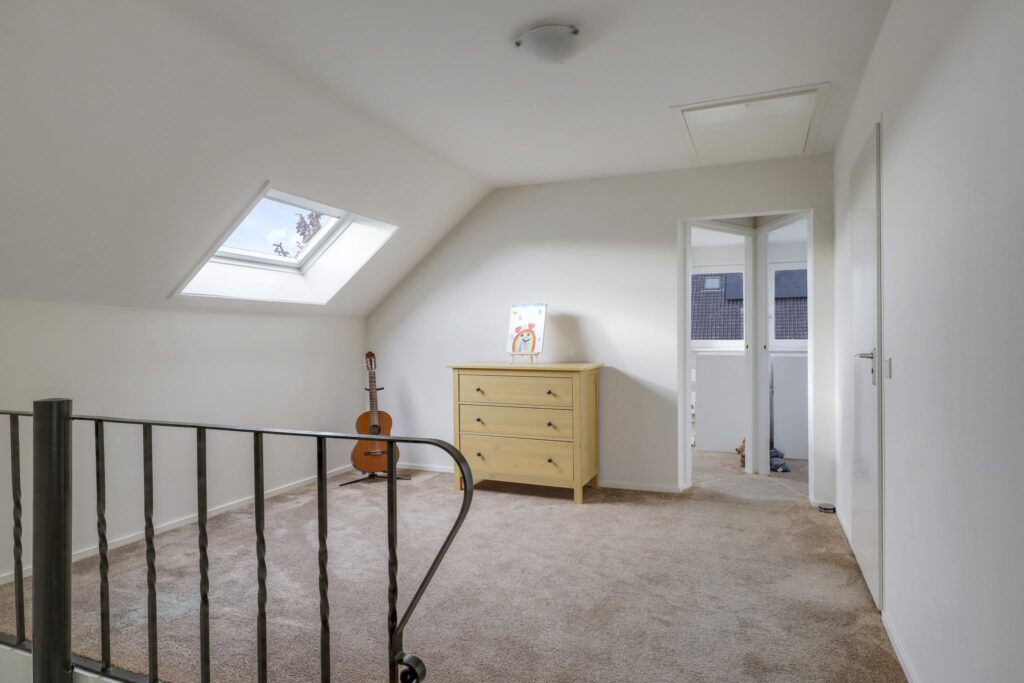 De overloop schakelt de slaapkamers en de badkamer aan elkaar terwijl een groot dakvenster voor een prettige lichtinval zorgt. De slaapkamers zijn respectievelijk 26m2, 12m2 en 12m2 groot. Dit is gemeten vanaf 1,5 meter hoogte waardoor de kamers eigenlijk nog groter zijn. Het is wel duidelijk welke maat bij de masterbedroom hoort, maar ook de kinderkamers hebben het formaat van een ouderslaapkamer. In die zin zou je de ‘master’ ook nog kunnen opdelen in 2 afzonderlijke kamers mocht je een slaapkamer tekort komen…