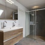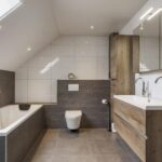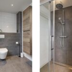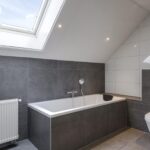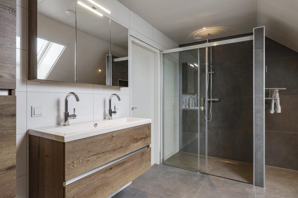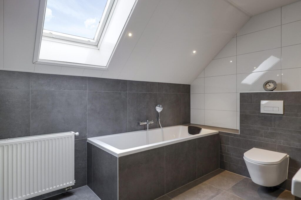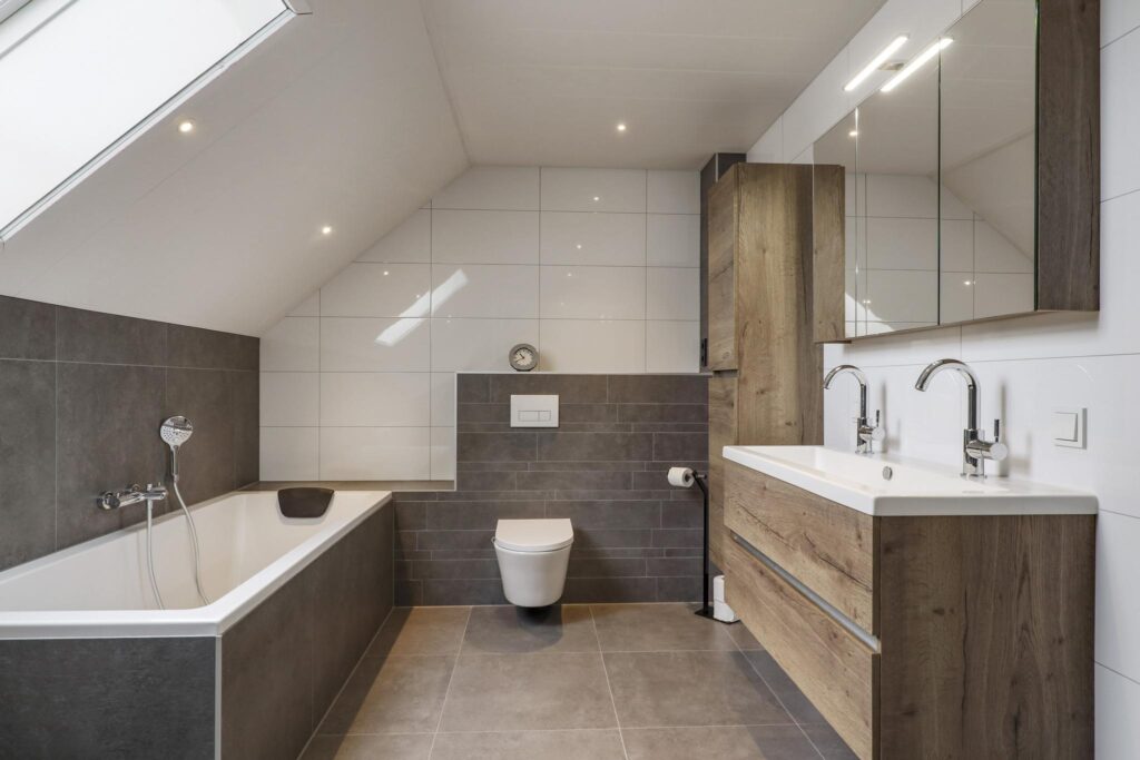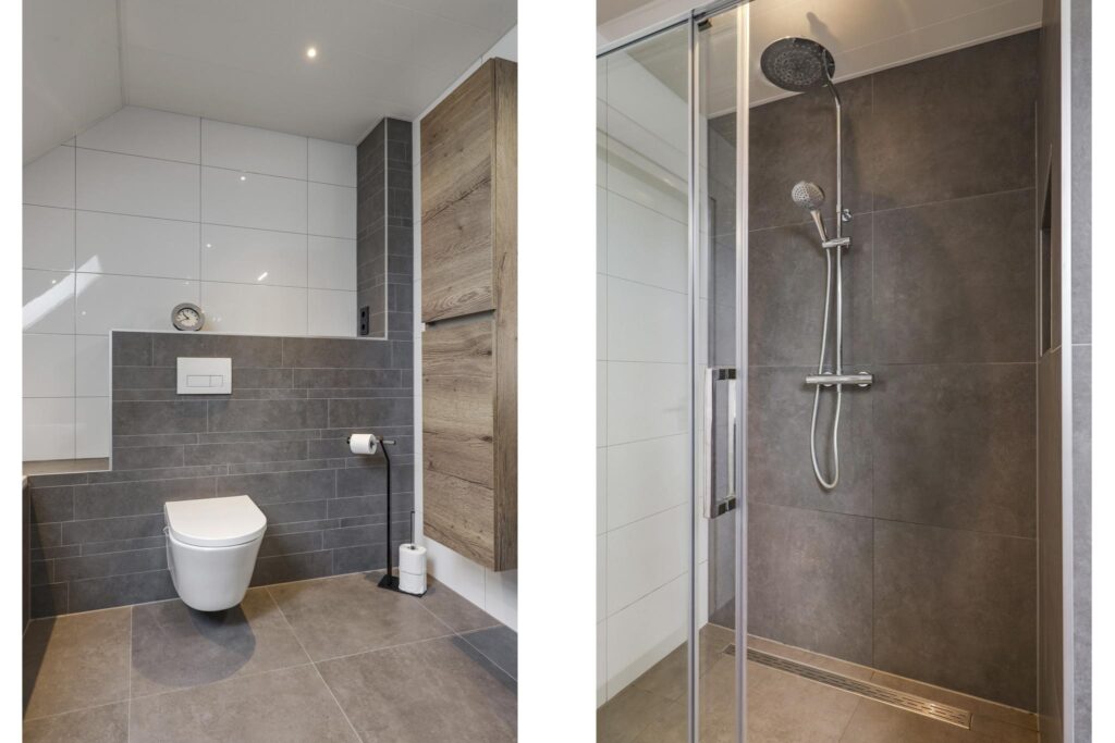 Tussen de slaapkamers in, is de badkamer gelegen. Deze is in 2021 volledig vernieuwd waardoor het aan alle wensen en comfort van de huidige tijd voldoet. Er is gekozen voor een brede inloopdouche, een volwaardig ligbad, een 2e (zwevend) toilet en een breed 2-persoons wastafelmeubel met ladekorven, een bijbehorende kolomkast en een spiegelkast. De inloopdouche is groter dan gemiddeld en voorzien van een rainshower, een drainafvoer en een extra handdouche. In de scheidingswand is een nisje ingetegeld waar je je shampoo en douchegel kwijt kunt. Groot formaat tegels (antraciet/wit) worden afgewisseld met houtaccenten. Ventileren is geen probleem met het aanwezige dakvenster. Bovendien is er mechanische ventilatie aanwezig.
