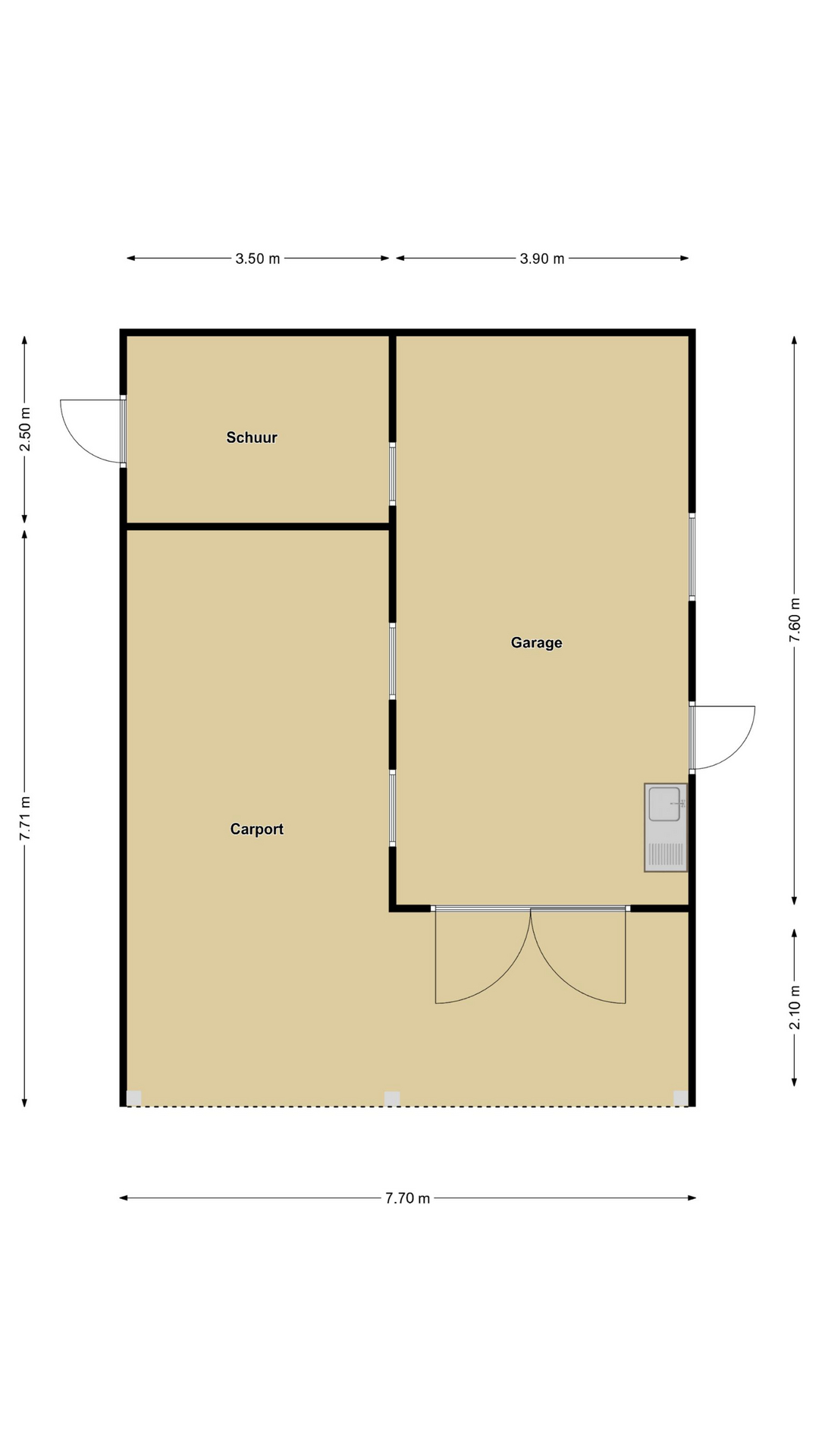 Aan de linkerzijde van de woning is een stenen garage aangebouwd. En dit is niet zomaar een garage. De garage is 7,6 meter lang en 3,9m breed en is daarmee langer en breder dan gemiddeld (30m2). Tevens is de garage in spouw gebouwd waardoor het ook potentie biedt voor andere bestemmingen, bijvoorbeeld als praktijk of salon aan huis. Ook omdat er al een keukenblokje met gootsteen v.v. warm- en koudwater aanwezig is. Dubbele deuren geven toegang tot de oprit.