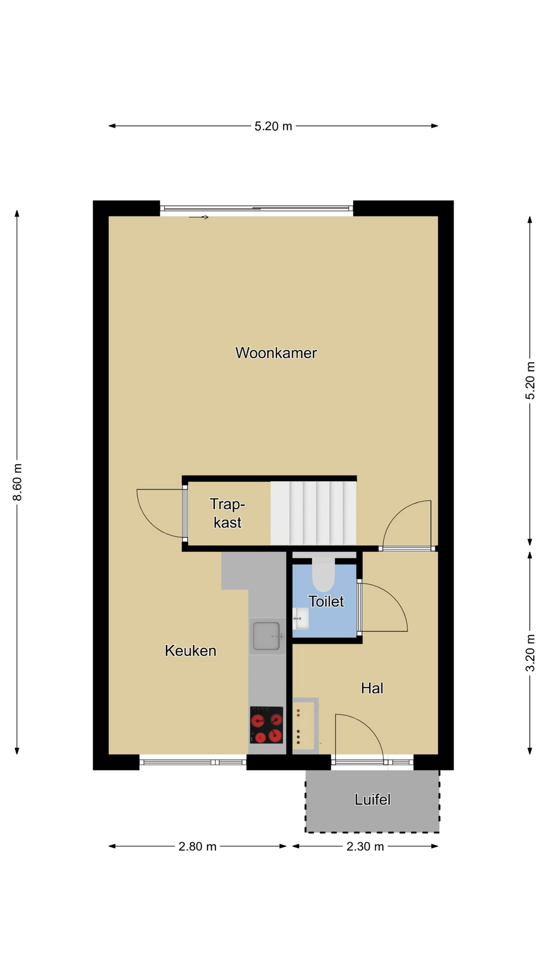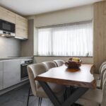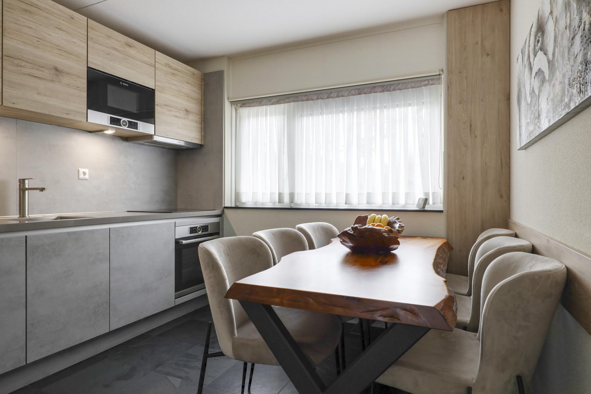 Halfopen keuken met inbouwapparatuur, eethoek en trapkast