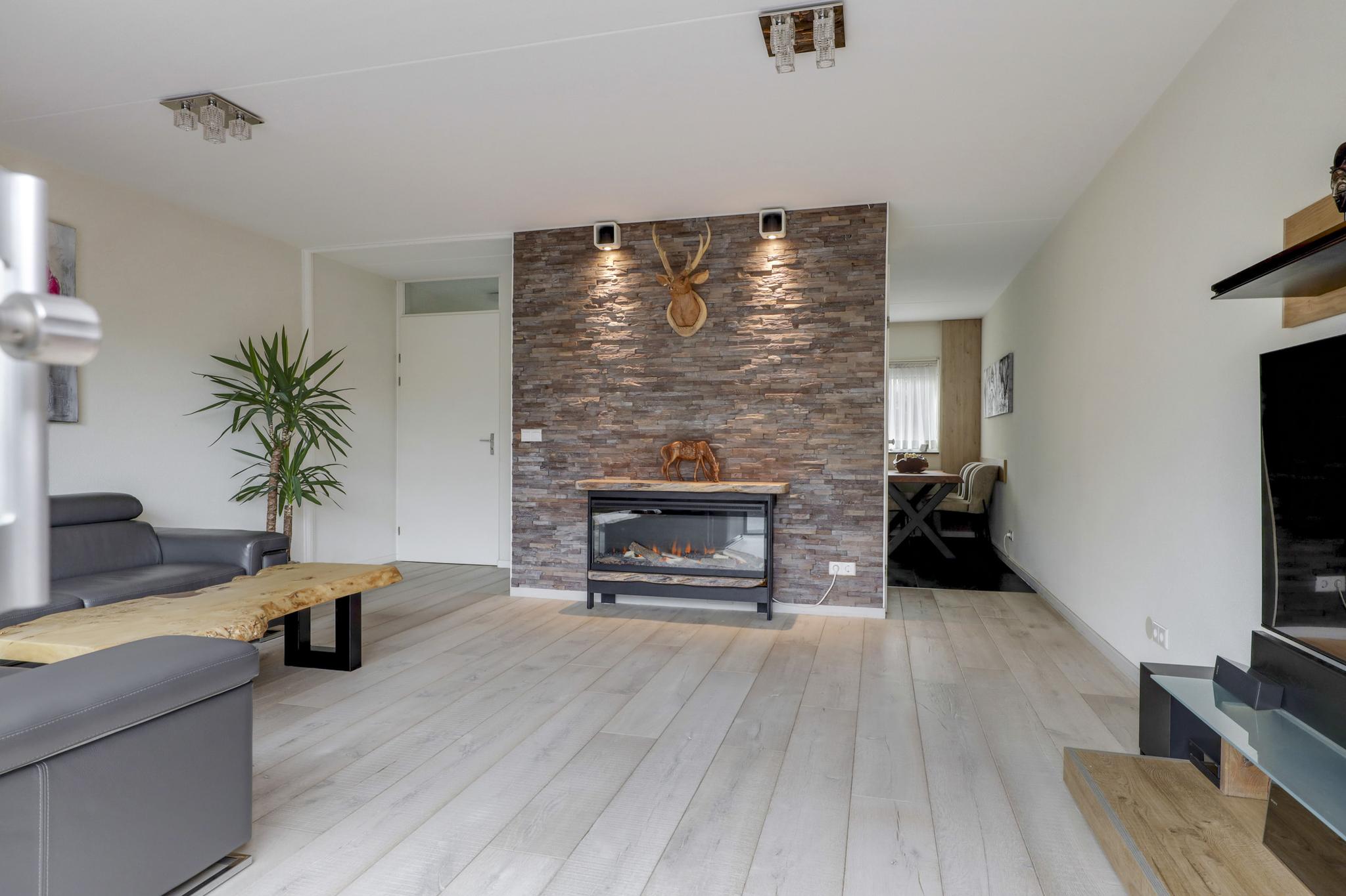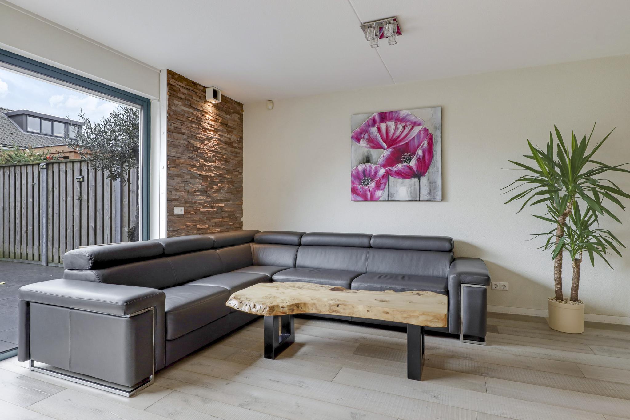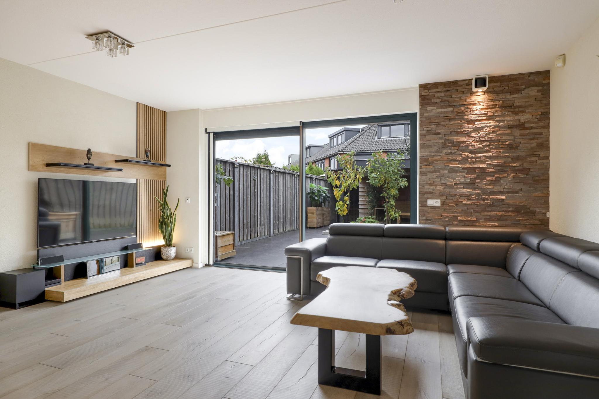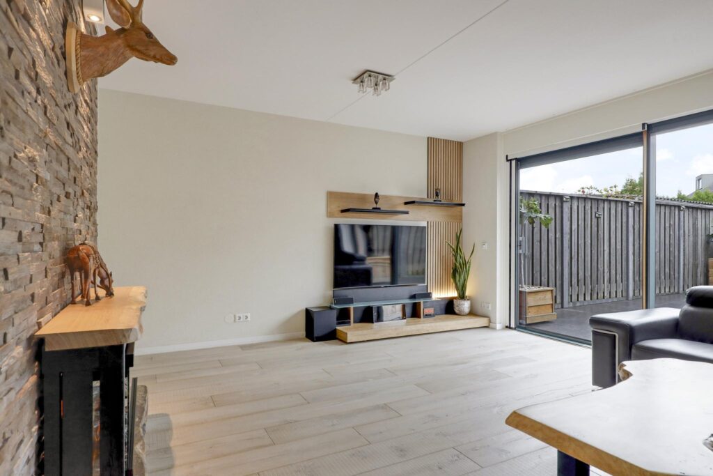 De woonkamer is aan de achterzijde gelegen en daarmee tuingericht. Er is een brede schuifpui met veel glas aanwezig waardoor je ook in de winter van de tuin kunt genieten. In de woonkamer is vloerverwarming aanwezig, welke is bekleed met een houten vloer en is afgewerkt met een hoge witte plint. De deur tussen de woonkamer en de hal is verplaatst waardoor de woonkamer een ruimtelijker gevoel heeft gekregen. Enkele wanden zijn stijlvol afgewerkt met steenstrips voor ene rustieke uitstraling. Voor het gemak zijn er op enkelhoogte nog extra contactpunten in de muur gefreesd.