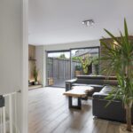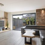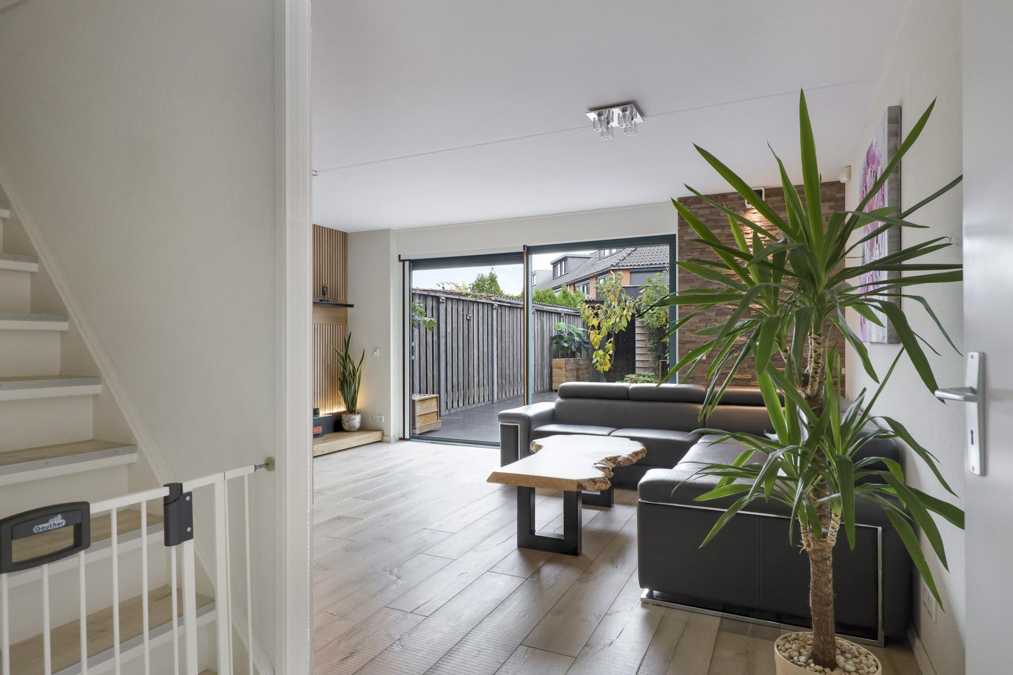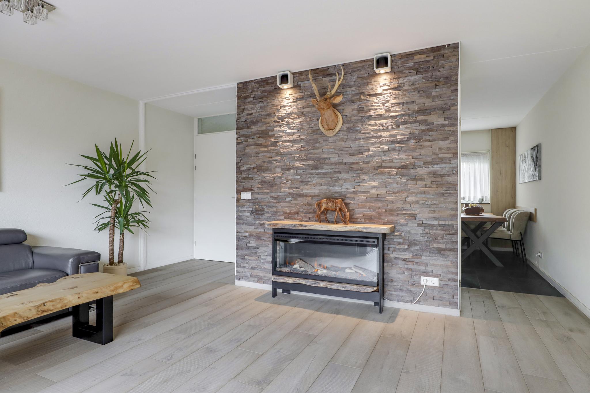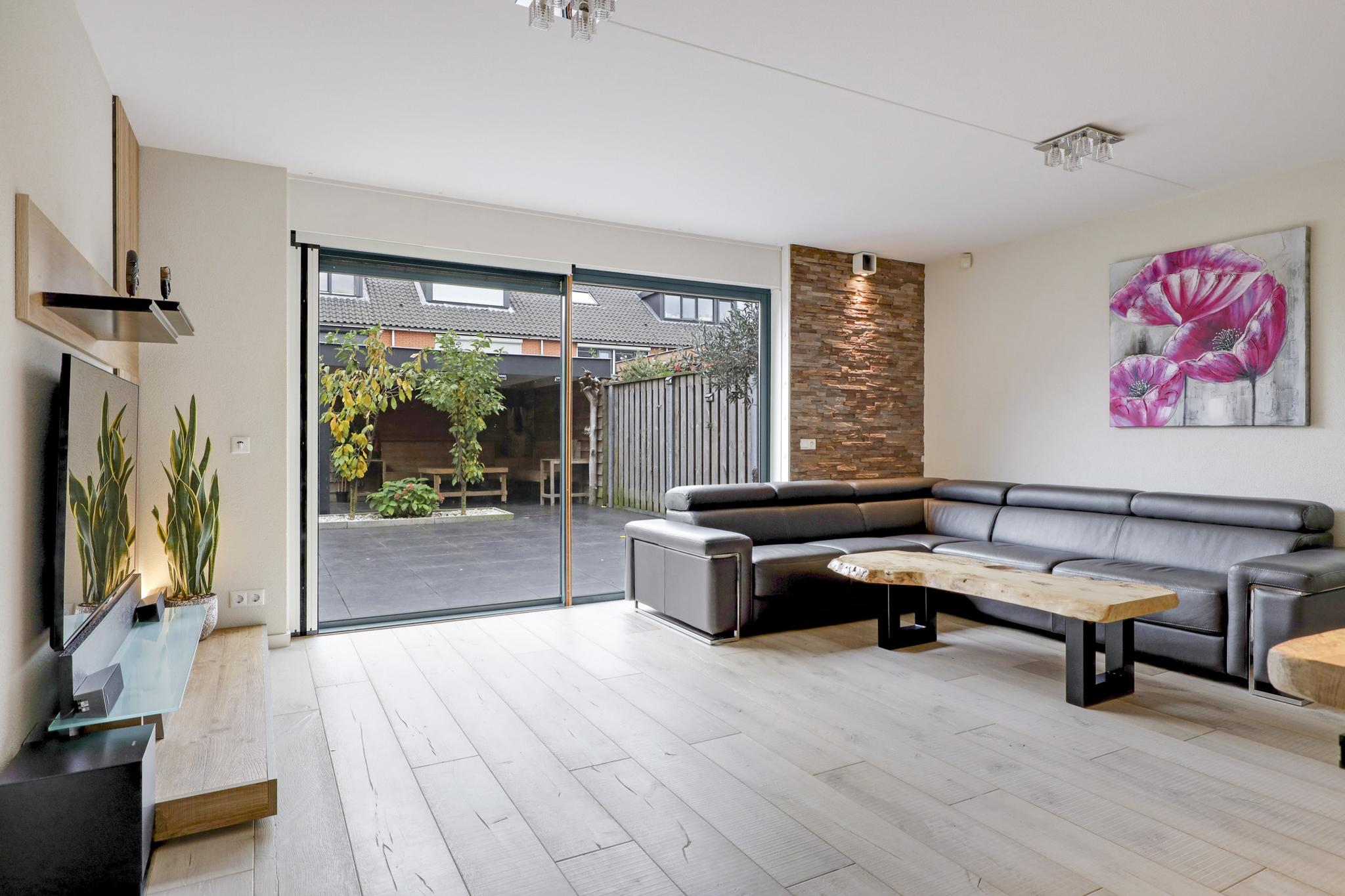 De woonkamer is aan de achterzijde gelegen en daarmee tuingericht. Er is een brede schuifpui met veel glas aanwezig waardoor je ook in de winter van de tuin kunt genieten. In de woonkamer is vloerverwarming aanwezig, welke is bekleed met een houten vloer en is afgewerkt met een hoge witte plint. De deur tussen de woonkamer en de hal is verplaatst waardoor de woonkamer een ruimtelijker gevoel heeft gekregen. Enkele wanden zijn stijlvol afgewerkt met steenstrips voor ene rustieke uitstraling. Voor het gemak zijn er op enkelhoogte nog extra contactpunten in de muur gefreesd.