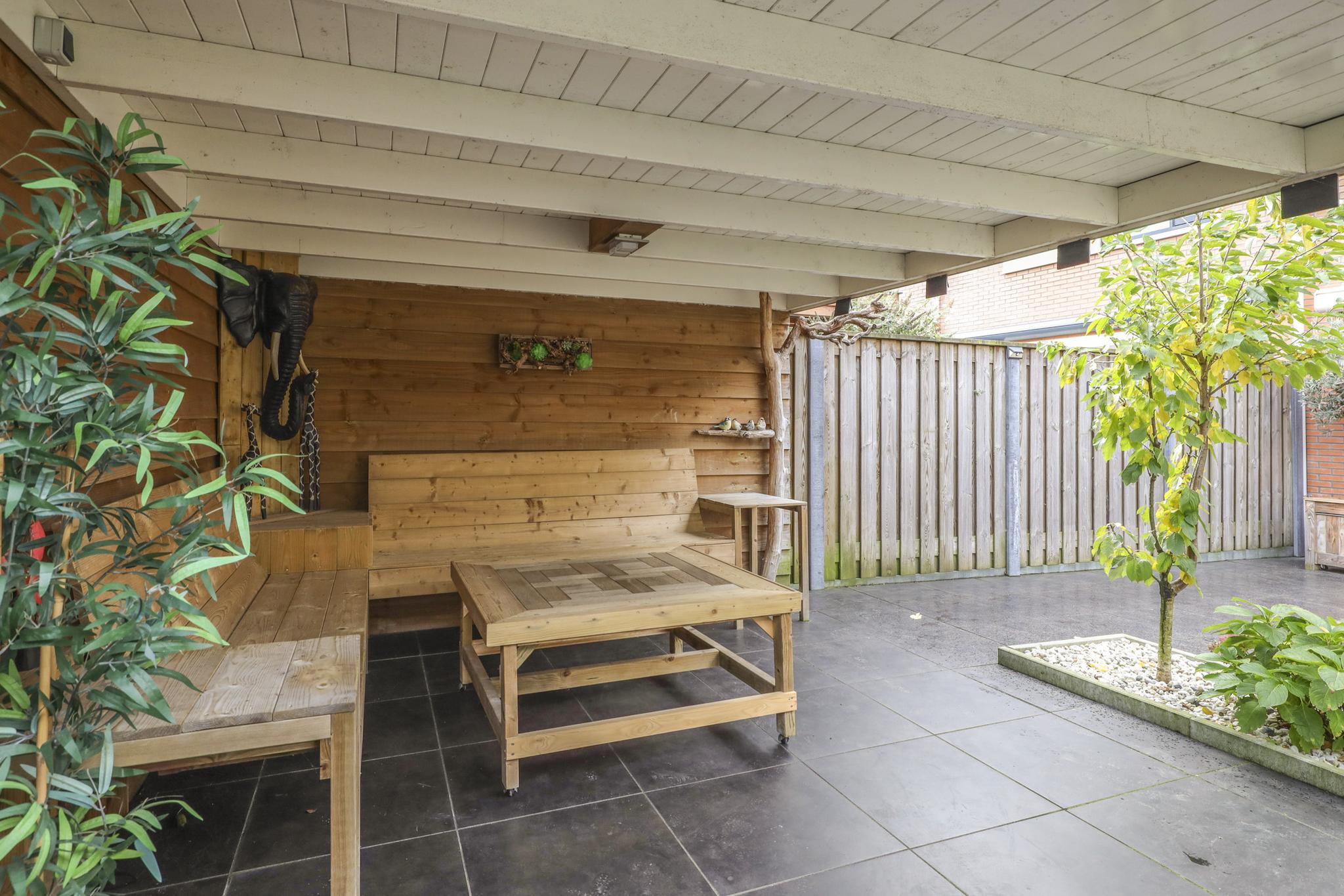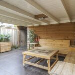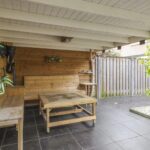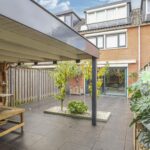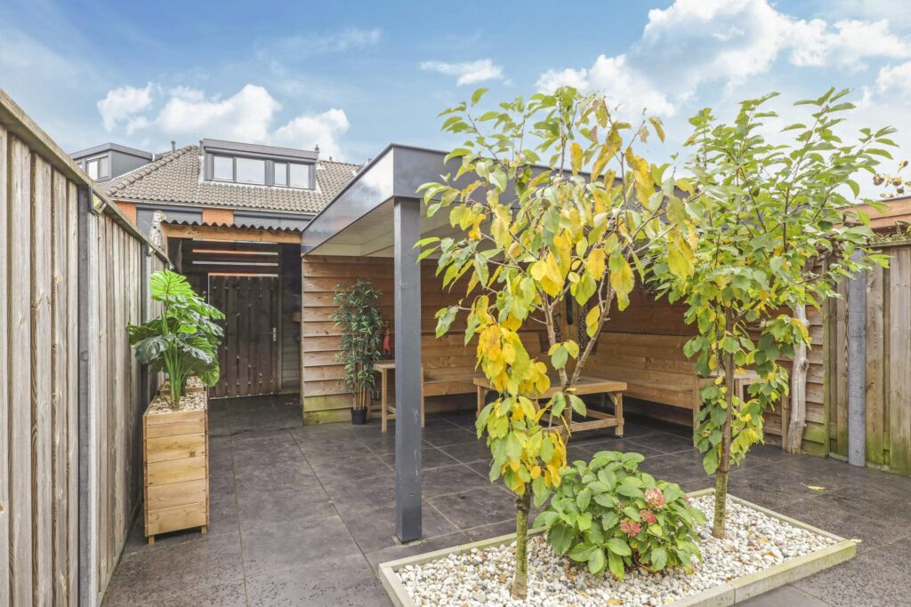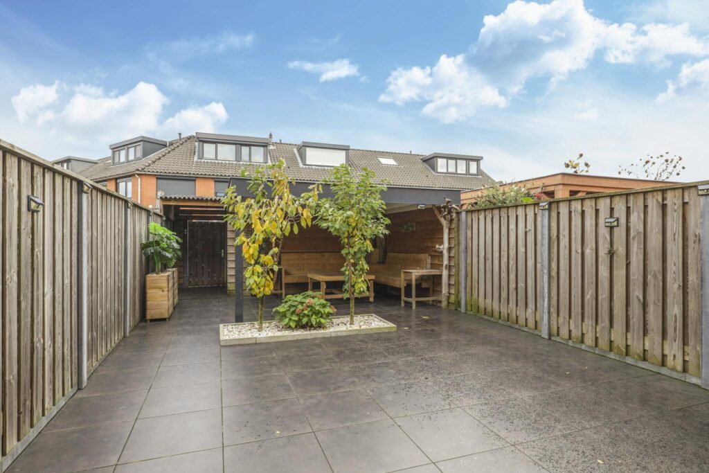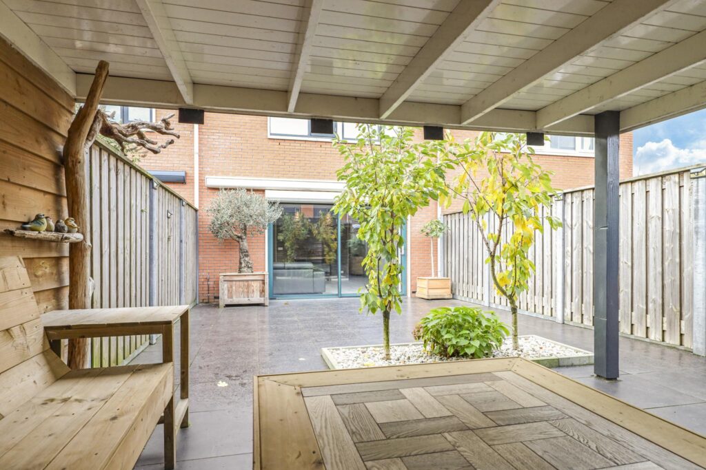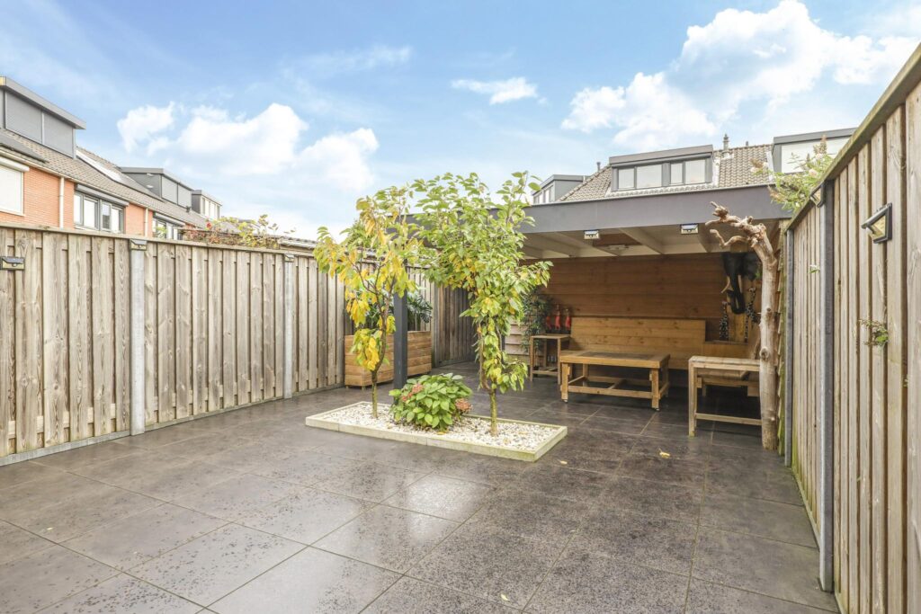 Bij een verzorgde woning hoort ook een verzorgde achtertuin. Deze is onderhoudsvriendelijk aangelegd met een strakke uitstraling. Rechte lijnen zorgen voor rust en ruimte. Keramische tegels van 60×60 zijn met cement ingevoegd waardoor onkruid geen kans krijgt. De schuttingen zijn met robuuste betonpalen geplaatst. Voor de schuifpui is een drain geplaatst voor overtollig regenwater. Achter in de tuin is een overdekt terras (veranda) gebouwd waar je het hele jaar door heerlijk kunt zitten. Er zijn extra elektrapunten aanwezig. Achter de veranda staat nog een houten berging (2,2m x 3m). Hier kun je de fietsen stallen en/of een klushoek maken. Uiteraard is er een achterom aanwezig. Doordat de tuin maar liefst 12 meter diep is, blijft er ook nog een mooi zonneterras over.