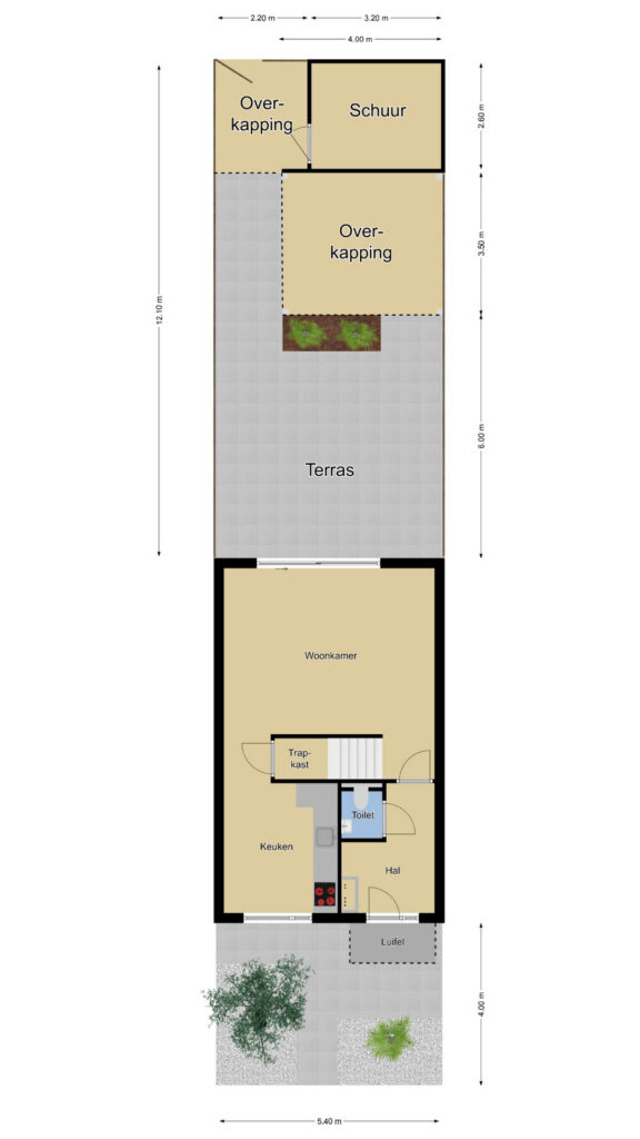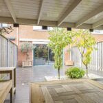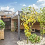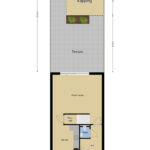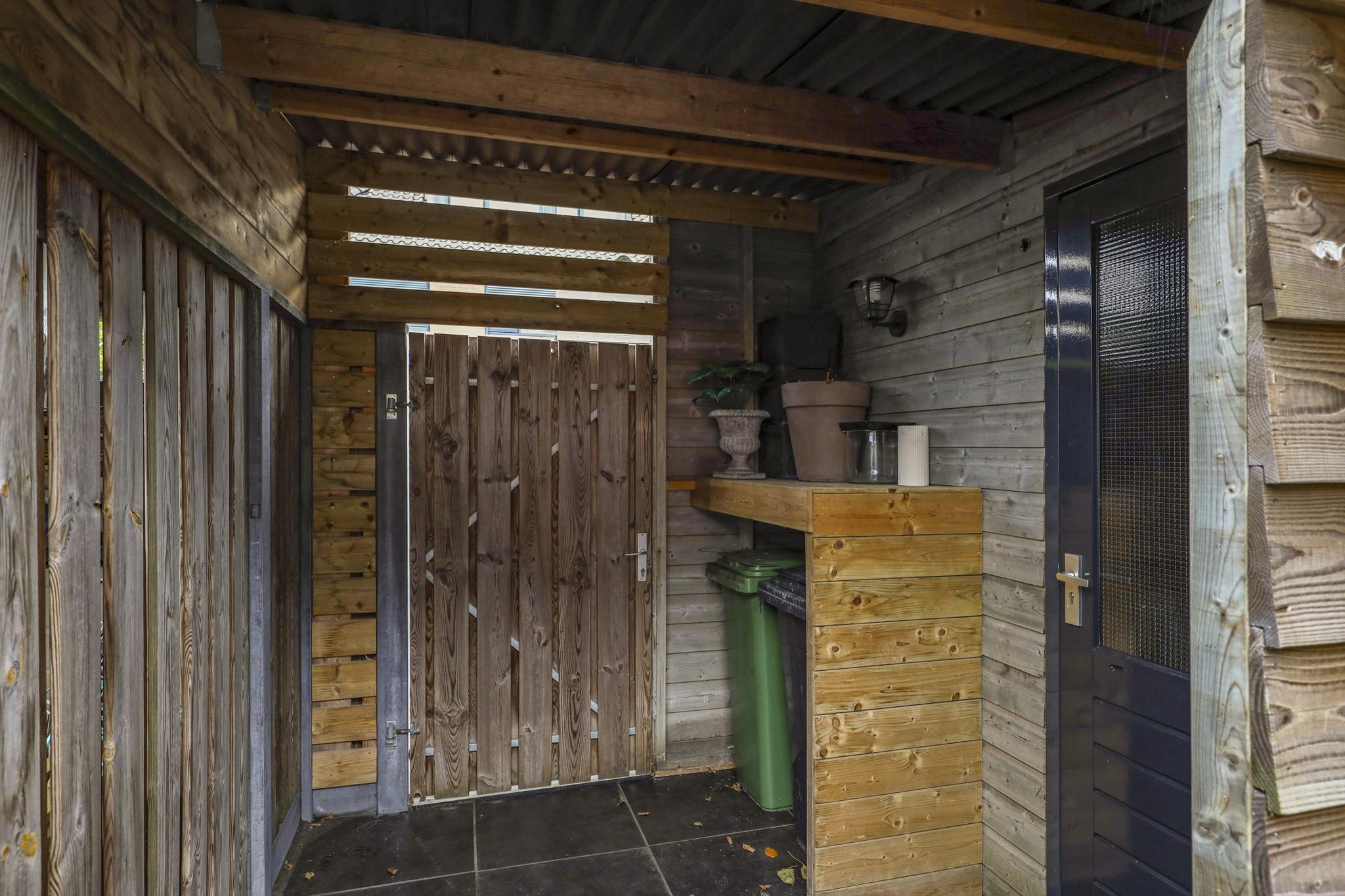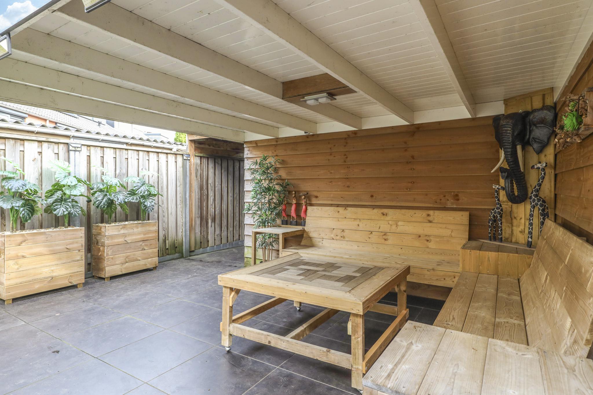 Bij een verzorgde woning hoort ook een verzorgde achtertuin. Deze is onderhoudsvriendelijk aangelegd met een strakke uitstraling. Rechte lijnen zorgen voor rust en ruimte. Keramische tegels van 60×60 zijn met cement ingevoegd waardoor onkruid geen kans krijgt. De schuttingen zijn met robuuste betonpalen geplaatst. Voor de schuifpui is een drain geplaatst voor overtollig regenwater. Achter in de tuin is een overdekt terras (veranda) gebouwd waar je het hele jaar door heerlijk kunt zitten. Er zijn extra elektrapunten aanwezig. Achter de veranda staat nog een houten berging (2,2m x 3m). Hier kun je de fietsen stallen en/of een klushoek maken. Uiteraard is er een achterom aanwezig. Doordat de tuin maar liefst 12 meter diep is, blijft er ook nog een mooi zonneterras over.