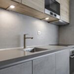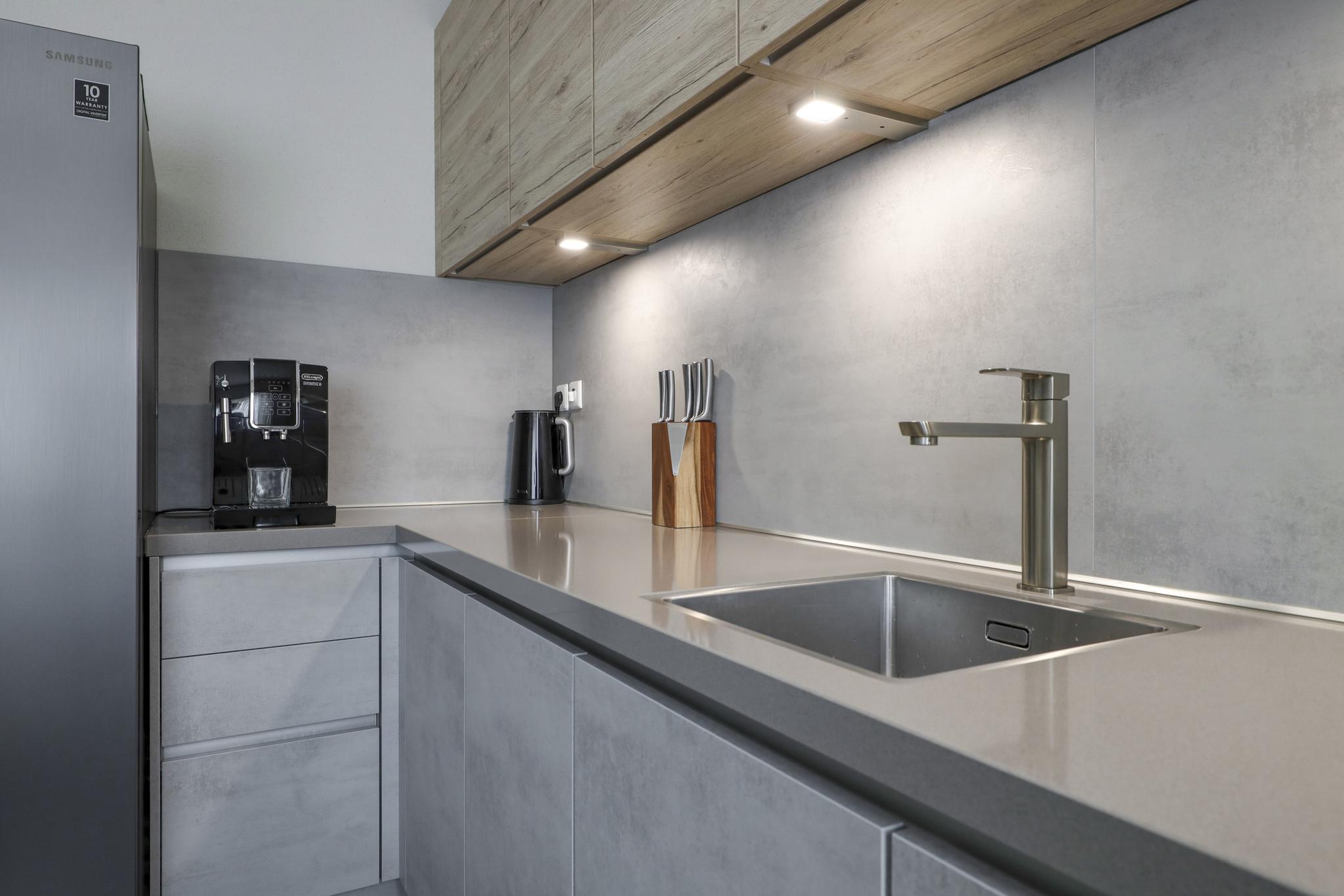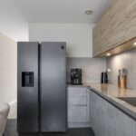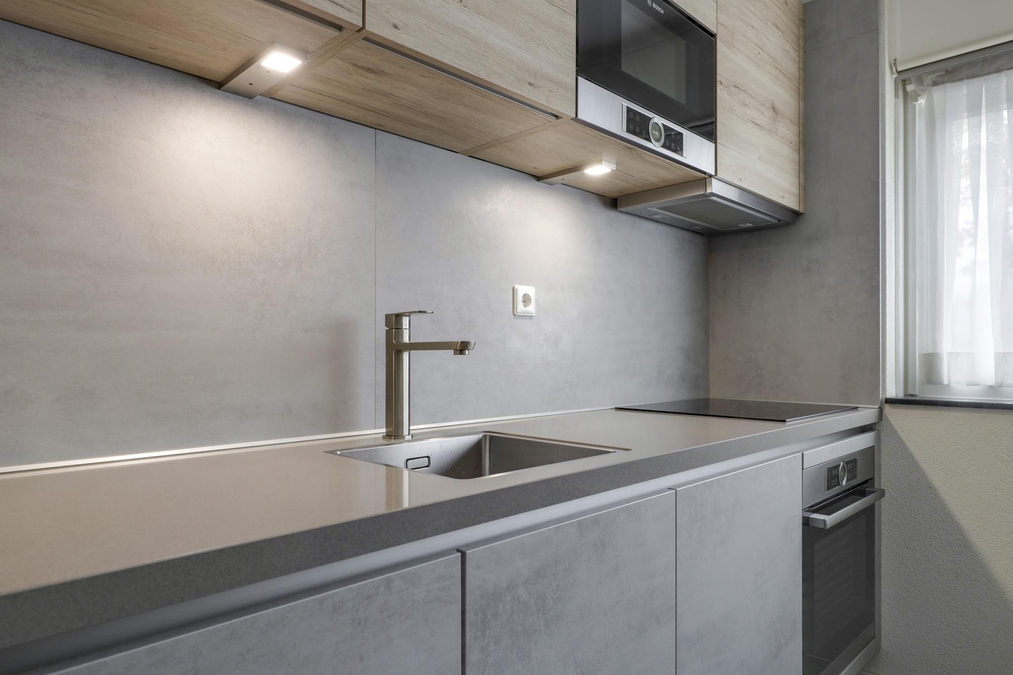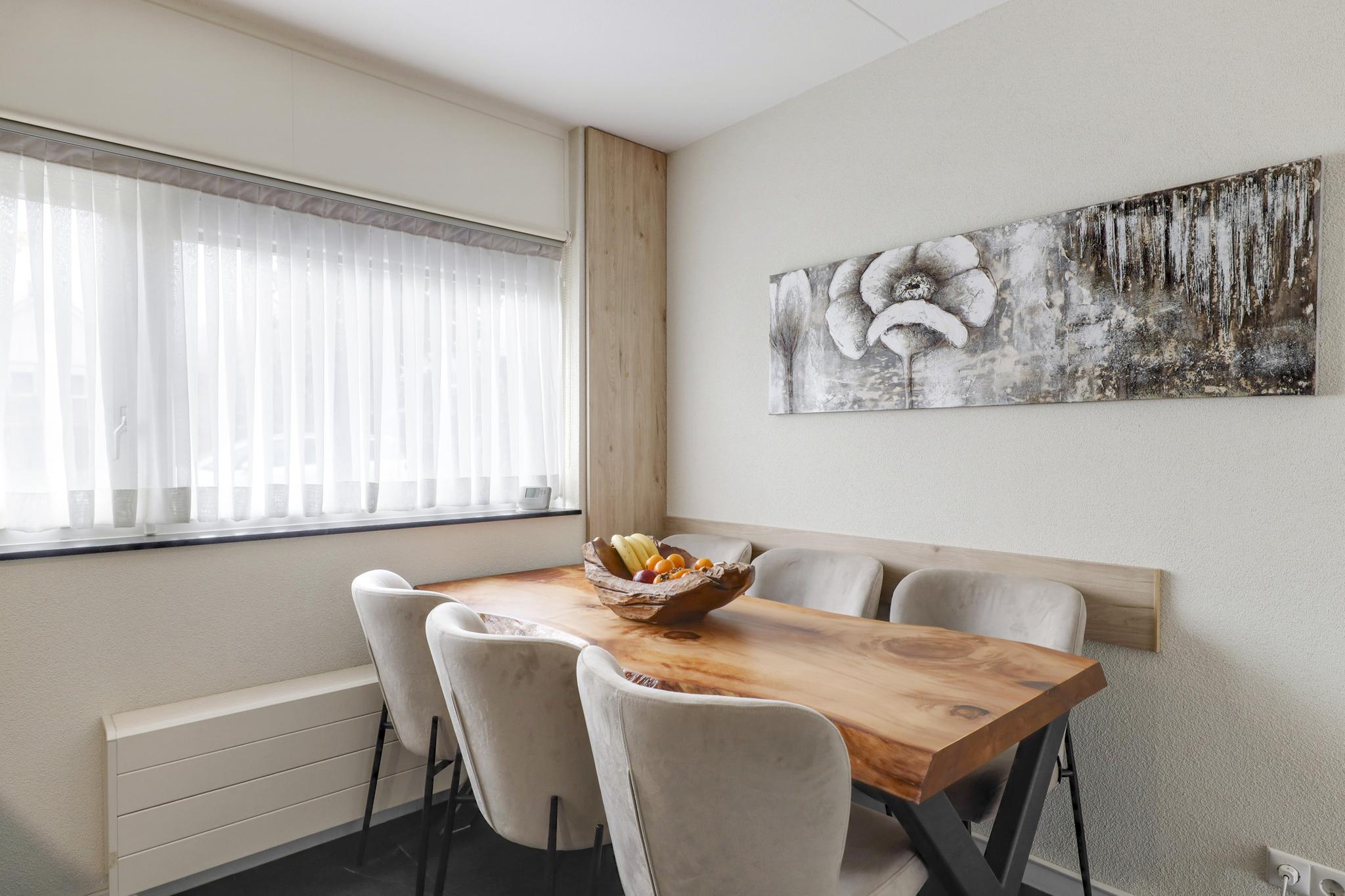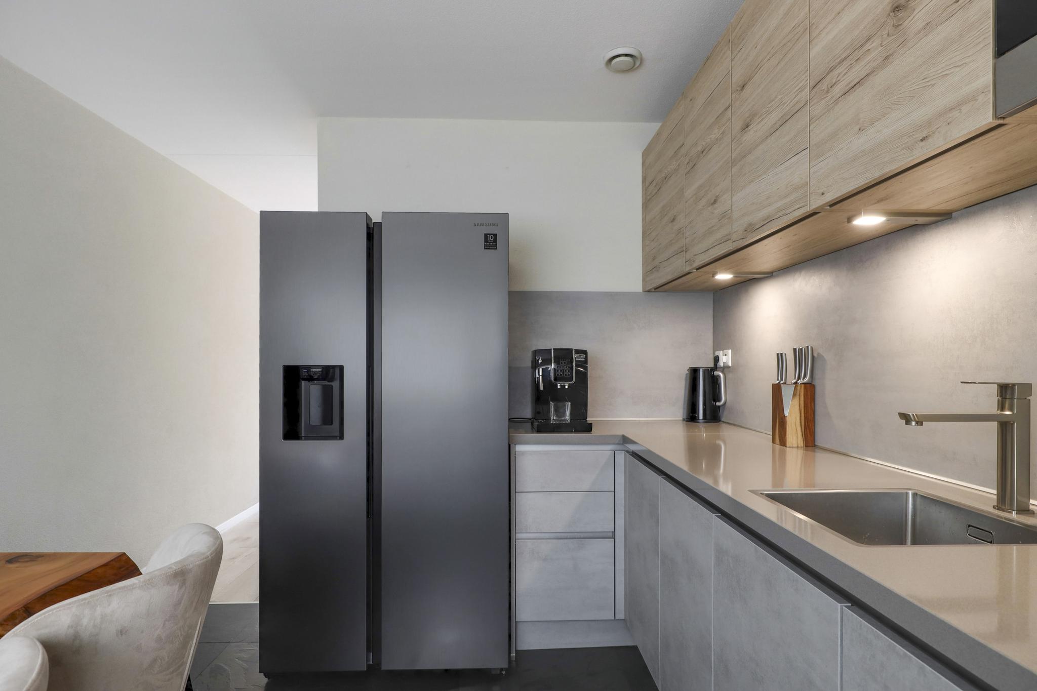 De keuken vinden we terug aan de voorzijde waarbij het een mooi, vrij uitzicht heeft op de straat en groenvoorziening tegenover de woning. Dus geen inkijk van woningen die er mogelijk tegenover zouden kunnen staan. De keuken is modern ingericht met een recht keukenblok en bovenkasten voor een maximaal veel opbergruimte. Onder de bovenkasten zijn inbouwspots geplaatst. De inbouwapparatuur bestaat uit een inductiekookplaat, een afzuiger, een magnetron, een oven en een vaatwasser. De Amerikaanse koel/vriescombinatie wordt ter overname aangeboden. In de keuken is plaats voor een eettafel. Tussen de keuken en woonkamer is een trapkast aanwezig.
