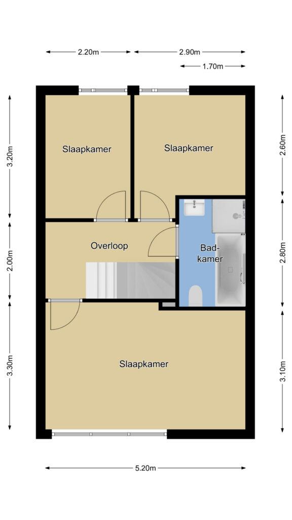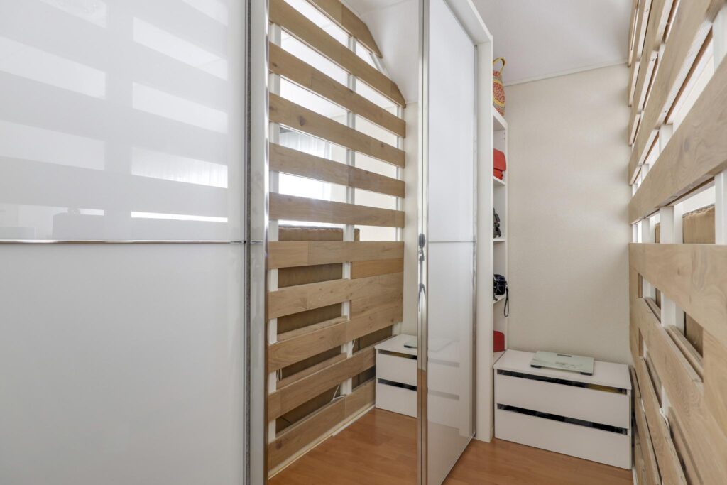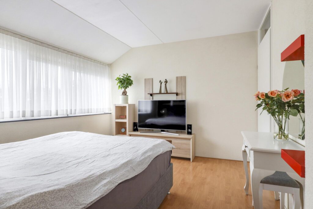 Via de rechte trapopgang in de hal komen we op de 1e verdieping terecht. Opvallend is dat de trapopgang met hout is belegd waardoor deze een luxe uitstraling heeft. Hier biedt de overloop toegang tot 3 slaapkamers en de badkamer. De grootste slaapkamer is over de volle breedte van de woning gesitueerd waardoor dit een ware masterbedroom is. Een leuk detail is hier de scheidingwand waardoor er een ware walk-in-closet is ontstaan. Aan de achterzijde van de woning zijn nog 2 kamers gelegen. Prettig is dat de kamers zijn voorzien van horren om insecten te weren en rolluiken om de kamer geheel te verduisteren. De slaapkamers en overloop zijn voorzien van een eenduidige, drempelloze laminaatvloer.