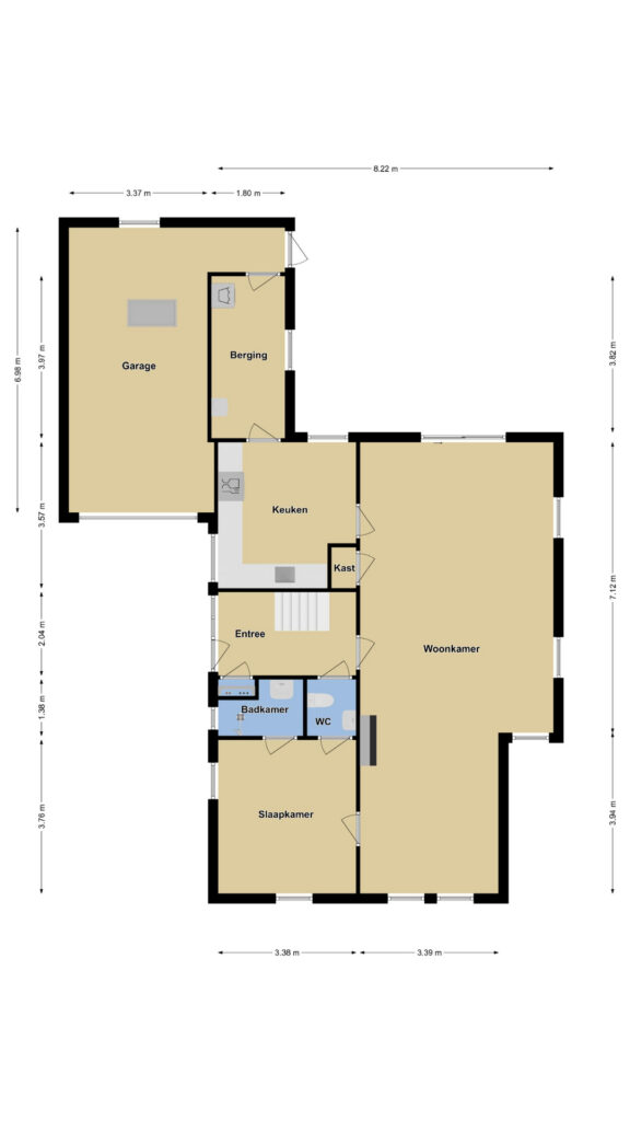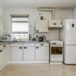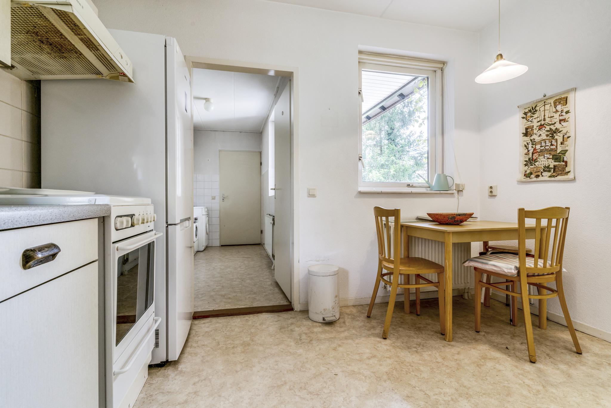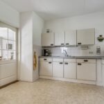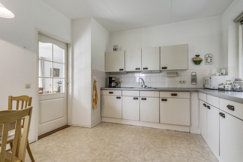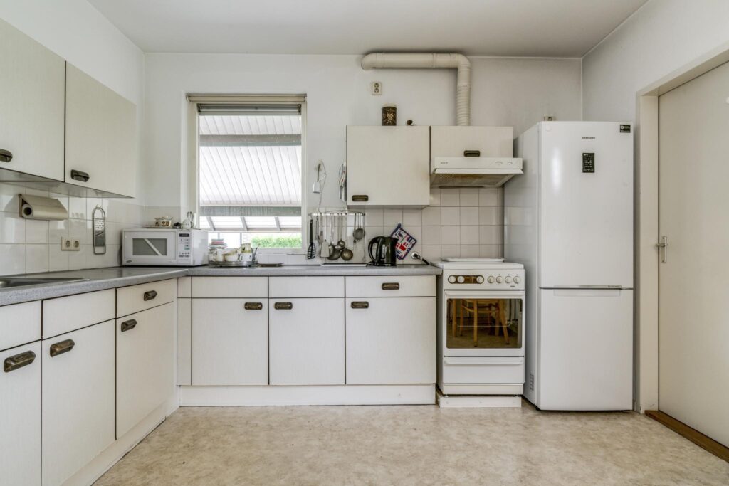 De keuken grenst direct aan de woonkamer en is afsluitbaar middels een tussendeur. De indeling is ruim waarbij de keuken in een hoekopstelling is geplaatst. Het betreft een verouderd keukenblok met losse keukenapparatuur. In dat opzicht is het geen kapitaalvernietiging wanneer je hier een geheel nieuwe keuken plaatst. En zoals al eerder verteld en ook verbeeld is in de art-impressions biedt de keuken verschillende opties voor speelse keukenopstellingen. Altijd al een eilandkeuken gewild? Dan kun je hier helemaal los gaan om jou droomkeuken uit te zoeken. De scheidingswand met de woonkamer is (waarschijnlijk) geen draagmuur vanwege de kanaalplaatvloeren.