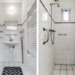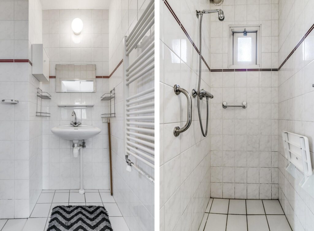 Vanuit deze slaapkamer is er een doorloop naar een en-suite badkamer. Deze badkamer is niet bijzonder groot, maar wel erg praktisch. Het bestaat uit een inloopdouche en een wastafel. Een raampje zorgt voor daglicht en ventilatiemogelijkheid. Ook is het separate toilet vanuit de slaapkamer te bereiken. Kortom, ben je gebonden aan de begane grond, dan kun je hier prima uit de voeten.