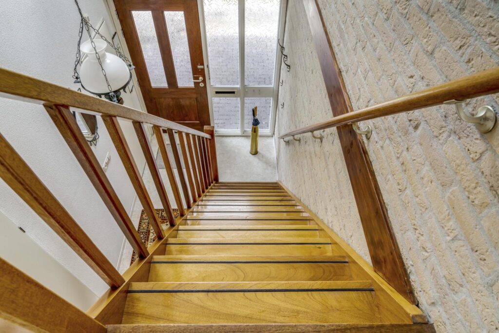 Graag willen we ook de hal/entree verder uitlichten. Via de voordeur (onder de carport) kom je binnen in een ruimtelijke hal met vide naar de 1e verdieping. Onder de hardhouten trapopgang is er ruimte voor een kapstok en bijvoorbeeld een kinderwagen. Waar goed over nagedacht is, is het dakvenster die hoog in het schuine dakvlak is geplaatst. Dit zorgt voor veel daglicht, zowel in de hal als op de overloop.