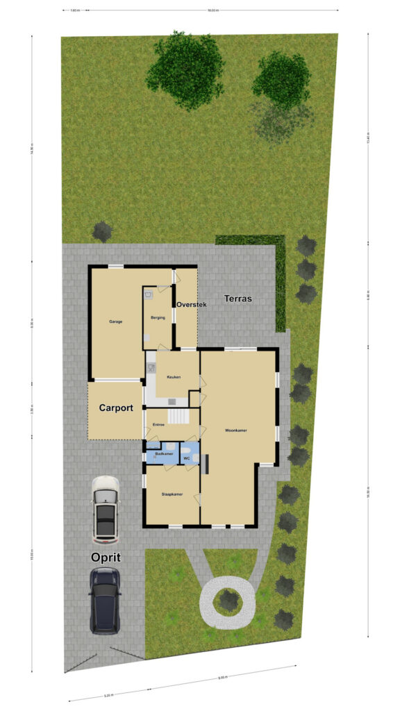 Het perceel is maar liefst 661m2 groot en dan kan het niet anders dan dat er veel tuin bij de woning is gelegen. De woning staat op een mooie afstand van de straat waarbij de groene voortuin voor een natuurlijke buffer zorgt. Aan de linkerzijde van het perceel is de oprit gelegen. Deze is meer dan 5 meter breed en loopt door tot onder de carport (bijna 20 meter lang). Twee grote auto’s passen gemakkelijk op de oprit maar, afhankelijk van het formaat auto’s, zou je er ook 4 op eigen terrein kunnen parkeren (2 naast elkaar).