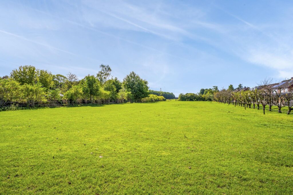 De meeste tuin is aan de achterzijde gelegen. Daar vind je de meeste vrijheid en privacy aangezien de achtertuin aan een weiland grenst. Hier lopen sporadisch enkele paarden van de manege die verderop in de straat is gevestigd. Een landelijker en vrijer uitzicht midden in het dorp ga je niet snel vinden.