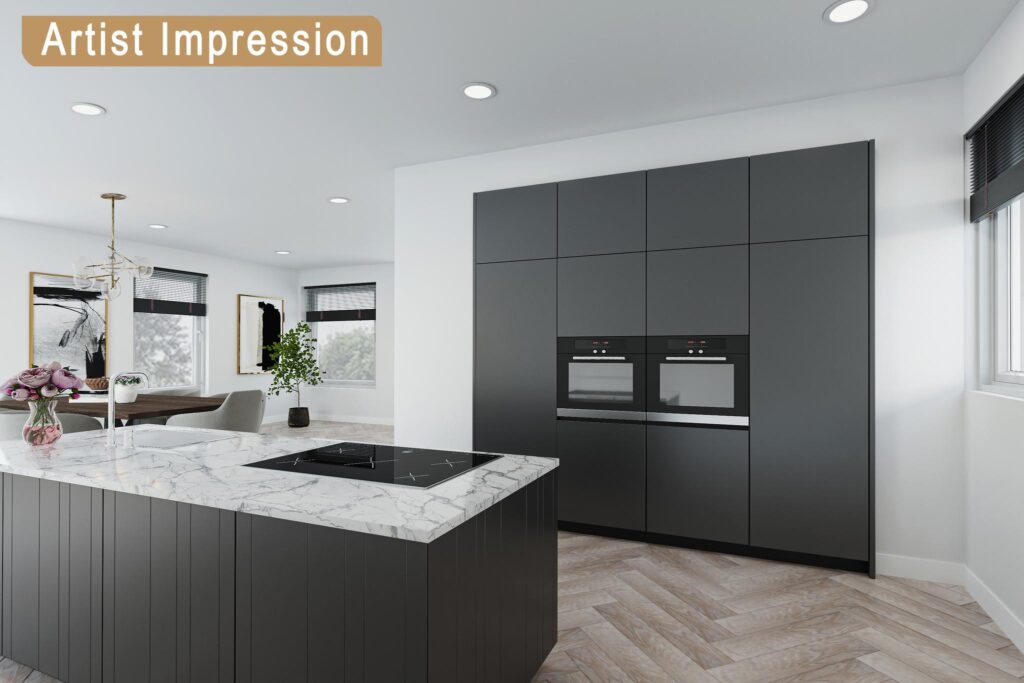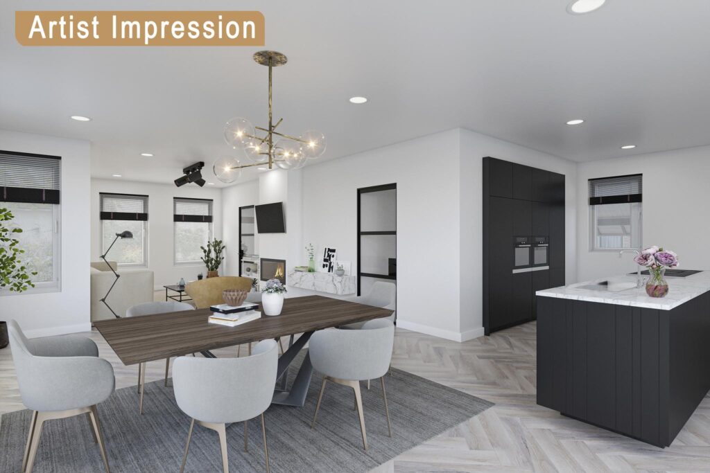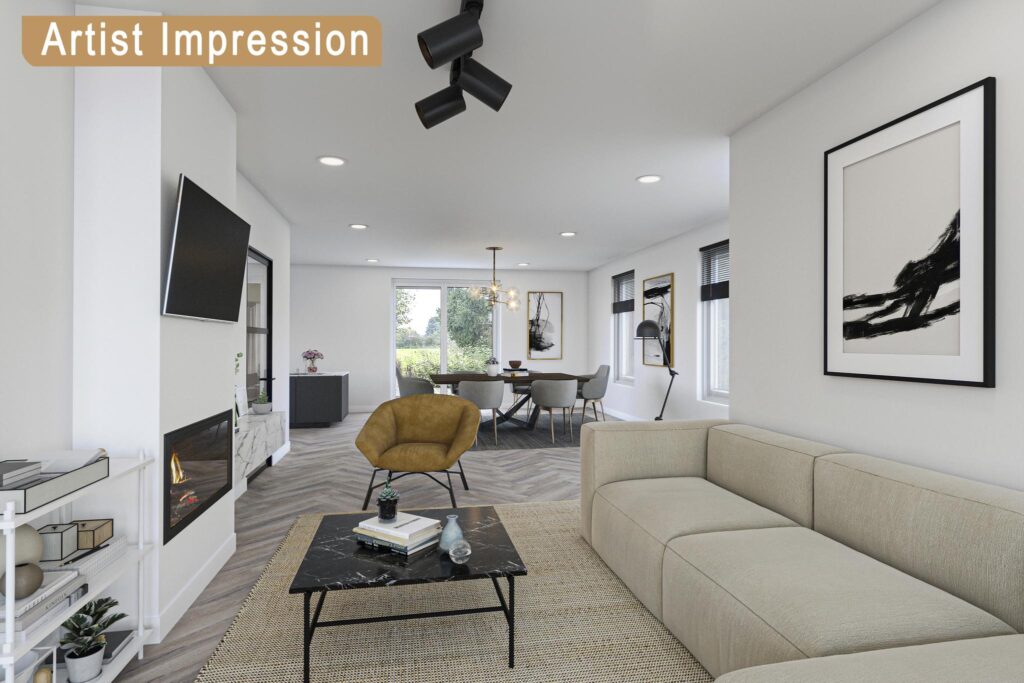 Het aanzicht van de woning doet misschien anders vermoeden, maar deze woning is met ca. 645m3 inhoud groter dan je denkt. Dat wordt ook meteen duidelijk bij binnenkomst in de hal waar een hoge vide voor een ruimtelijke beleving zorgt. De hele indeling op zowel de begane grond als de 1e verdieping laat alleen maar grote leefruimtes zien. Grote raampartijen met een prettige lichtinval versterken dit ruimtelijke gevoel. Stel dat je de keuken zou doorbreken naar de woonkamer, dan ontstaat er een ‘balzaal’ waardoor je ineens de mogelijkheid hebt om een eilandopstelling in de keuken te plaatsen (zie ook art-impressions).
