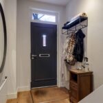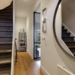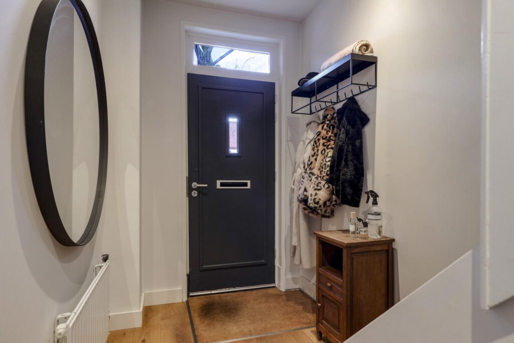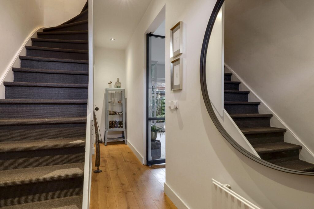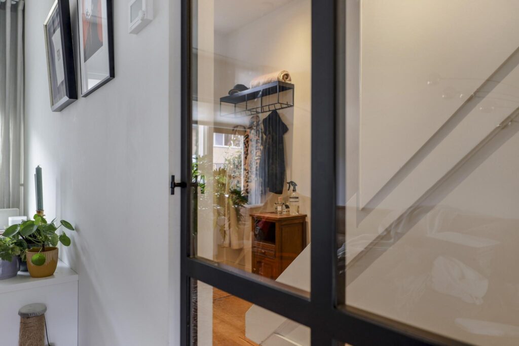 Het is prettig binnenkomen bij deze woning. De entree heeft vanaf de buitenzijde een karakteristieke uitstraling waarbij wel de voordeurpui is vervangen door o.a. een degelijke voordeur met SKG-hang-en sluitwerk. Eénmaal binnen wacht een verrassend ruime hal van bijna 6 meter lang. Hier vind je onder meer het toilet en een praktische (verdiepte) kelderkast onder de trapopgang. Het toilet valt op vanwege de afwerking met beton ciré. En wat je meteen zal opvallen is de zwartstalen taatsdeur tussen de hal en woonkamer die beide kanten opdraait.