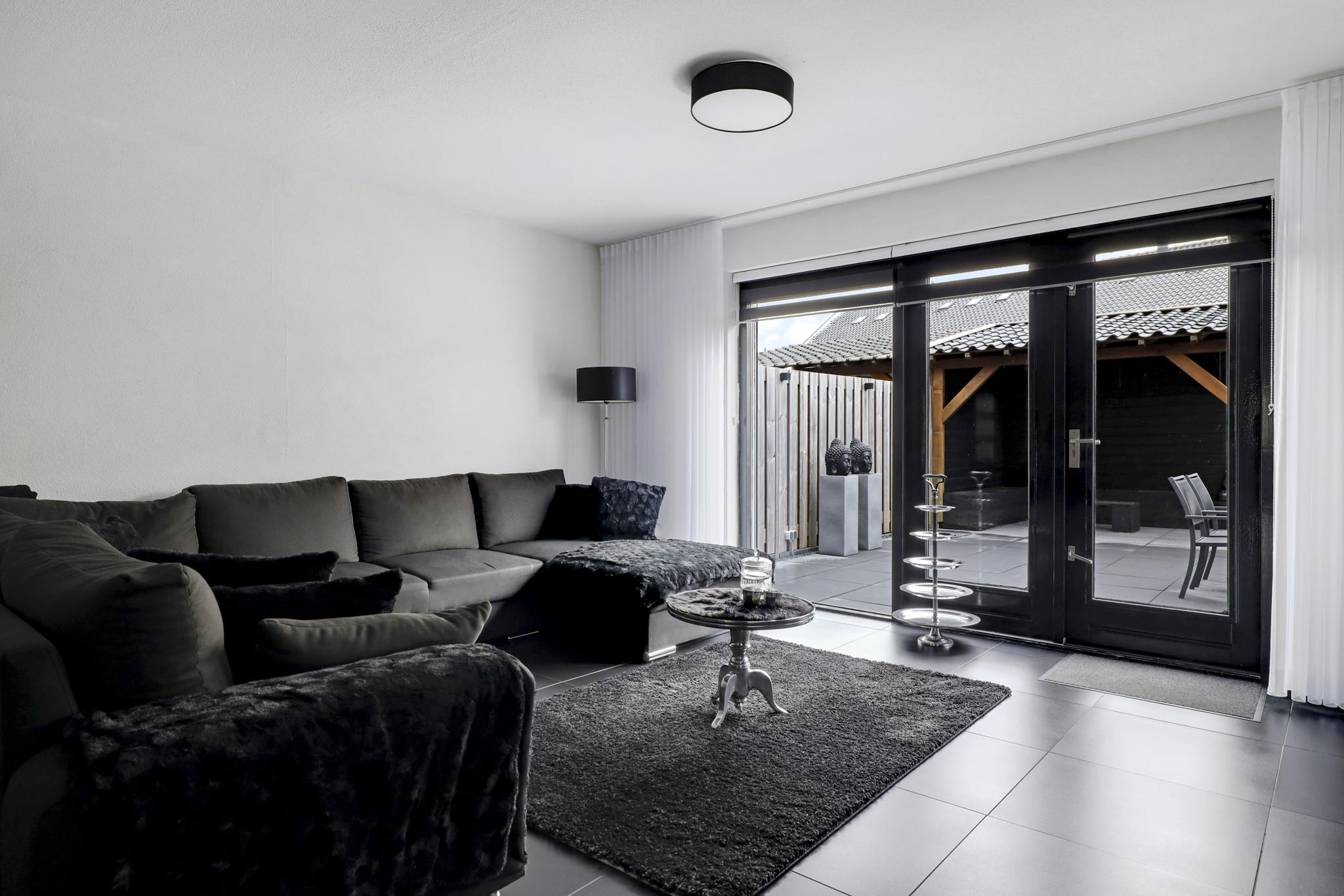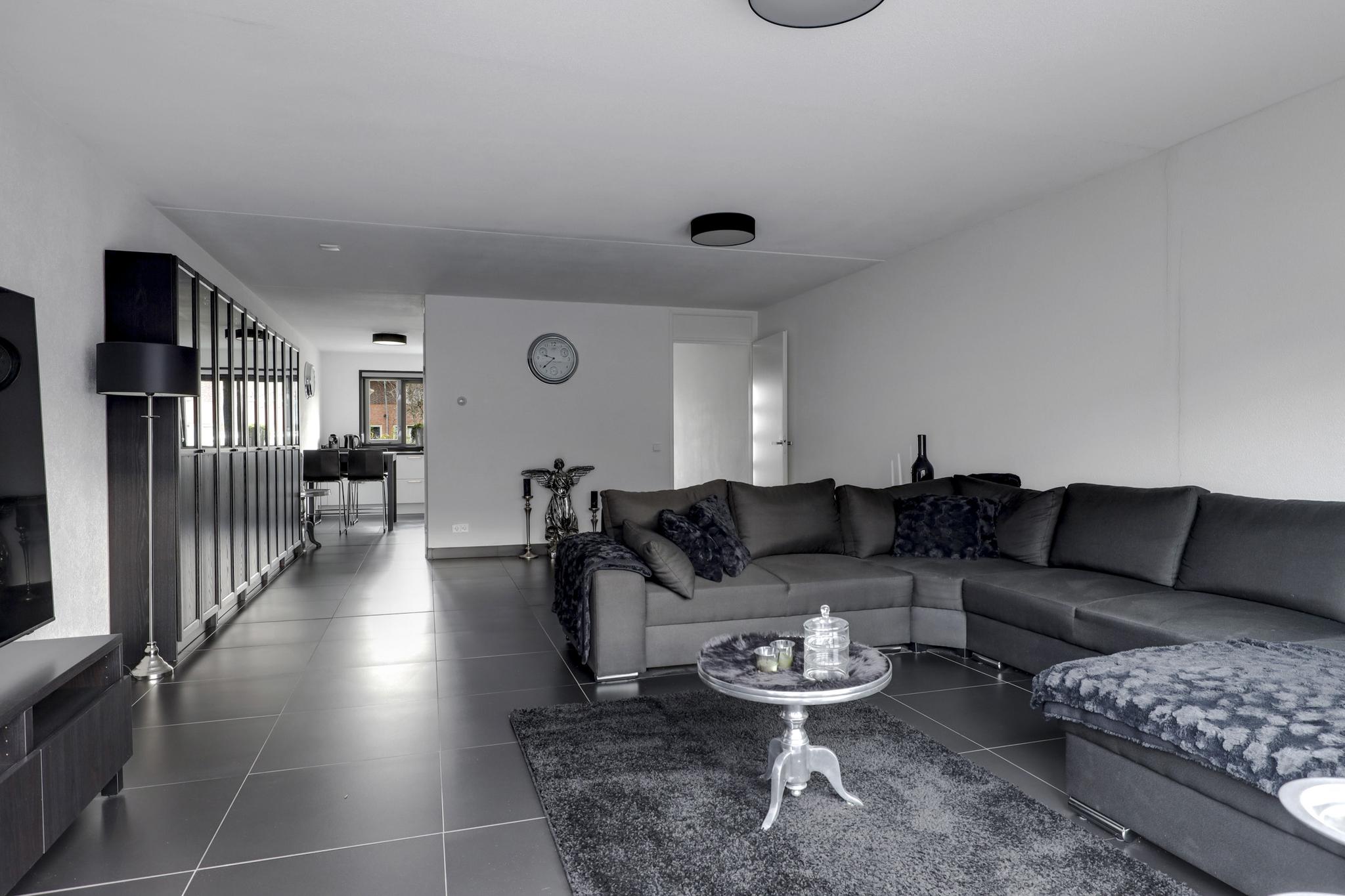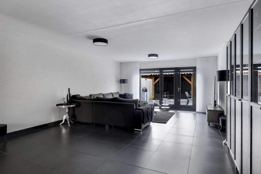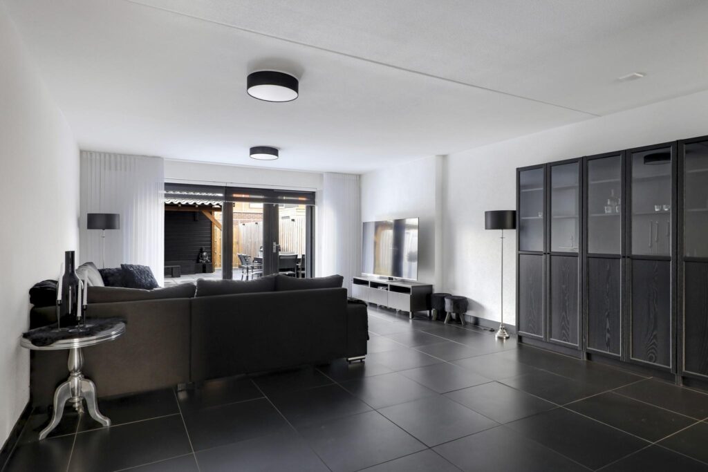 De woonkamer is aan de achterzijde van de woning gelegen. Een groot pluspunt is de uitbouw welke is gerealiseerd. Hierdoor is de woonkamer aanzienlijk groter geworden waardoor er een mogelijkheid is ontstaan om hier ook een grote eettafel te plaatsen. Op de vloer liggen grote zwarte plavuizen welke in de uitbouw zijn voorzien van vloerverwarming. Een grote glaspui biedt een fijn zicht op de tuin waarbij de openslaande deuren de woonkamer en tuin in de zomerdag bij elkaar betrekken.