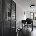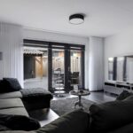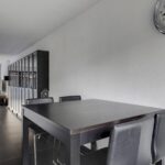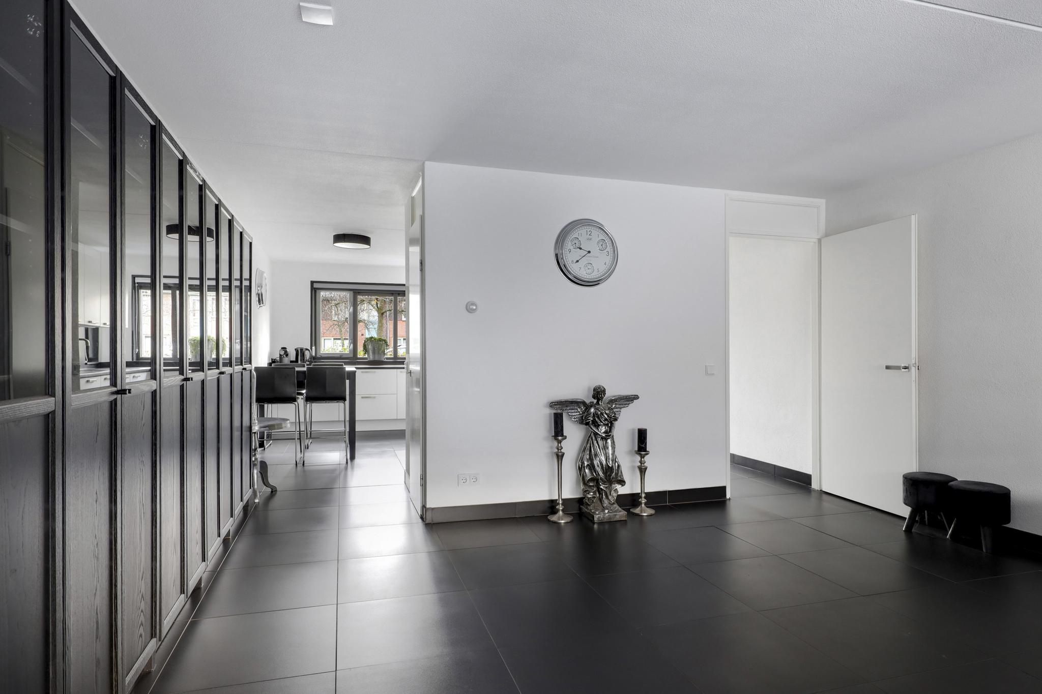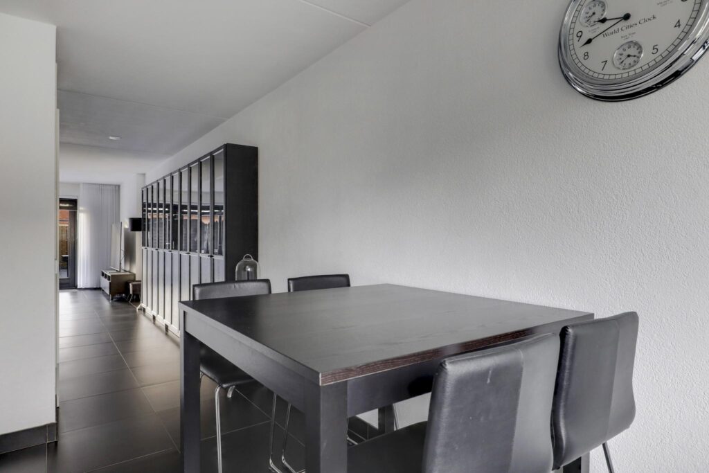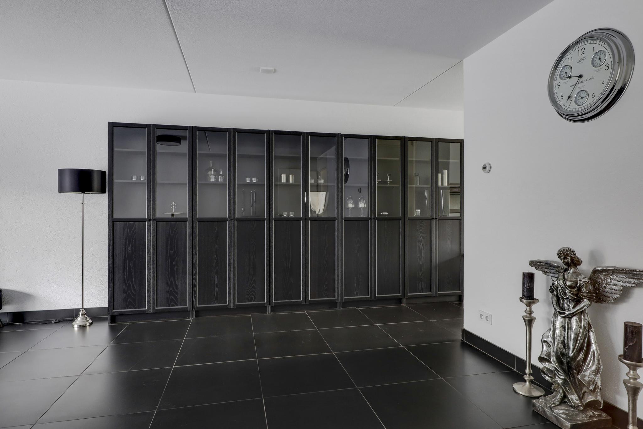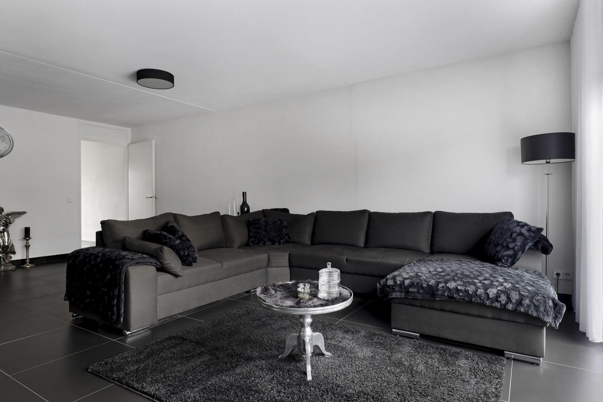 De woonkamer is aan de achterzijde van de woning gelegen. Een groot pluspunt is de uitbouw welke is gerealiseerd. Hierdoor is de woonkamer aanzienlijk groter geworden waardoor er een mogelijkheid is ontstaan om hier ook een grote eettafel te plaatsen. Op de vloer liggen grote zwarte plavuizen welke in de uitbouw zijn voorzien van vloerverwarming. Een grote glaspui biedt een fijn zicht op de tuin waarbij de openslaande deuren de woonkamer en tuin in de zomerdag bij elkaar betrekken.