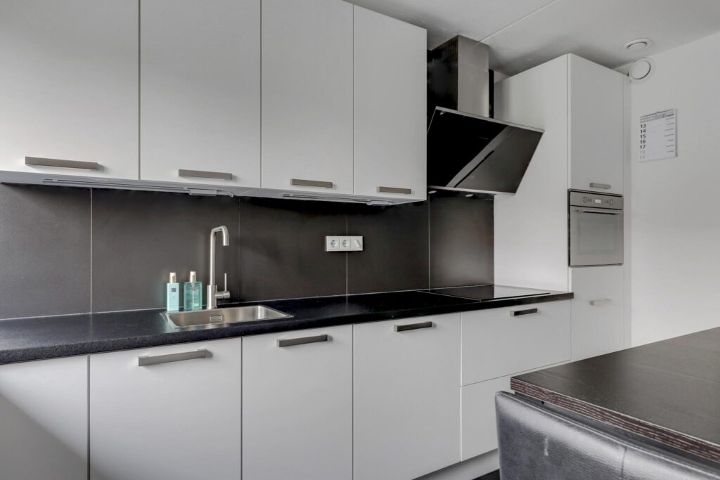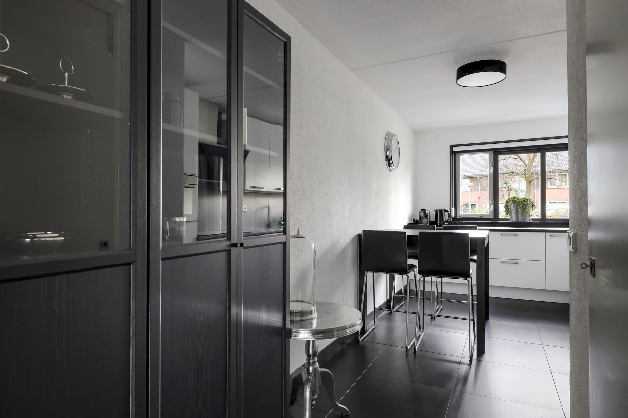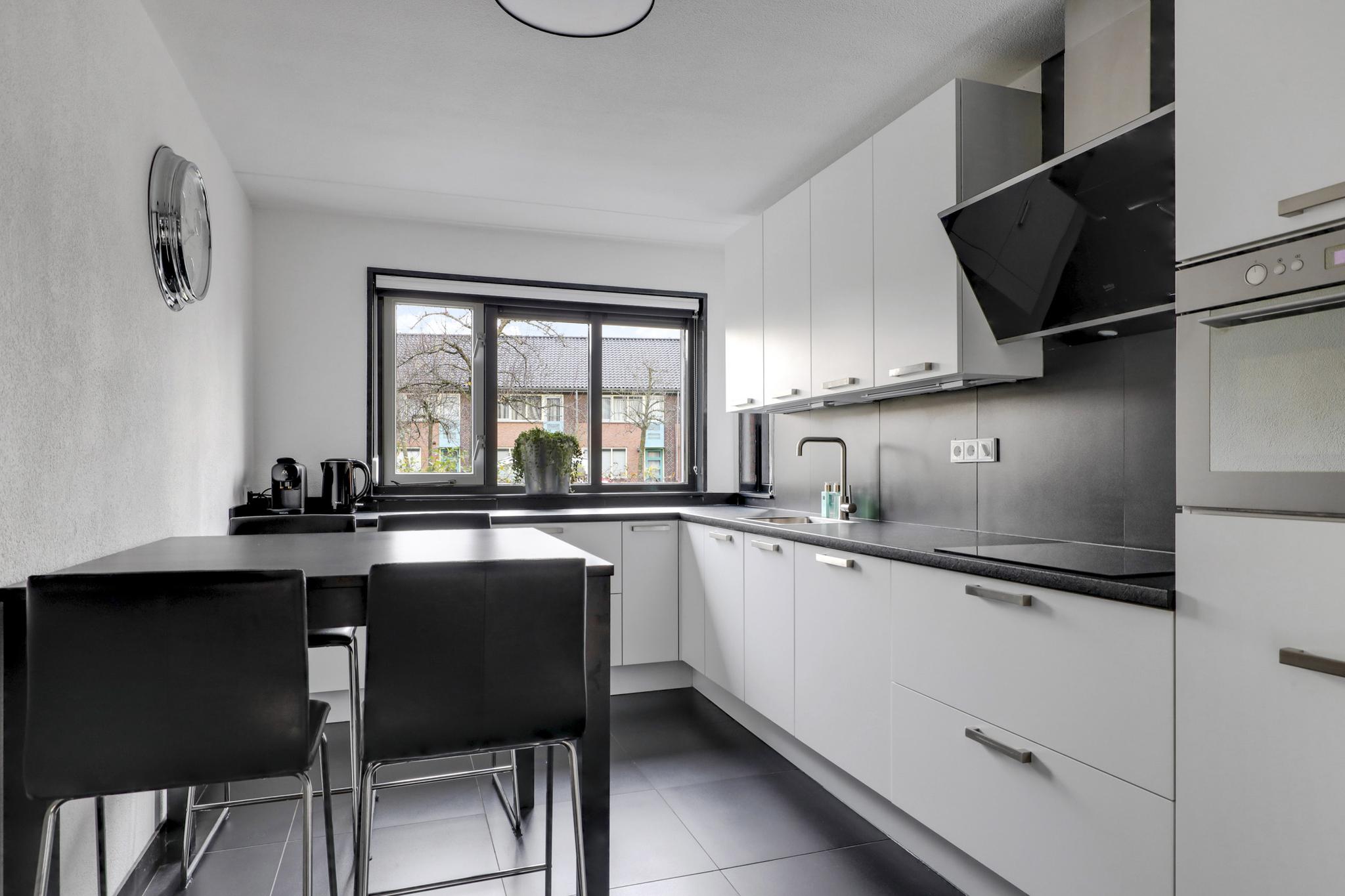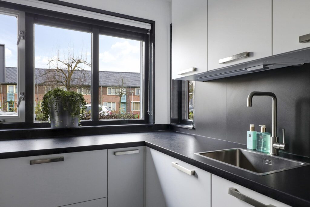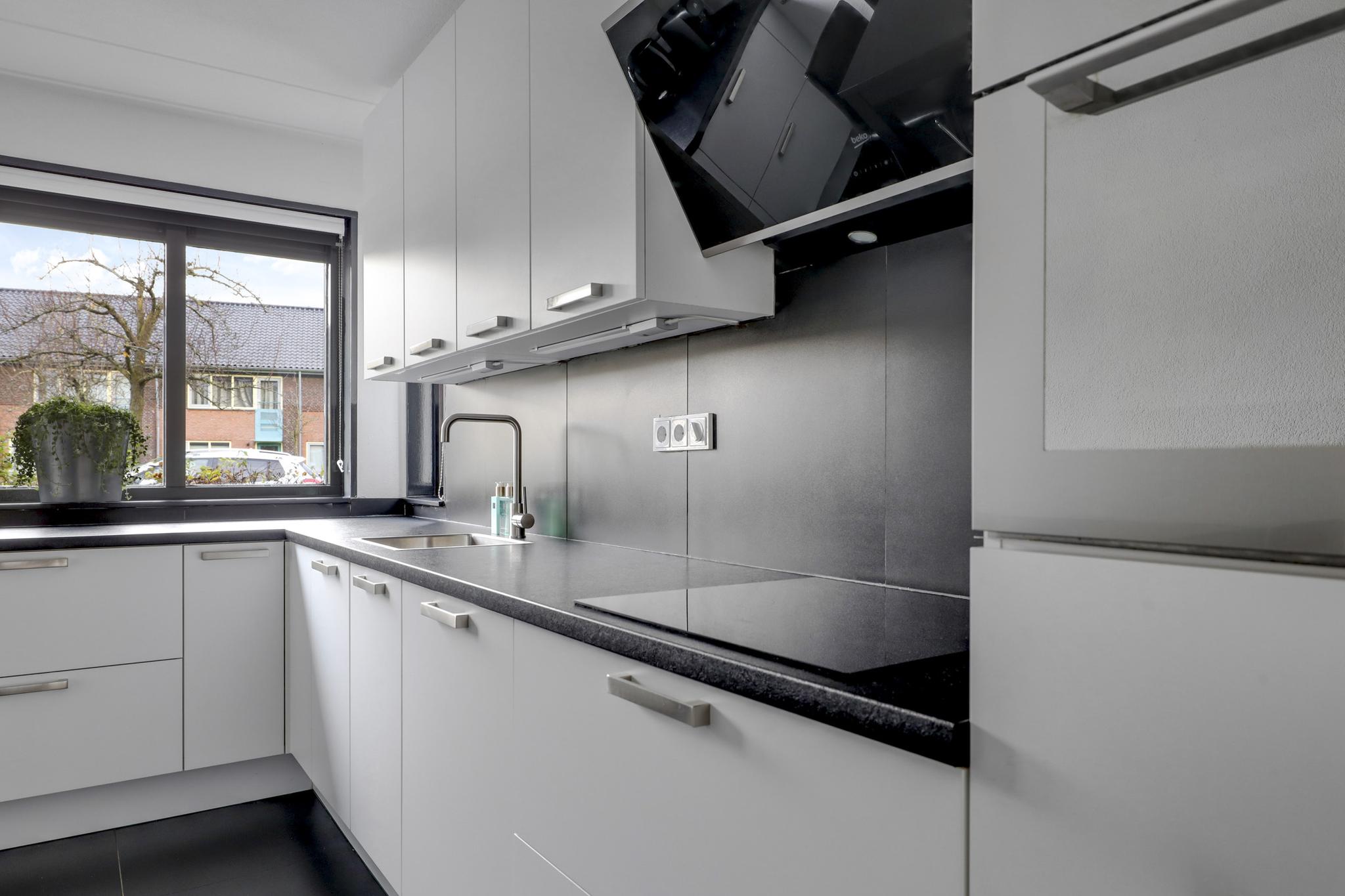 Een aantrekkelijke erker aan de voorzijde zorgt voor een ruimere opzet van de keuken. Dit geeft niet alleen een speels effect met een weids uitzicht op het voorgelegen groen, maar ook voor een groter keukenblok. Zo is er meer werkruimte op het aanrecht en is er een goede balans tussen kastruimte en inbouwapparatuur. De complete keuken is voorzien van de gewenste inbouwapparatuur zoals een 4-pits inductiekookplaat, een moderne afzuigkap een koelkast, een combi-oven/magnetron en een vaatwasser. Diverse bovenkasten zorgen voor maximaal veel opbergruimte. In de keuken kan je een 2e eethoek kwijt. Voorraad en de stofzuiger kun je kwijt in de erg handige trapkast naast de keuken.