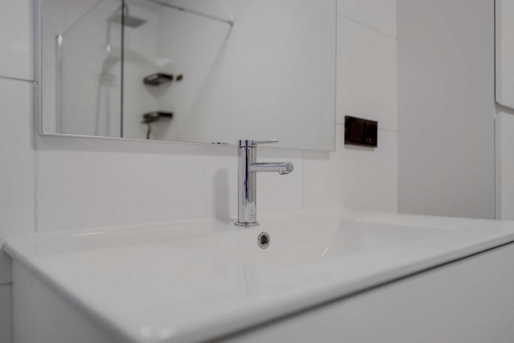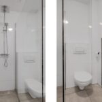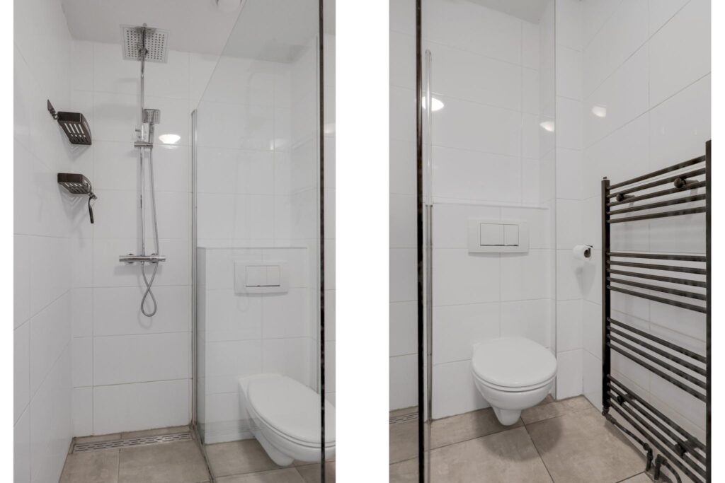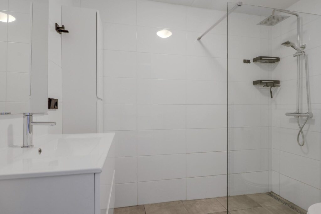 Net als de rest van de woning heeft ook de badkamer een moderne uitstraling. De ruimte is geheel betegeld met grote witte wandtegels en aardetint vloertegels. De indeling bestaat uit een ruime inloopdouche voorzien van een glazen spatscherm, een regen- en handdouche en een drainafvoer. Het wastafelmeubel heeft 2 brede lades en een separate toiletkast voor extra veel opbergruimte. De mechanische ventilatie-unit zorgt voor de nodige afzuiging van de badkamer.