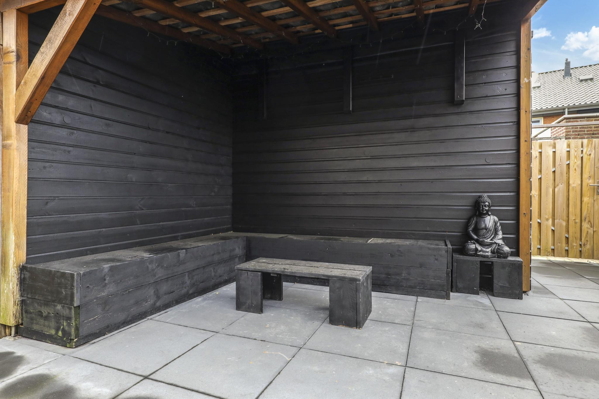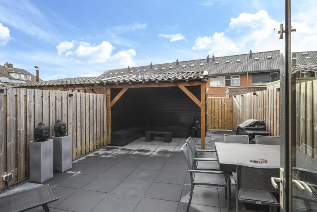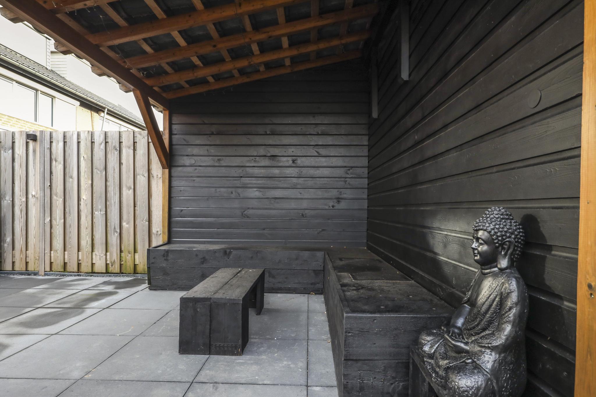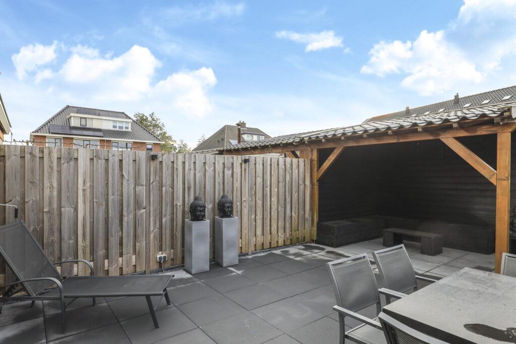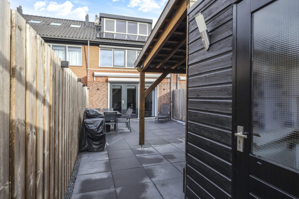 De achtertuin op het zuiden is onderhoudsvriendelijk aangelegd en voorzien van elektrisch bedienbare zonwering. In de tuin staat een stijlvolle veranda en een houten schuur, ook is er een achterom aanwezig. De woning ligt aan een autoluwe straat waarbij je aan de voorzijde zicht hebt op een groenstrook.