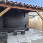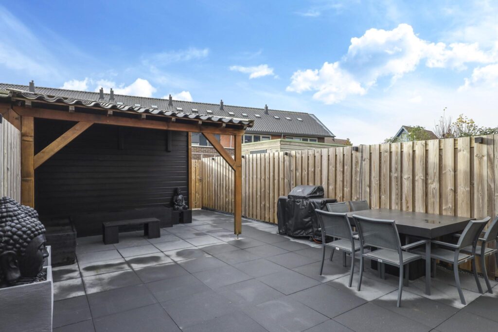 Via de openslaande deuren in de woonkamer is de achtertuin te bereiken. De tuin is gelegen op het zuiden en vangt daarmee de gehele dag zon. Ondanks de uitbouw blijft er een goede tuin over van bijna 10,5m diepte. Aan de achtergevel is een brede zonwering geplaatst waardoor je op een warme zomerdag schaduw kunt creëren op je terras. Voor de houten schuur is een stijlvolle veranda gebouwd, de houten balken steken mooi af tegen de zwart geschilderd achterwand. De tuin is onderhoudsvriendelijk aangelegd met grote tegels en rondom een houten schutting. De tuin is uiteraard voorzien van een achterom. Achter in de tuin is een houten berging welke is voorzien van elektra.