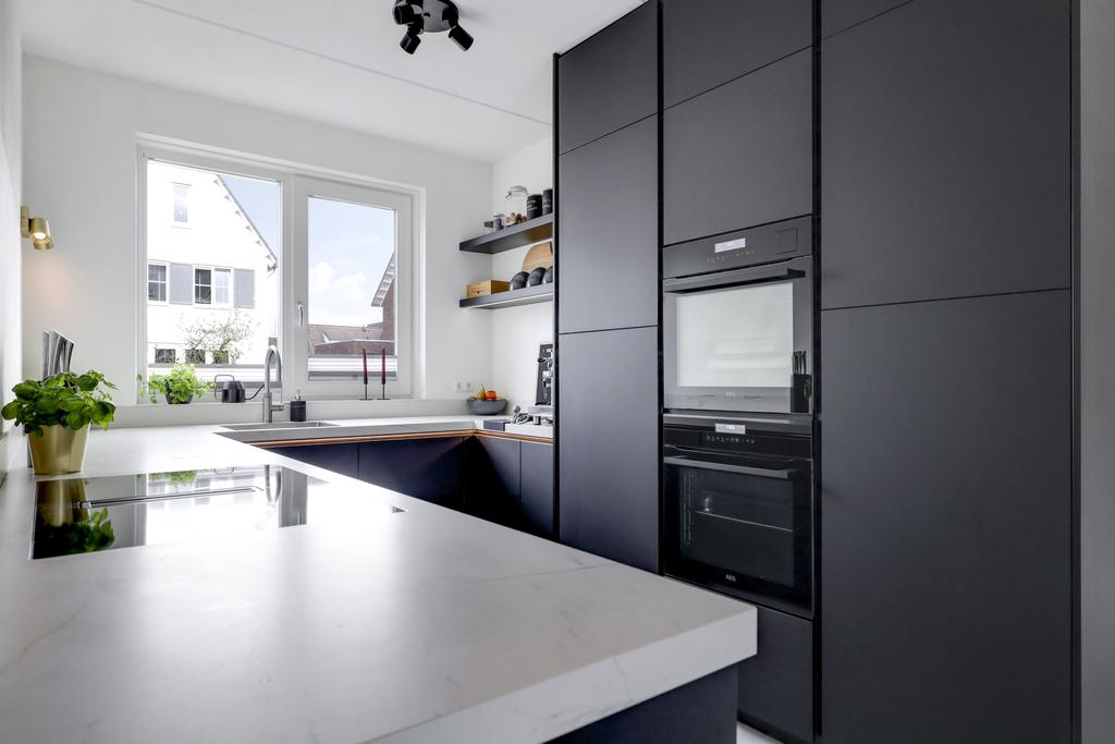 De keuken is een echte eye-catcher in de woning. Dit pronkstuk is pas in maart 2022 geplaatst en is dus nog relatief nieuw te noemen. Er is gekozen voor trendy, zwarte fronten met een zwevend, keramiek werkblad met verlichting eronder. Hierdoor lijkt het werkblad te ‘zweven’ boven de onderkastjes. Alle inbouwapparatuur in van het merk AEG en bestaat uit een vaatwasser, een maximaal hoge koelkast, een 5-lade vriezer, een full-steam oven en een oven met pyrolyse (zelfreinigings)functie. Helemaal van deze tijd is de brede 4-pits inductiekookplaat welke is voorzien van een geïntegreerde afzuiger. Hierdoor kon een afzuiger boven de kookplaat achterwege gelaten worden. De kookplaat ligt bovendien strak verzonken in het werkblad. Uiteraard is deze keuken ook voorzien van een Quooker voor direct kokend water. Een Le Mans-slede zorgt voor praktische bergruimte in de hoekkast van het keukenblok. Kortom, deze keuken lijkt rechtstreeks uit een chique woonblad te komen.