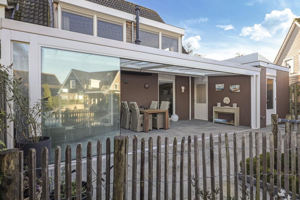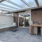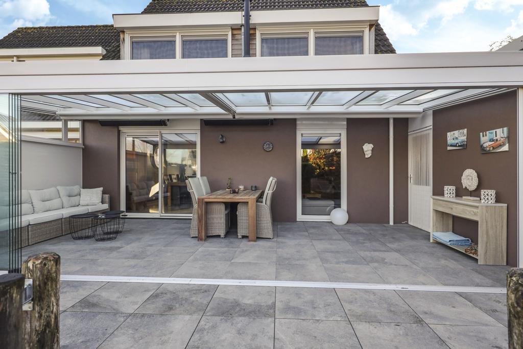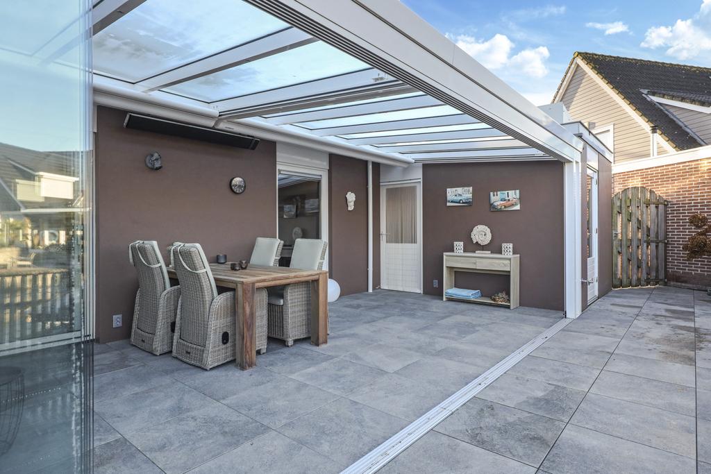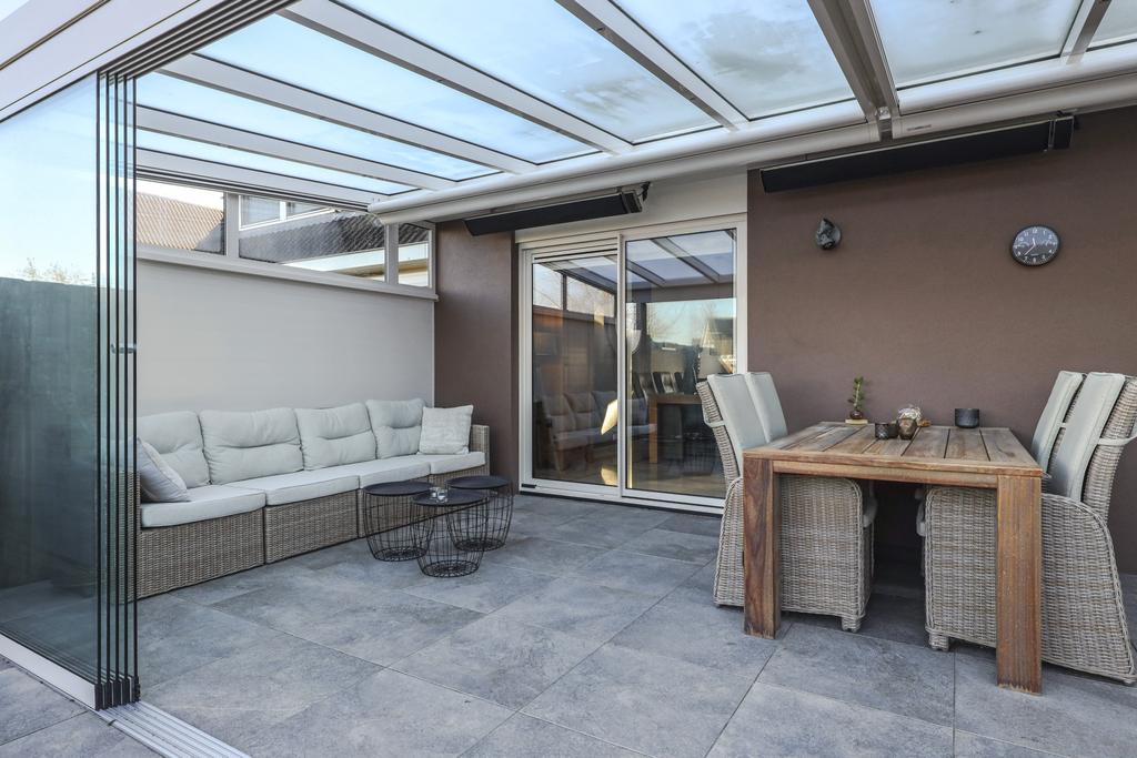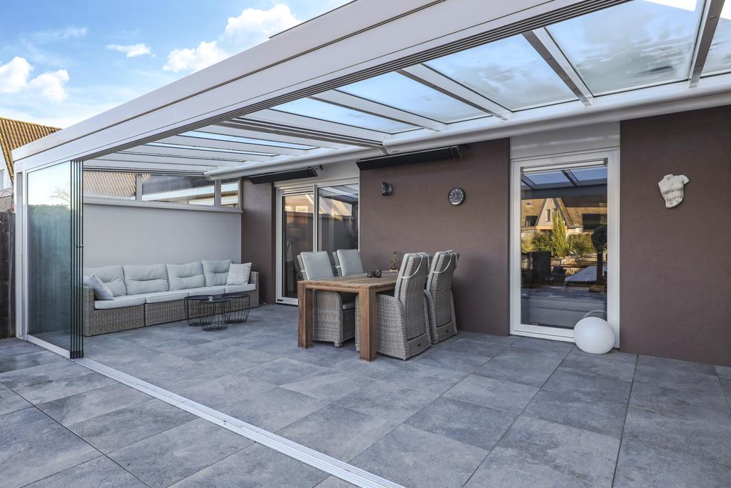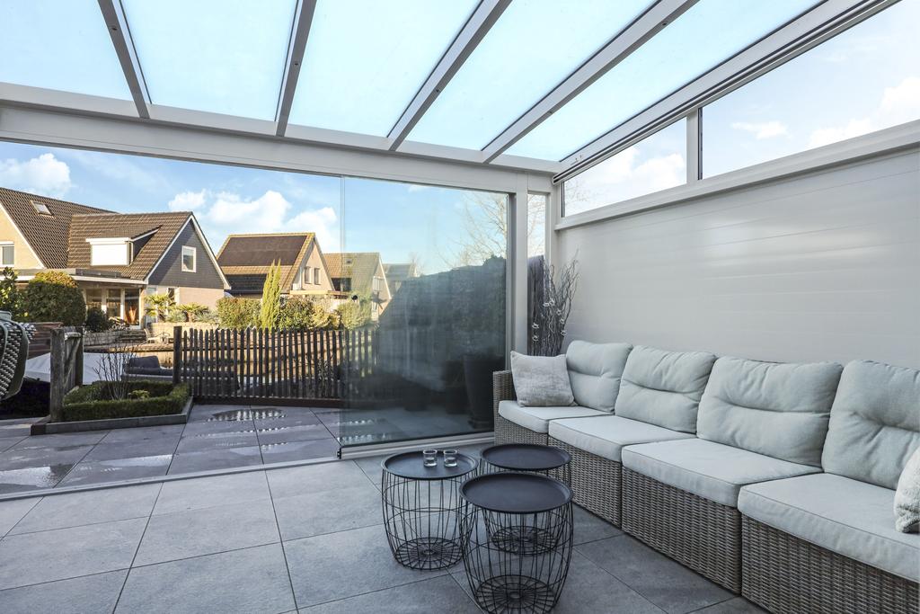 Een brede schuifpui geeft toegang tot de aangrenzende tuinkamer. Deze tuinkamer mag je als het verlengde van de woonkamer zien en heeft dezelfde breedte als de woning zelf. Met ca. 27m2 is de leefruimte hierdoor aanzienlijk vergroot. Het hele jaar door is het hier heerlijk toeven, ook in de winterperiode aangezien je met infraroodpanelen kunt verwarmen. De tuinkamer is geheel met glaspanelen afsluitbaar, maar ook te openen waardoor je ineens in de tuin zit. Doordat de (ingevoegde) keramische tegels (60x60) naadloos doorlopen op het buitenterras, veranderd de tuinkamer dan in een heerlijke veranda.