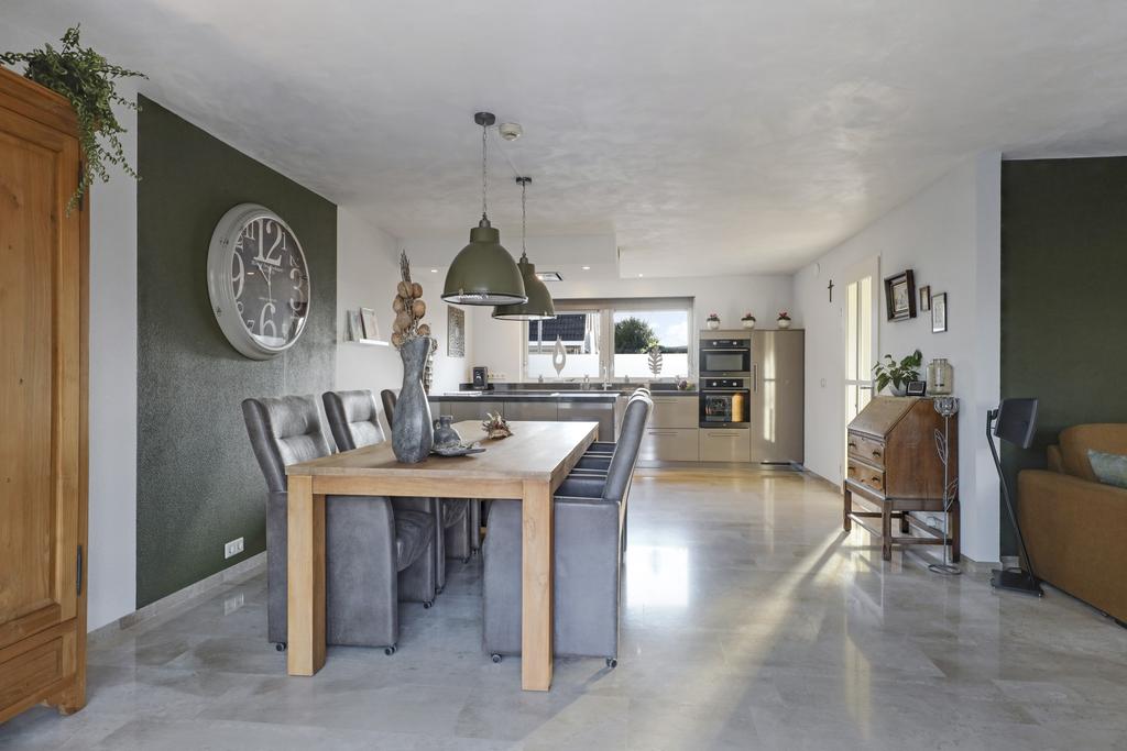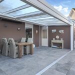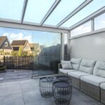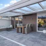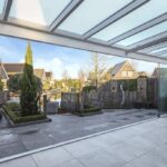 Echt genieten is het glazen dak (gelaagd glas) dat voor een bijzondere beleving zorgt. Wanneer de zon eenmaal op het glas staat, kun je de zonwering (elektrisch) onder het glazen dak laten schuiven. In de aluminium dragers van het glas zijn dimbare inbouwspots aangebracht. De muren zijn hier gestuct en in een contrasterende kleur geschilderd, zodat je hier een gezellig, huiselijk gevoel krijgt.