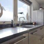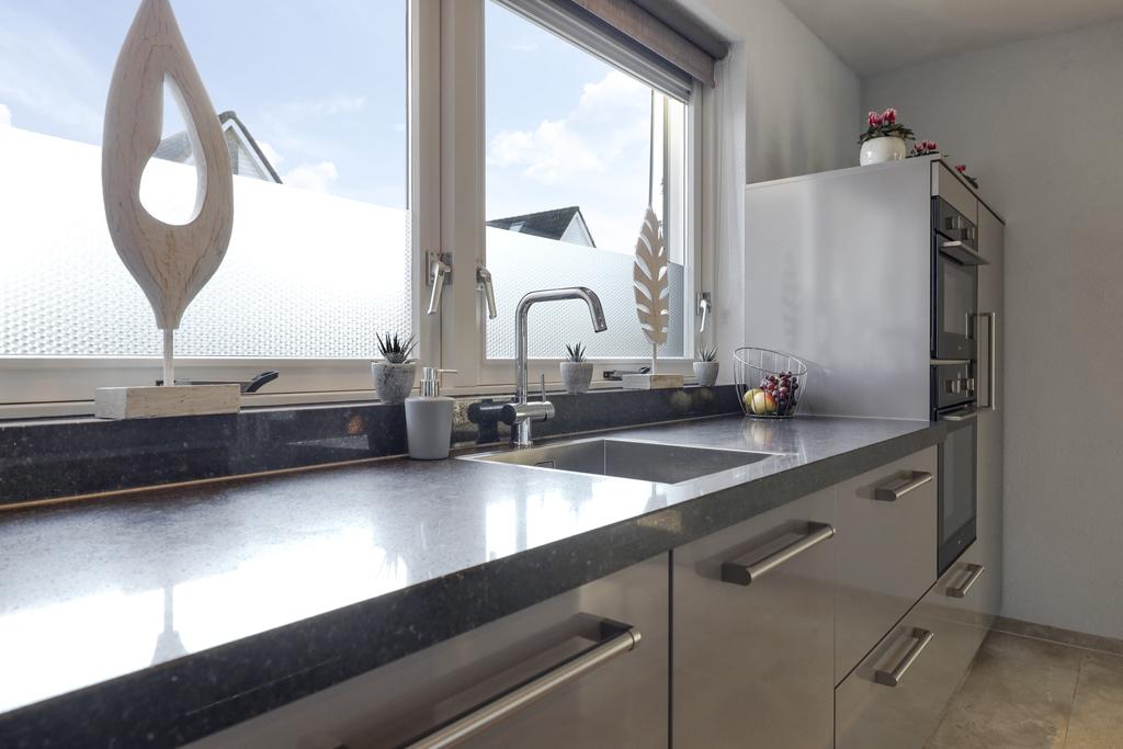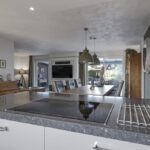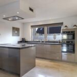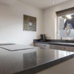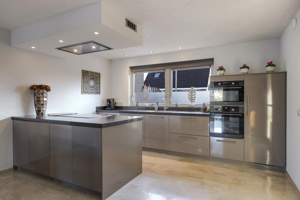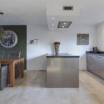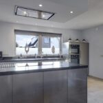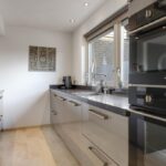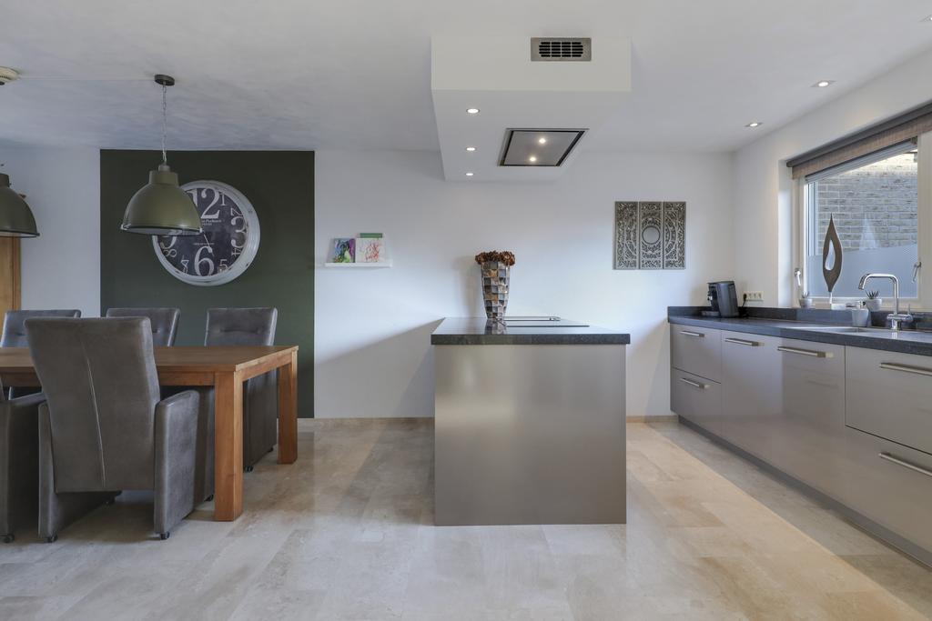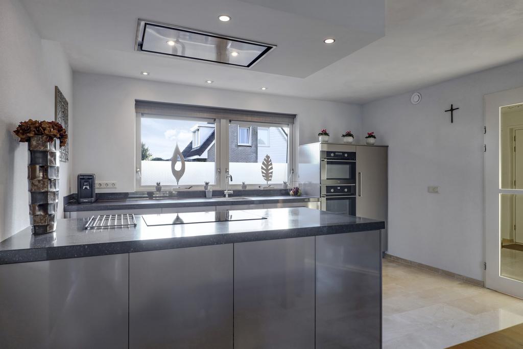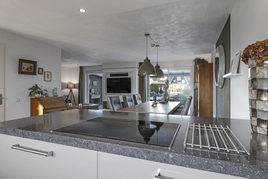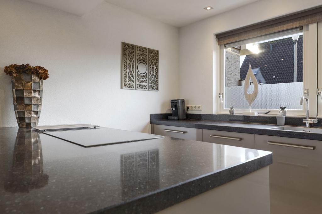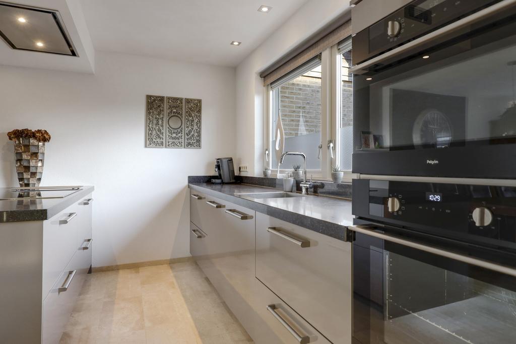 De keuken is een heuse eye-catcher in huis. Niet alleen vanwege de schiereilandopstelling, maar ook vanwege het robuuste, zwarte werkblad van natuursteen (composiet). Er zijn allemaal A-merk apparatuur toegepast waarbij je moet denken aan een inductie kookplaat met flexzones, een recirculatie afzuigsysteem met plasmafilter die in het plafond is ingestuct, een vaatwasser, een combi-oven/magnetron, een separate heteluchtoven en een koelkast. Brede ladekorven zorgen voor veel praktische opbergmogelijkheden. Keukens zijn altijd smaakgevoelig maar de trendy kleurstellingen zullen de meeste mensen kunnen waarderen. Om het af te maken is de deur naar de hal voorzien van een luxedeur.