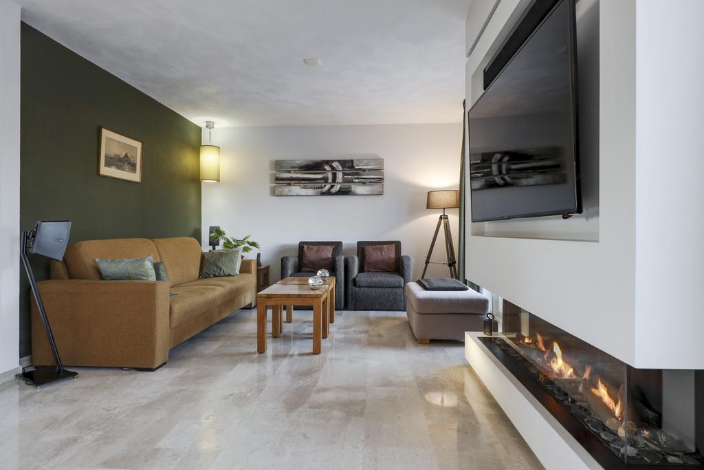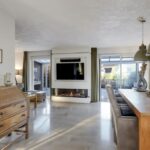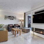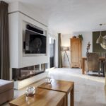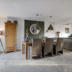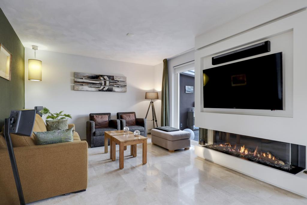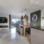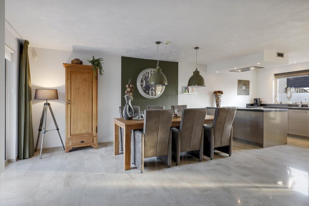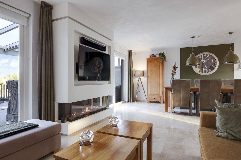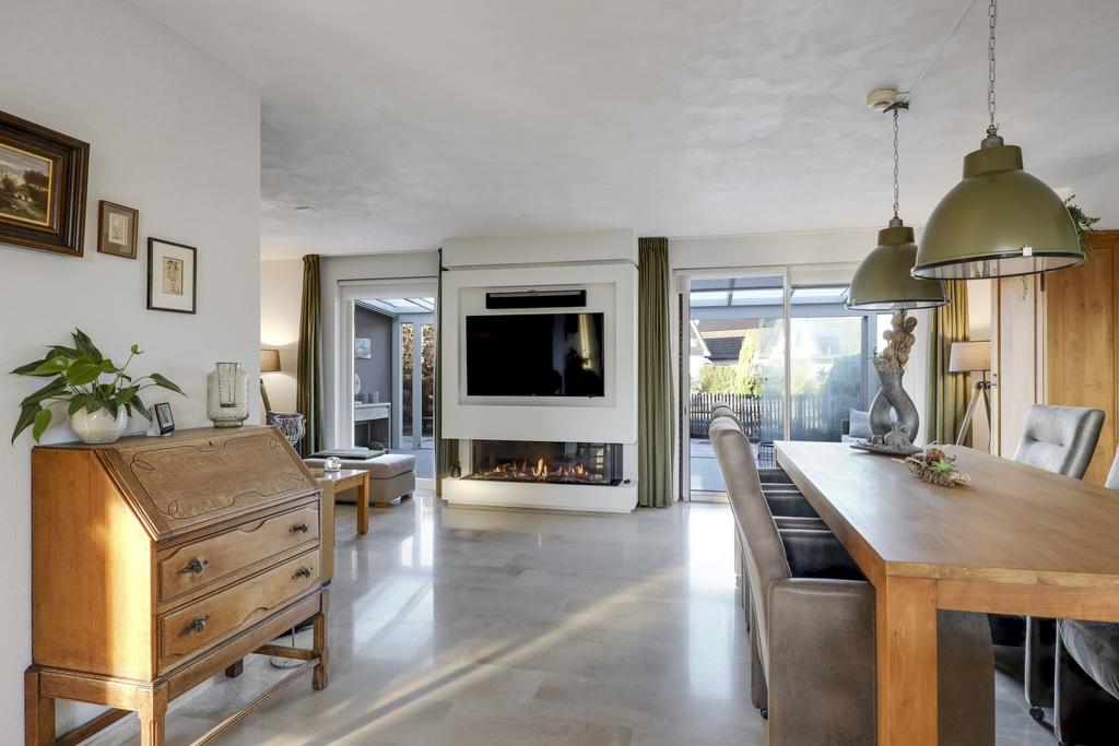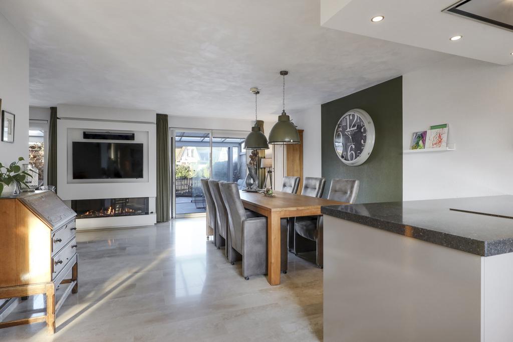 De woonkamer is aan de achterzijde gelegen en is daardoor tuingericht. Door de hoge ramen (tot aan de vloer) kijk je prachtig uit over het water. Opmerkelijk is de uitzonderlijke breedtemaat van de woning (>7m breed) wat de woonkamer extra ruimtelijk maakt. Een echte eye-catcher is de strak ingestucte gashaard waarboven je een flink formaat TV-scherm in een nis kunt plaatsen. Op die manier kun je van beiden tegelijkertijd genieten, ook wanneer je in de keuken aan het koken bent. Door haar aantrekkelijke breedtemaat kun je een gezellige zithoek creëren. Tevens is er ruimte voor een lange 6- tot 8-persoons eettafel.