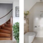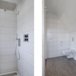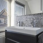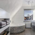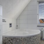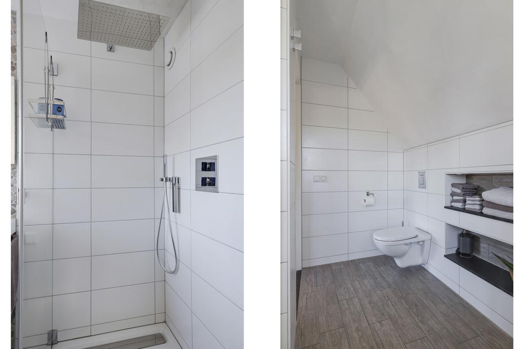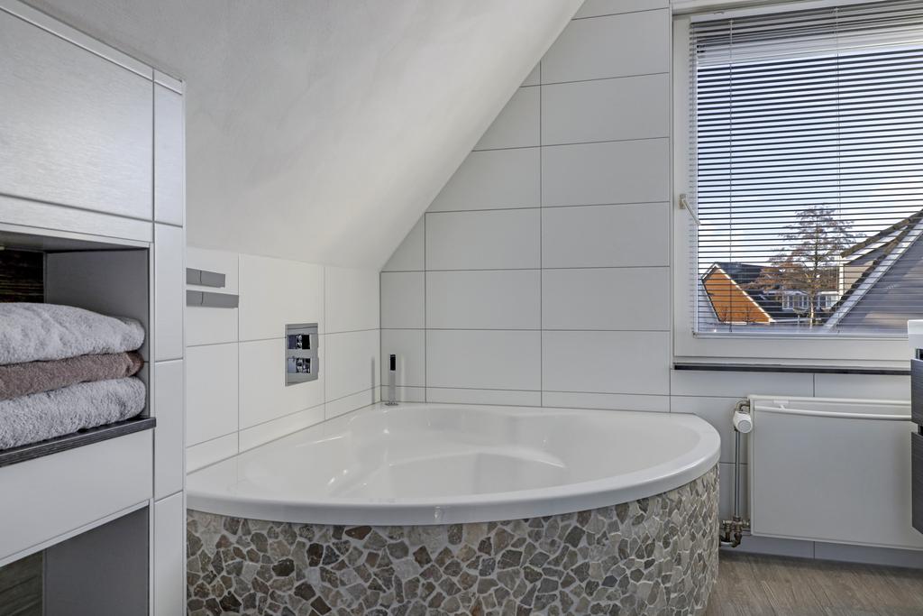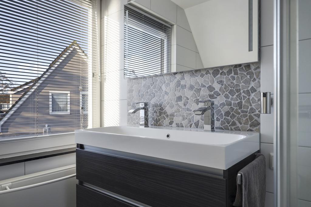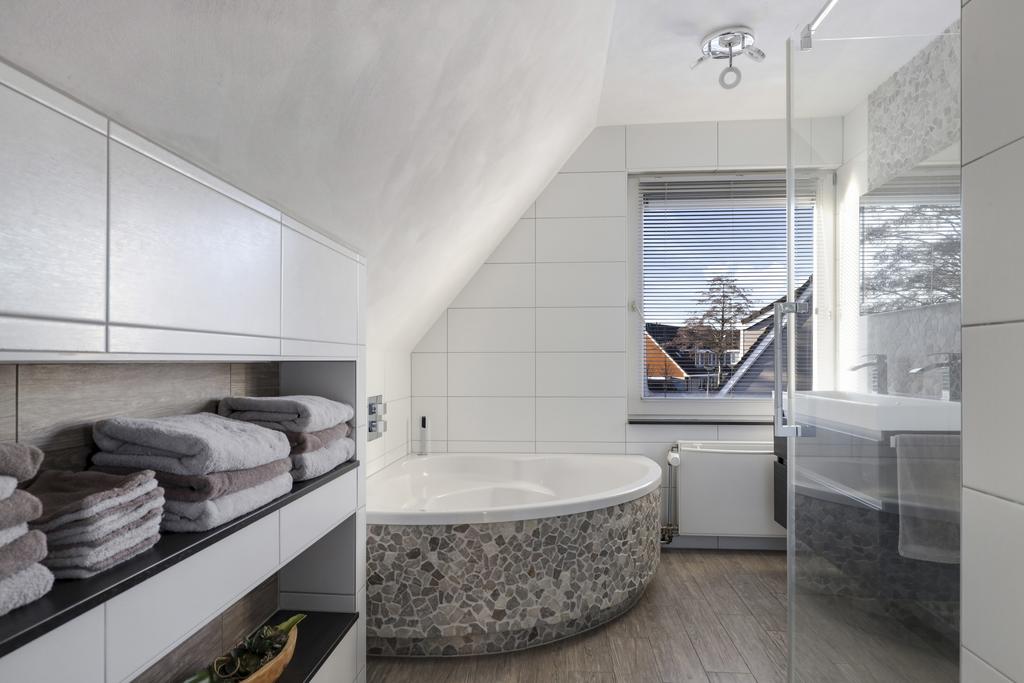 De badkamer valt zeker niet uit de toon wat betreft luxe en comfort. Er is goed nagedacht over de ruimte voordat de badkamer opnieuw werd ingedeeld. Op die manier was er plaatst voor al het wenselijke sanitair zoals een doucheruimte, een ligbad, een 2e wandcloset en een 2-persoons wastafelmeubel. Er zijn leuke en trendy details te benoemen zoals de XL-rainshower in combinatie met de handdouche. In het tegelwerk zijn speelse accenten aangebracht waaronder rivierkeitjes. Onder het ligbad is LED-verlichting aangebracht waardoor het lijkt alsof het bad ‘zweeft’. Nisjes in de wanden zijn eveneens met LED verlicht, evenals de spiegel boven het wastafelmeubel. En natuurlijk ontbreken de kranen uit de muur niet. Ventileren kan middels het aanwezige draai/kiepraam, maar er is ook mechanische ventilatie aanwezig. Ook dit raam is volledig af te sluiten middels een elektrisch bedienbaar rolluik.