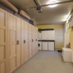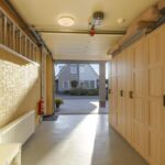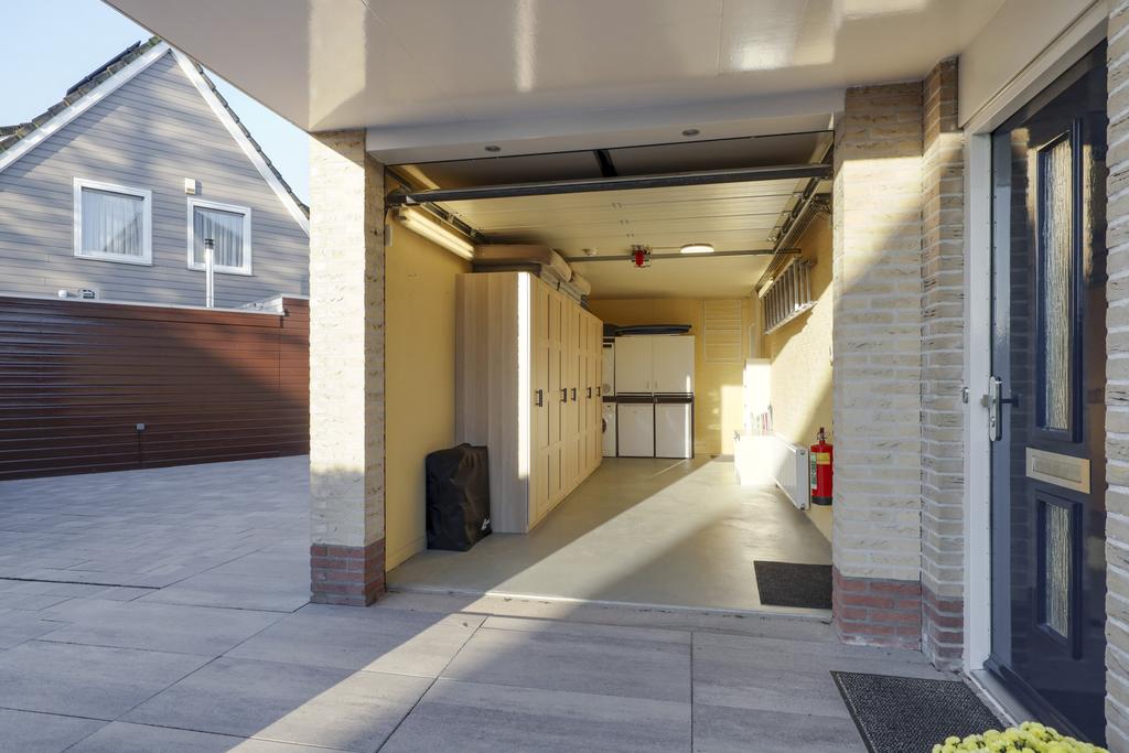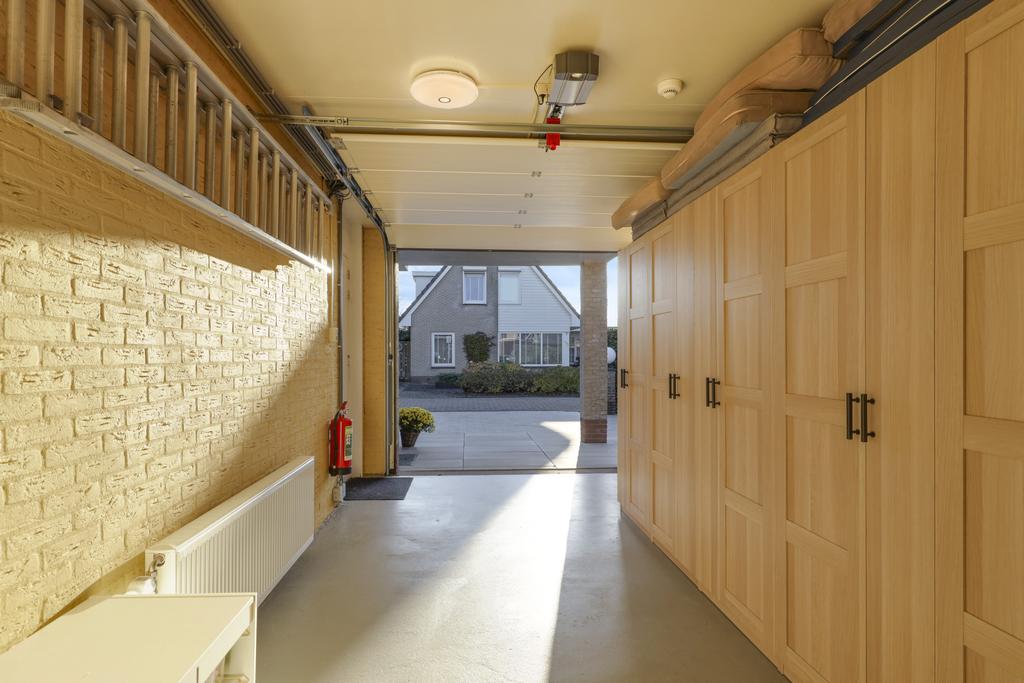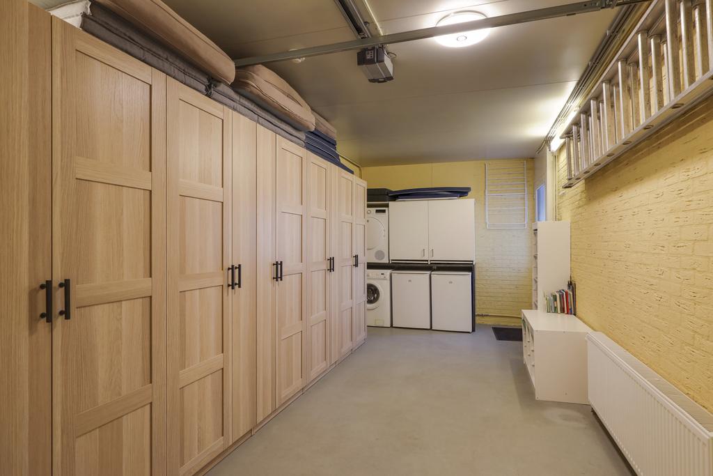 De garage is thans in gebruik als sport- en opslagruimte. De elektrisch bedienbare en geïsoleerde sectionaaldeur is daarbij erg comfortabel. Tevens vind je hier de wasmachine- en wasdrogeropstelling en is er plaats voor een eventuele extra koel- en vrieskast. Rechts achterin is er een deur naar de aangebouwde tuinkamer. Goed om te weten is dat er achter de garage nog een extra schuur is aangebouwd waar je eveneens fietsen en/of een motor kunt stallen.
