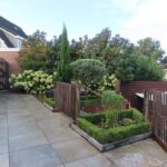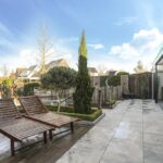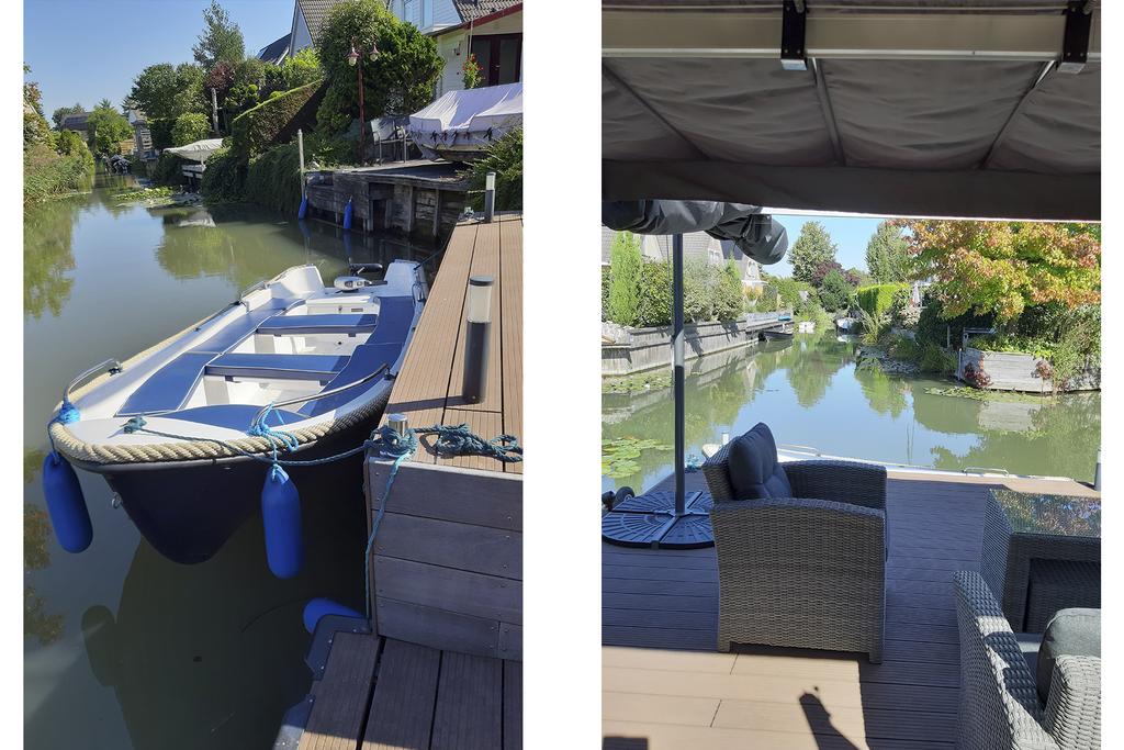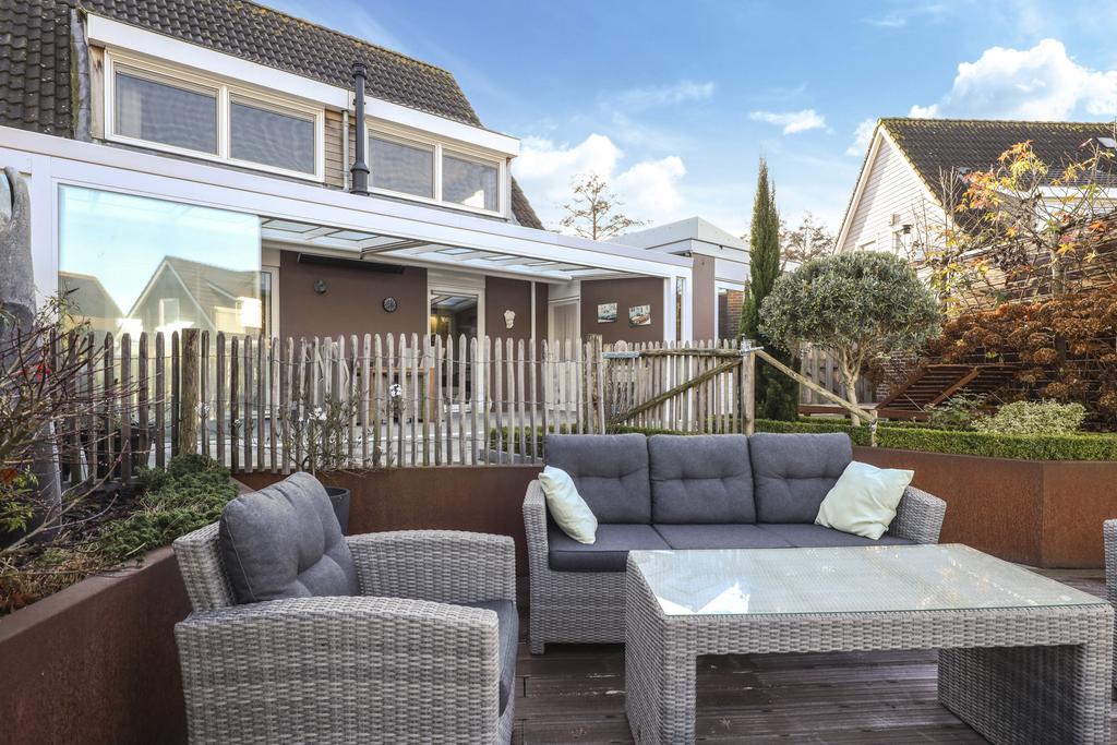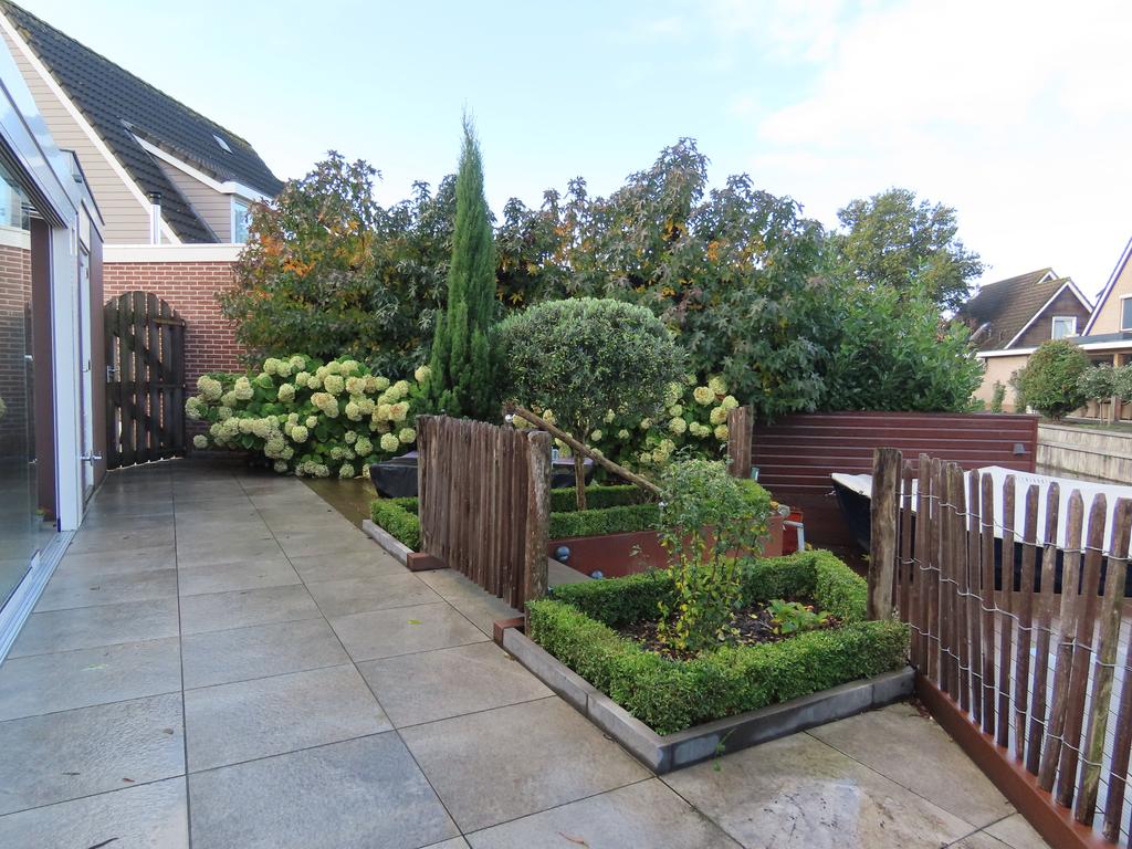 Deze woning staat ook in het teken van het buitenleven. Net als in de woning is er ook veel tijd, geld en energie in de tuin gestoken. Een terras van keramische tegels (ingevoegd) loopt met een hoogteverschil over in een composiet vlonderterras aan het water. Je hebt een weids uitzicht over een singel waar de zwanen en meerkoeten je tegemoet komen. In de overgang van het ene naar het andere terras kom je verschillende elementen tegen zoals steenkorven, schapenhekwerk en cortenstaal afwerking. Op verschillende plaatsen zijn er contactpunten (elektra) aanwezig, net als de vele grondspots en lampjes op de vlonder en langs de trap, die de tuin in het donker sfeervol verlichten. Denk daarbij aan verschillende planten en bomen (zoals leibomen en hortensia’s) en de zeer degelijke schutting als erfafscheiding (top-down-spots). Hou je van het buitenleven, dan zul je deze tuin zeker kunnen waarderen.