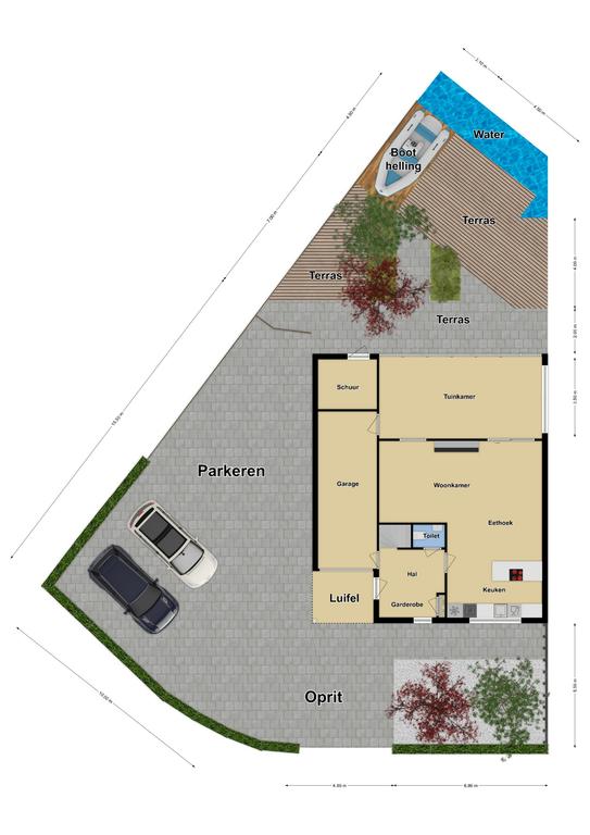 Deze goede onderhouden woning staat op een aantrekkelijk en speels vormgegeven perceel van 353m2 groot met opvallend veel zijtuin naast de garage. Hierdoor is de oprit royaal te noemen met plaats voor 4 auto’s en/of een caravan/camper op eigen terrein. De tuin is van voor naar achteren fraai aangelegd met o.a. groot formaat (ingevoegde) keramiektegels, in-lite buitenverlichting, verschillende soorten planten, diverse contactpunten, robuuste steenkorven, sierlijk schapenhekwerk en als pronkstuk het vlonderterras aan het water. Ben je een vaarliefhebber, dan kan je je hun eigen sloep aanmeren aan het vlonderterras. Tevens is er een boothelling aangelegd om de sloep op het droge te kunnen leggen.