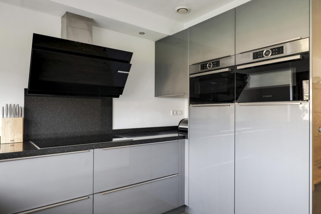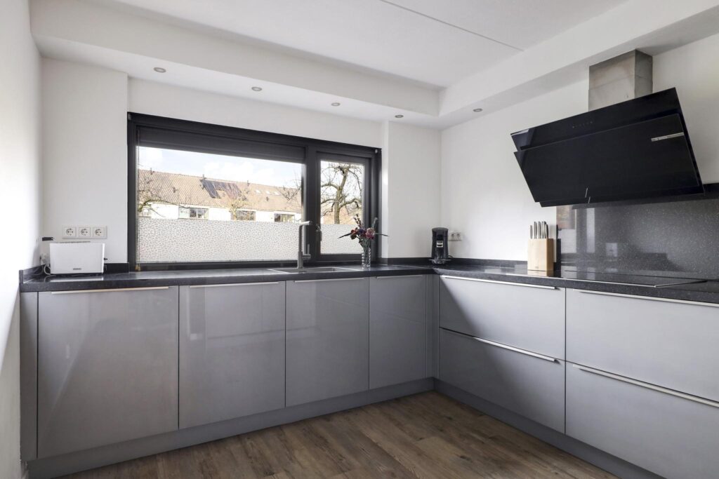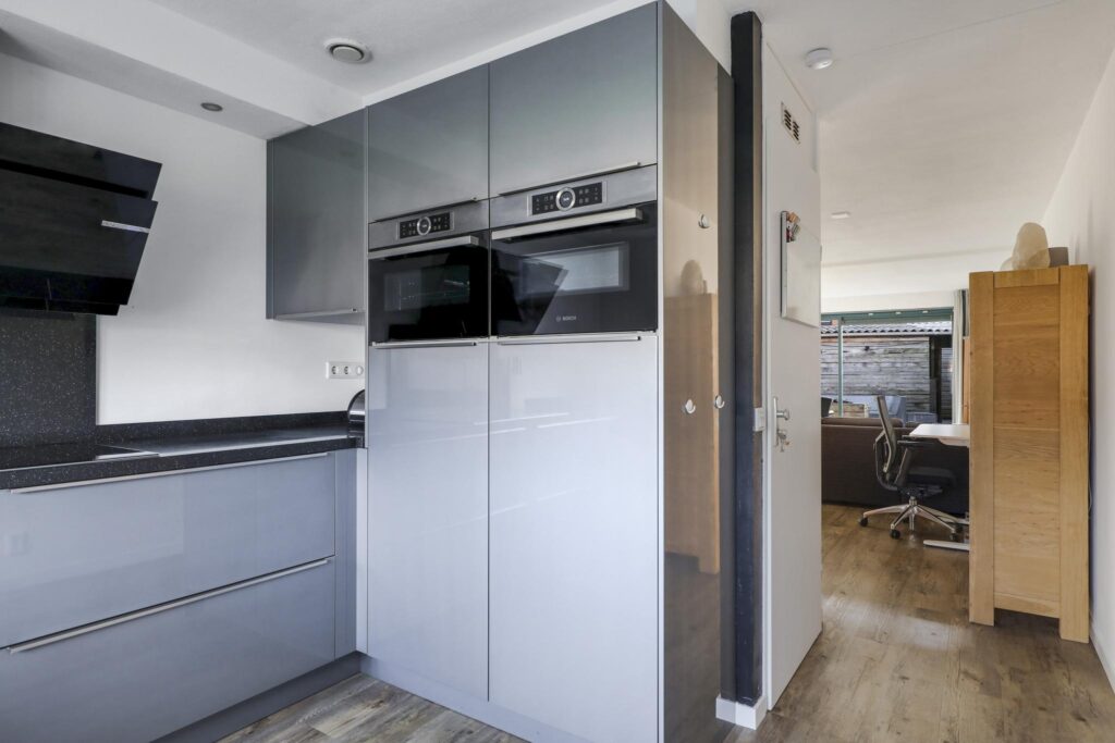 Deze keuken is een echte eye-catcher doordat het een moderne en trendy uitstraling heeft en in een U-opstelling is geplaatst. Bij dit type woning zien we dat niet zo vaak terwijl het een hele aantrekkelijke en ruimtelijke beleving geeft. Bovendien is de keukenopstelling hierdoor uitgebreider waar dankbaar gebruik van is gemaakt. Er is niet alleen meer aanrecht (in natuursteen uitgevoerd) maar ook een brede, hoge kastenwand welke is voorzien van diverse inbouwapparatuur. Denk daarbij aan een combi-oven/magnetron, een separate 2e oven, een koelkast en een separate 4-lades vriezer. Naast de gootsteen (voor het raam) is een ingebouwde vaatwasser te vinden. Koken doe je op de brede inductie kookplaat met design afzuigschouw. En niet te vergeten de luxe Le-man-slede in de hoekkast die je voor een groot deel uit de kast kunt schuiven. En handig om te weten: naast de keuken is nog een trapkast te vinden waar je de nodige voorraad kwijt kunt.