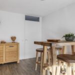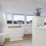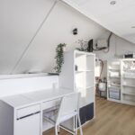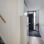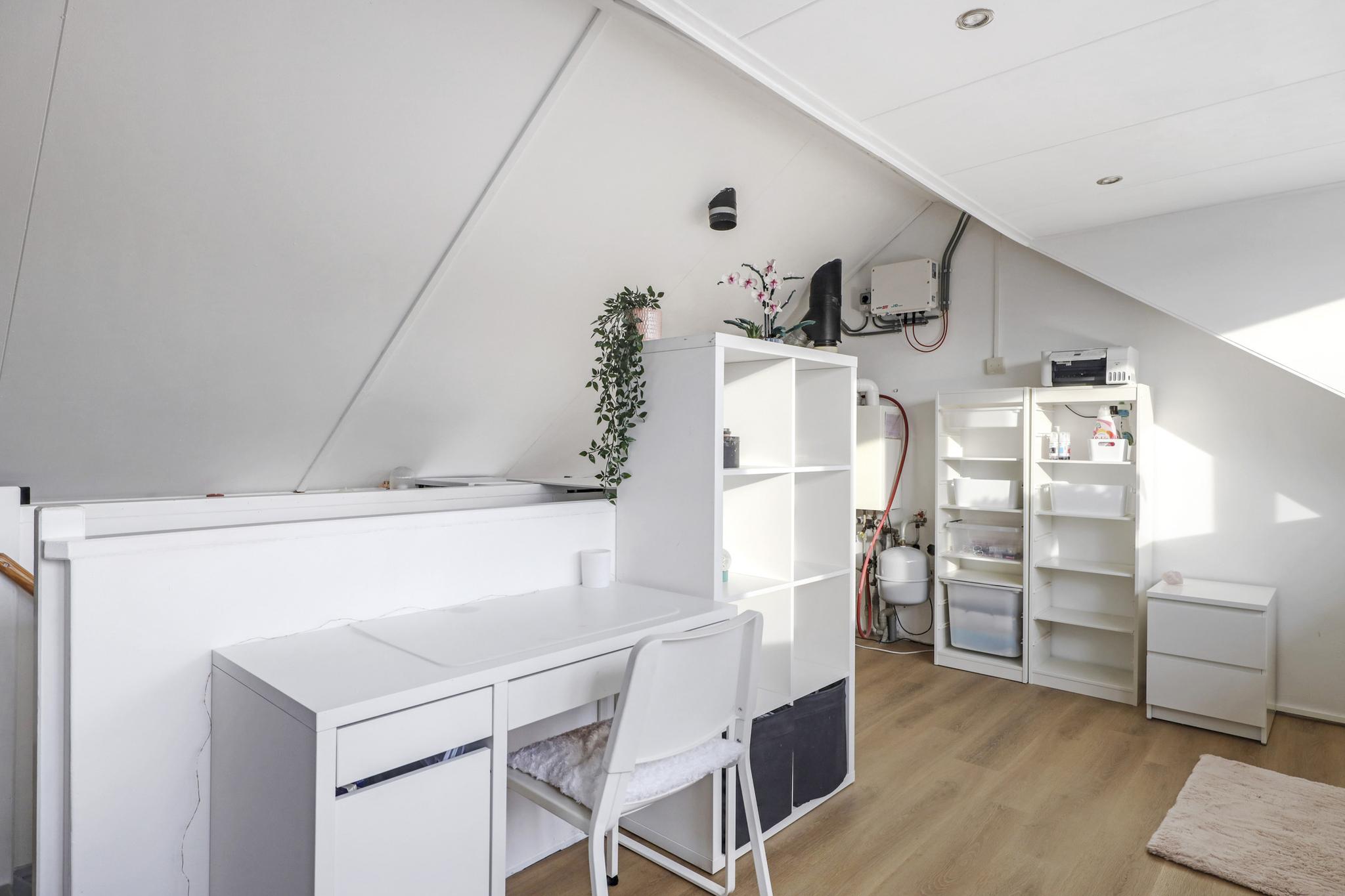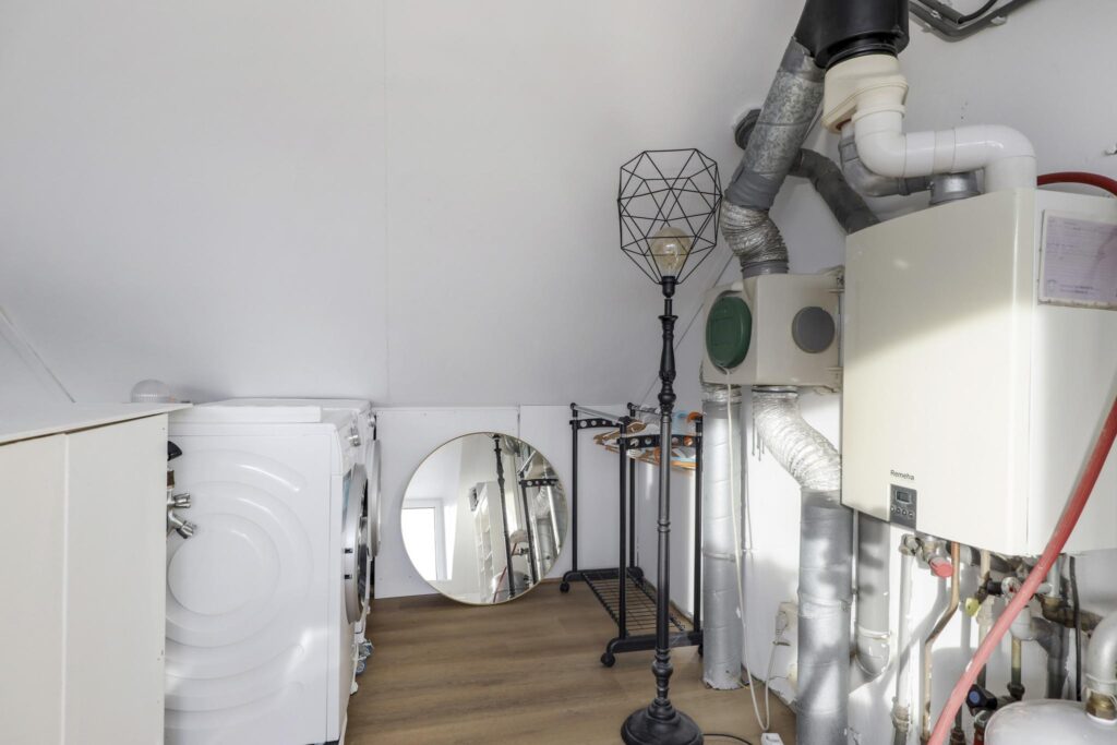 Wat opvalt is dat ook hier het afwerkingsniveau neutraal en tot in de nok verzorgd is. Verder vind je op deze woonlaag een washoek waarbij je de wasmachine en wasdroger naast elkaar kunt opstellen. Ook de CV-ketel, de MV-unit (ventilatie) en de omvormer van de zonnepanelen zijn hier geïnstalleerd. Achter de knieschotten kun je nog de nodige (seizoen)spullen opbergen.