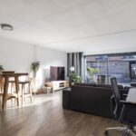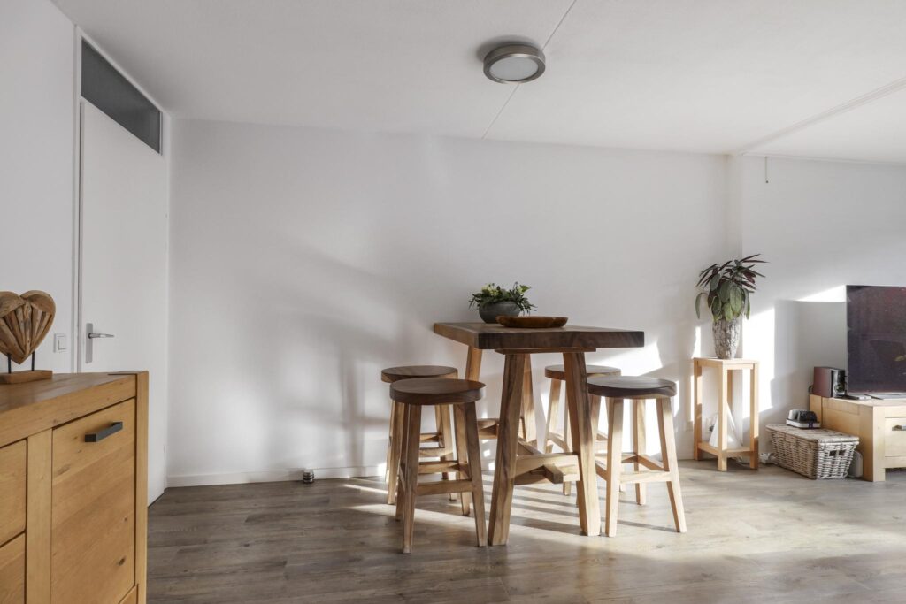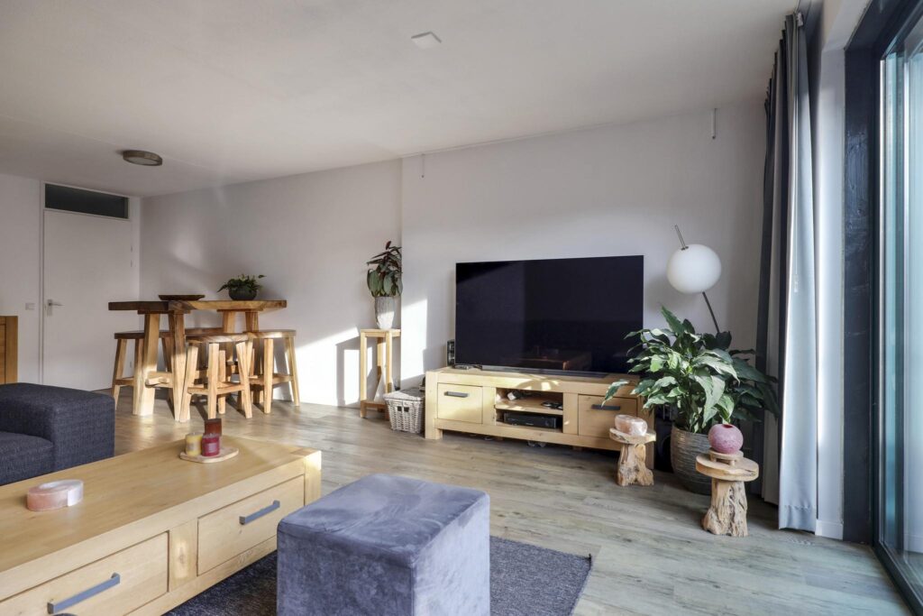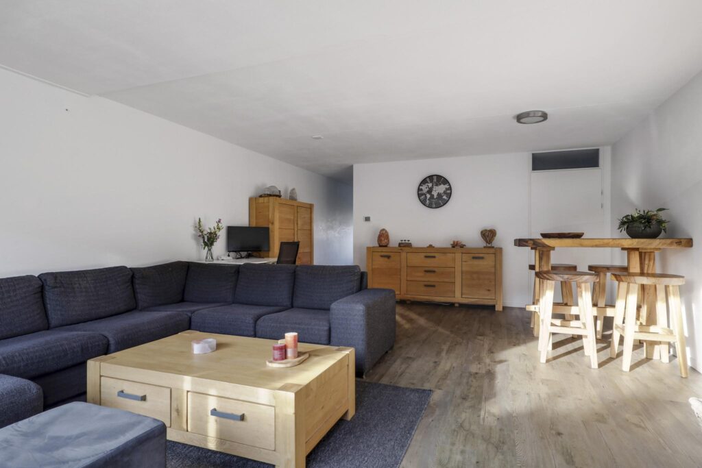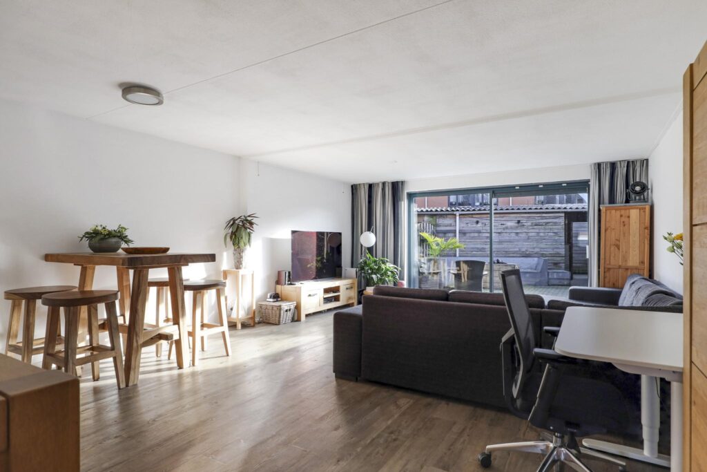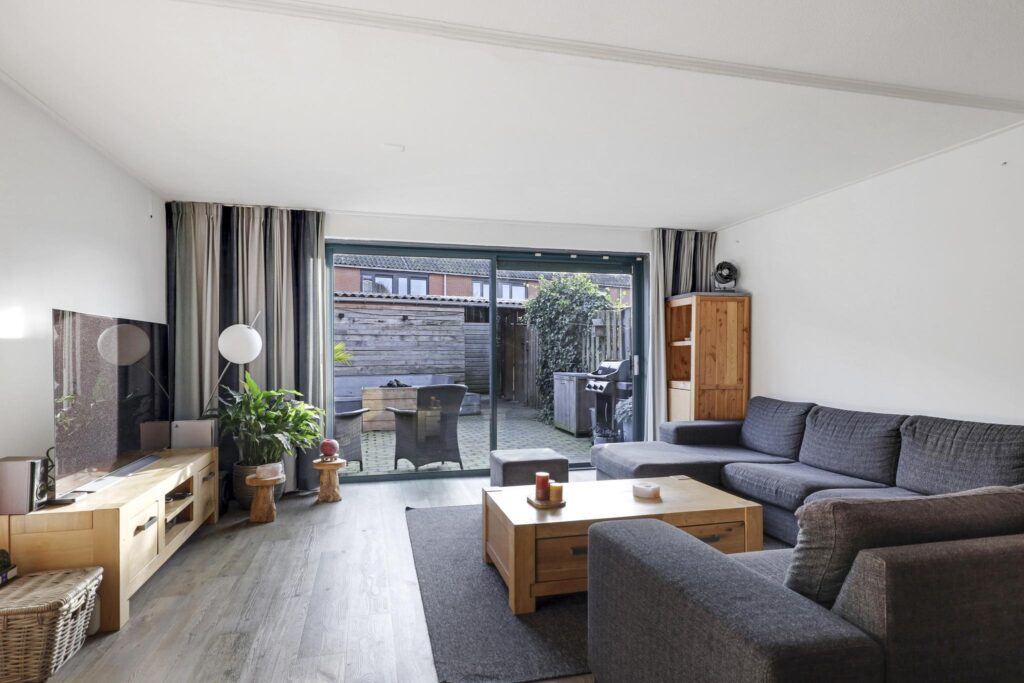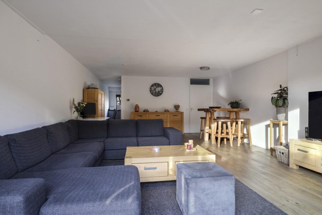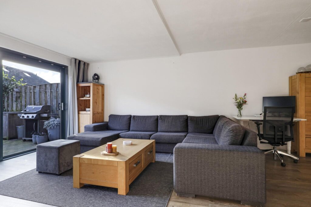 Wanneer je vanuit de hal de woonkamer inloopt, wordt je verrast door de ruimte die de woonkamer te bieden heeft. Het voelt aan als een echte living. Ruimte genoeg voor meerdere grote meubelstukken zonder dat het ten koste gaat van het ruimtelijke gevoel. Erg comfortabel is de PVC-vloer (houtlook) met vloerverwarming. Hierdoor zijn er ook geen radiatoren te vinden die in de weg zitten. Opvallend is het grote glasoppervlak tot aan de vloer (met schuifpui) in de achtergevel. Hierdoor komt er veel licht naar binnen, ook omdat het zuid-ligging heeft. Om in de zomer de warmte enigszins te kunnen weren, is er een uitvalscherm aanwezig.
