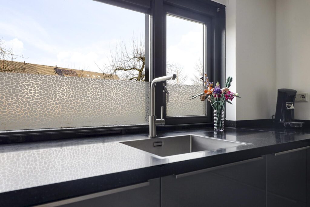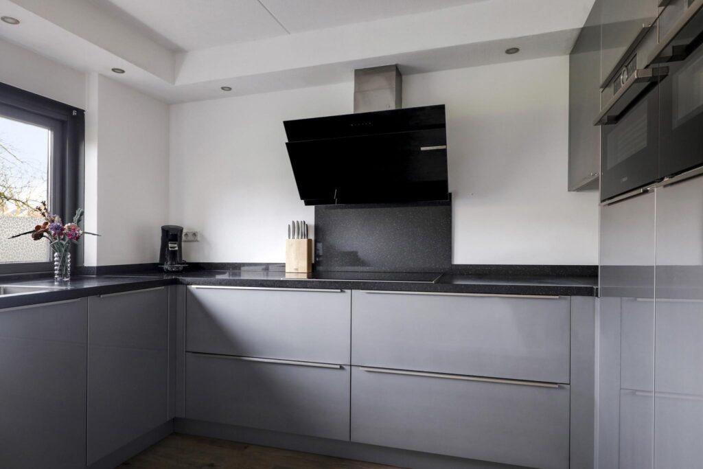 Bovengemiddeld luxe keuken met o.a. een robuust natuurstenen aanrechtblad