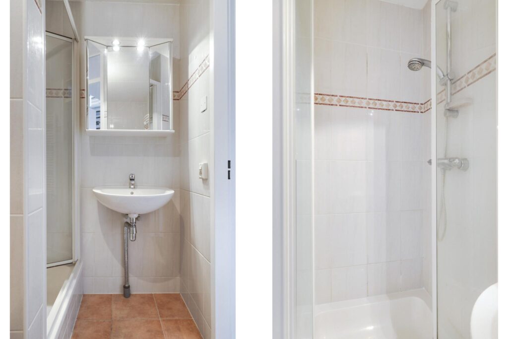 De badkamer is tussen de slaapkamers in gelegen. Er is gekozen voor een complete indeling, dus met ligbad én een aparte douchecel. Het overige sanitair bestaat uit een wastafel en een 2e (zwevend) toilet. Boven de wastafel is een spiegelkast geplaatst waar je de nodige toiletspullen kunt opbergen. Verder is de badkamer degelijk en fris afgewerkt met onder meer neutraal tegelwerk tot aan het plafond. Een handdoekradiator maakt de badkamer compleet.