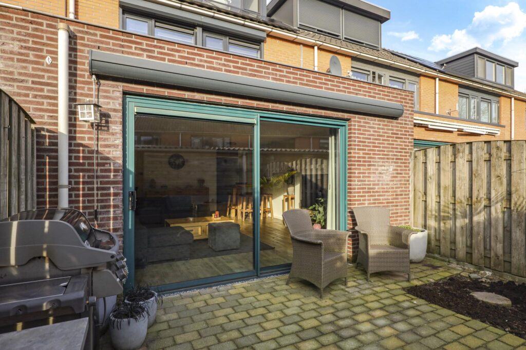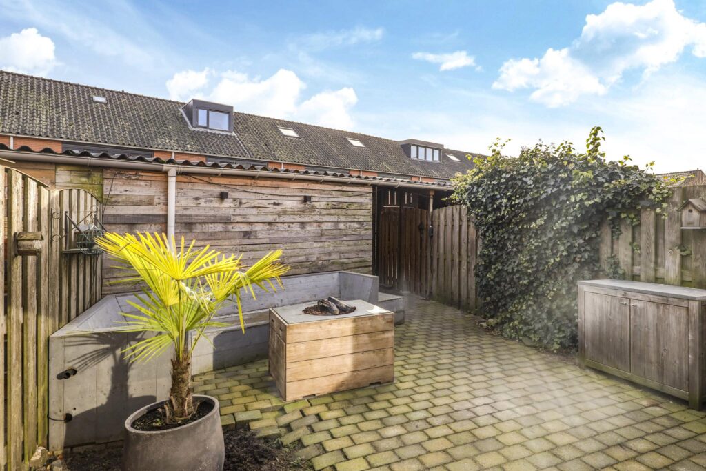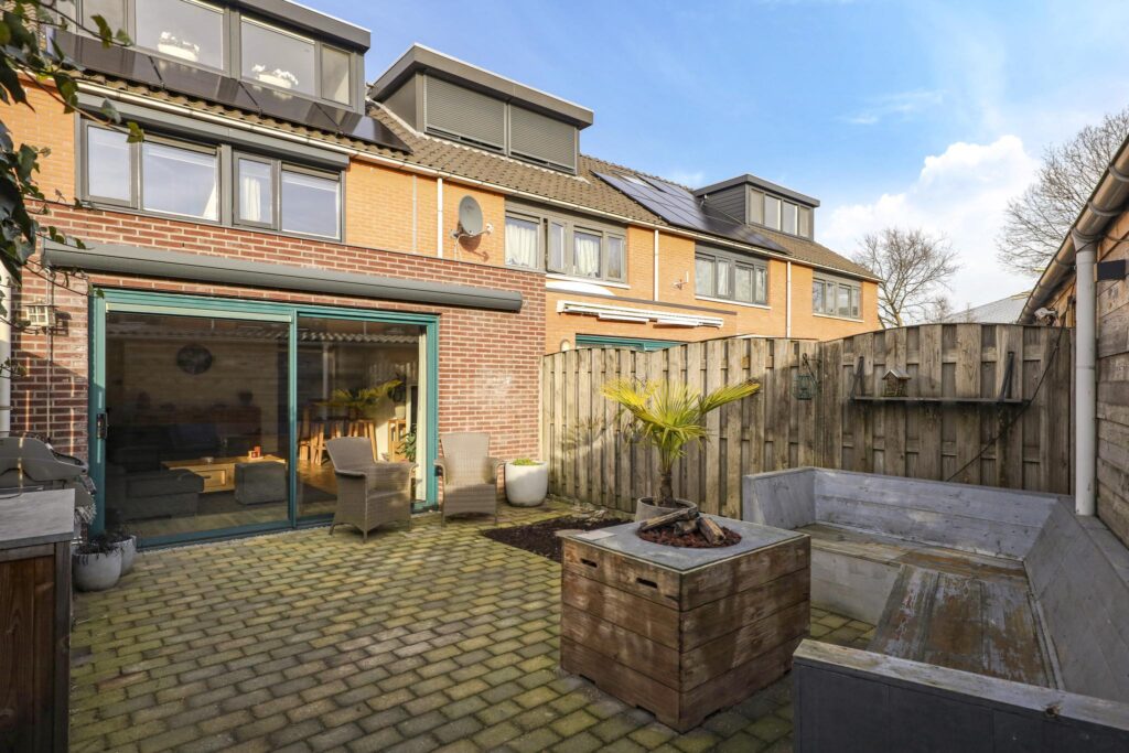 Via de brede schuifpui loop je zo de achtertuin in. De woonkamer en tuin zijn in de zomerdag ook eenvoudig bij elkaar te betrekken. Ondanks de grote uitbouw blijft er een diepe achtertuin over. Daarbij is de tuin volledig op het zuiden gelegen waardoor je hier van veel zon kunt genieten. Om die reden is er ook zonwering (een uitvalscherm) aan de achtergevel bevestigd. De tuin is nagenoeg geheel voorzien van straatwerk waardoor deze een onderhoudsvriendelijk karakter heeft. Achterin de tuin staat een schuur waar je meerder fietsen kunt stallen. Naast de schuur is het dak doorgetrokken waardoor er een handige overkapping is ontstaan. Een poort geeft hier toegang tot het achtergelegen pad.