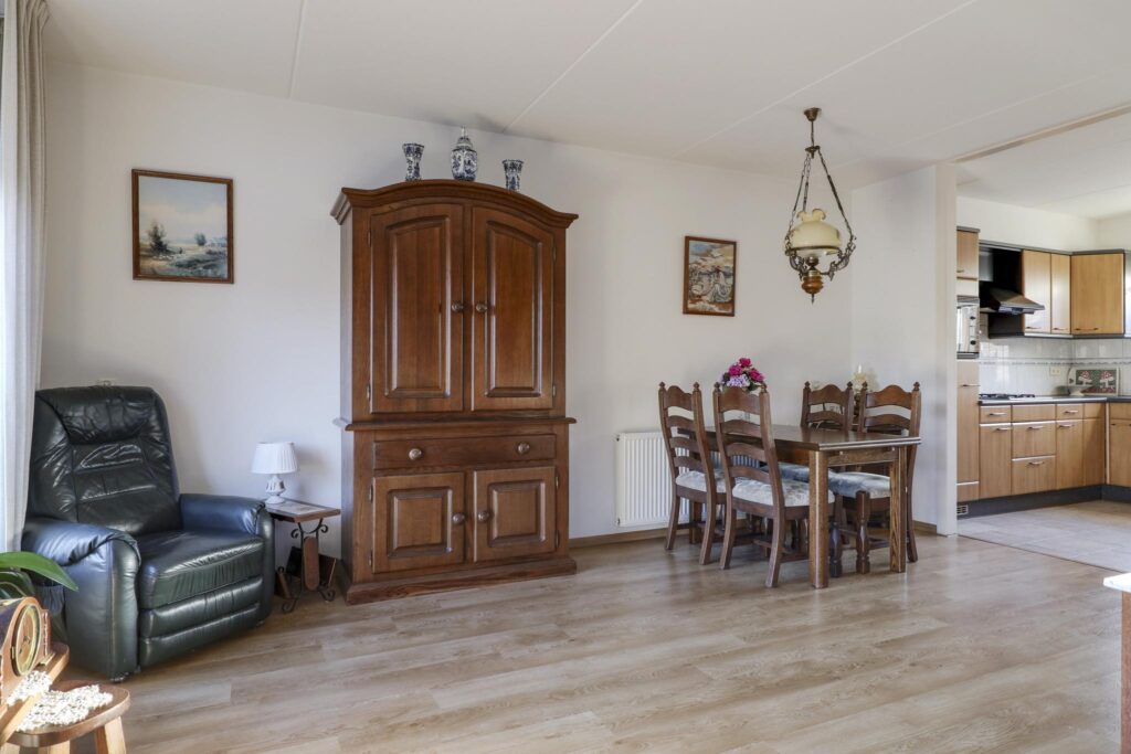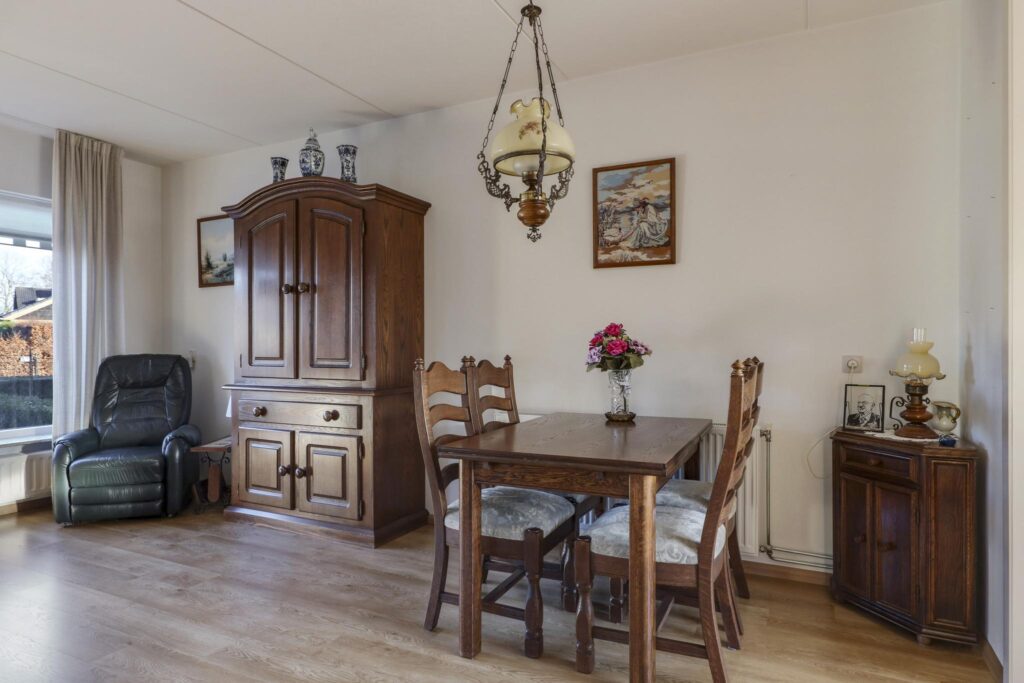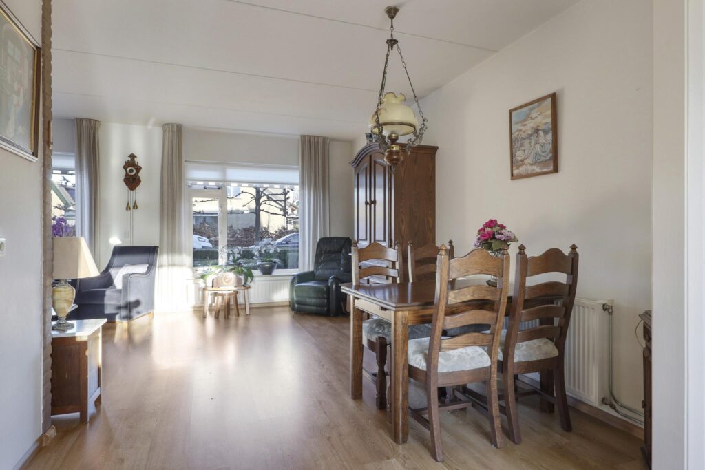 De woonkamer is aan de voorzijde gelegen en heeft een L-indeling. Speelse raampartijen zorgen voor een prettige lichtinval. Hier kun je een gezellige zithoek creëren. Richting de open keuken kun je prima een (ronde) eettafel kwijt.