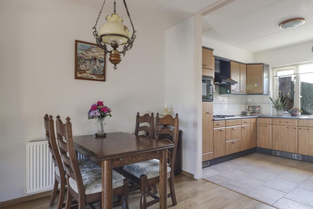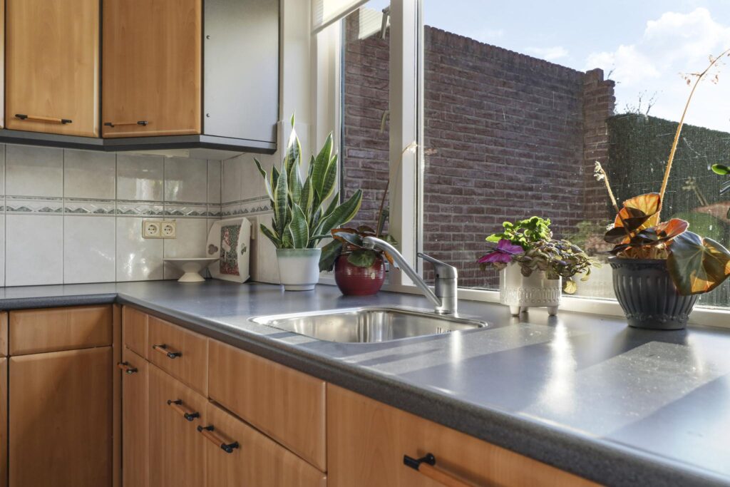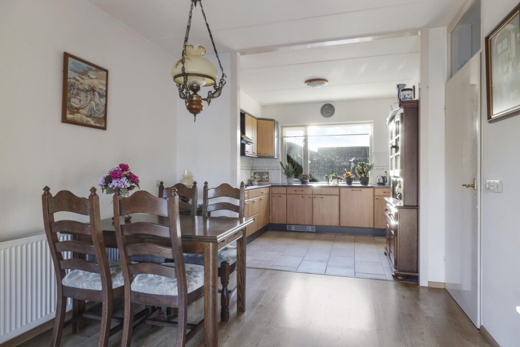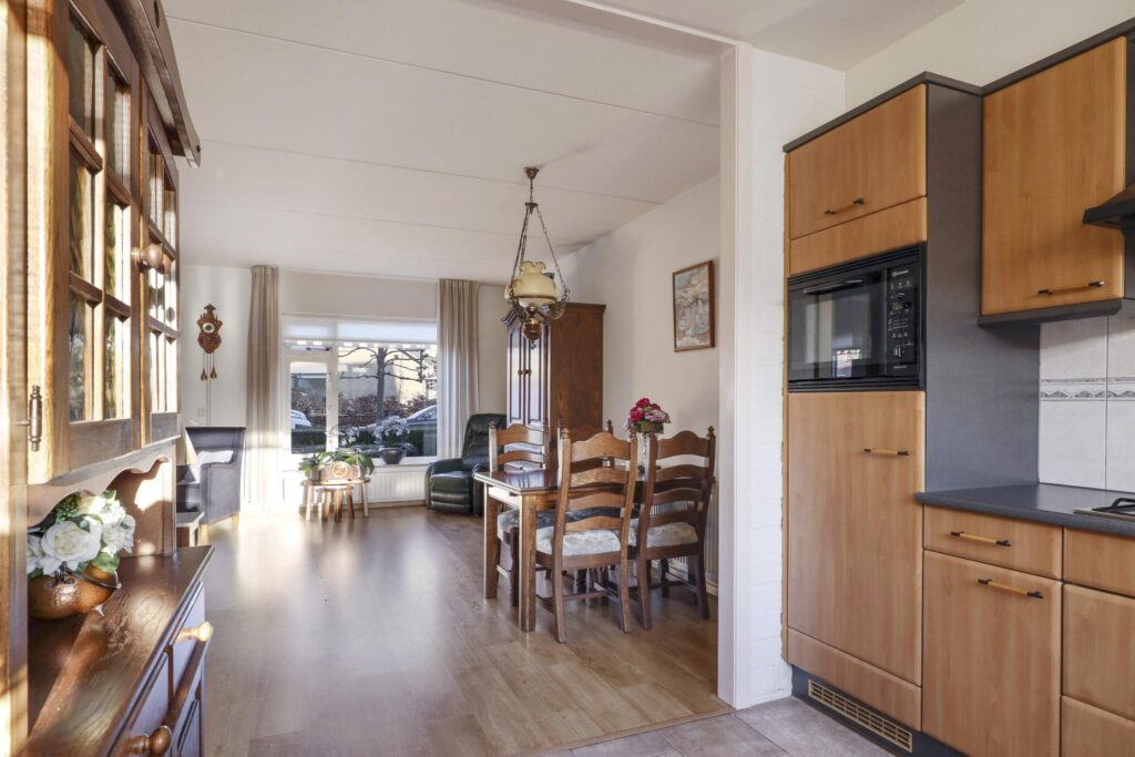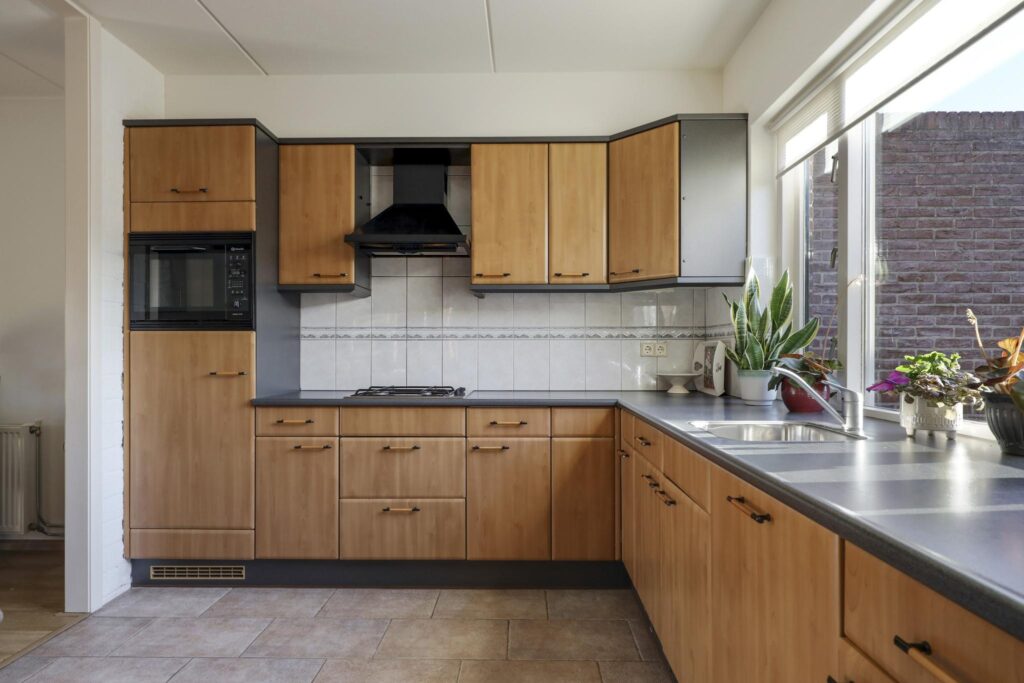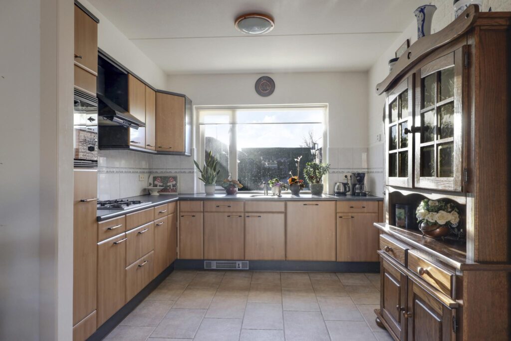 De keuken is aan de achterzijde gelegen waardoor je leuk de achtertuin in kijkt. De hoekopstelling is voorzien van inbouwapparatuur, namelijk een vaatwasser (moet nagekeken worden), een 4-pits gaskookplaat met afzuigkap, een koelkast en een combi-oven/magnetron. Het keukenblok staat er netjes bij en heeft veel kastruimte te bieden.