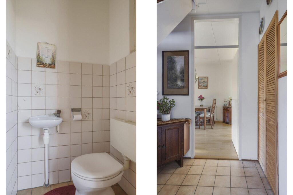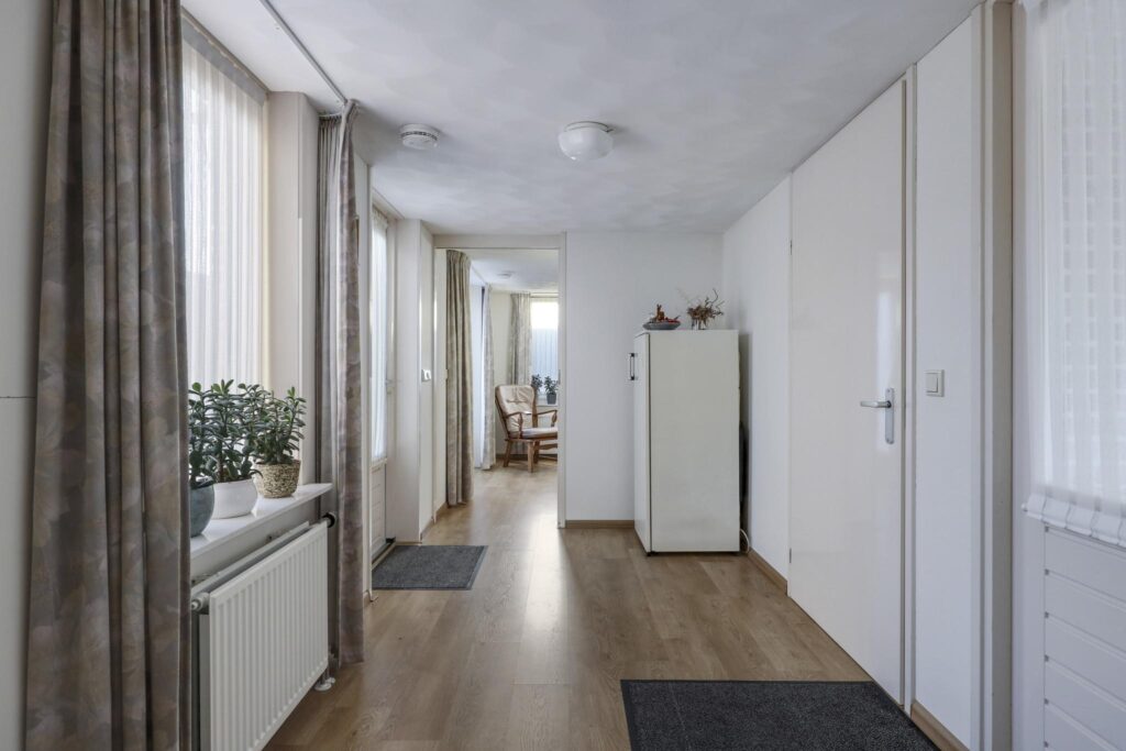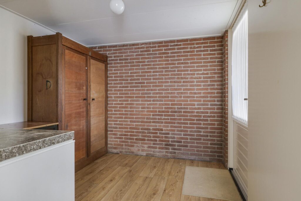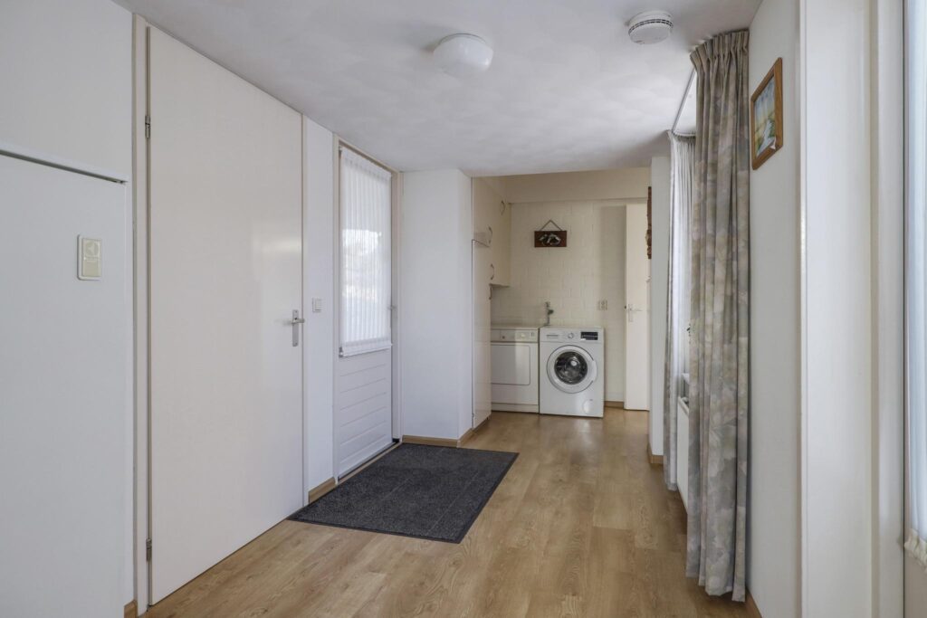 We komen wel vaker woningen met een aanbouw tegen, maar deze is wel heel verrassend en groot. Vanuit de keuken loop je door naar een soort van 2e hal c.q. bijkeuken. Dit is een prettige ruimte waar je onder meer de witgoedapparaten (naast elkaar) kwijt kunt. Tevens loop je van hieruit naar de oprit (carport), de inpandige (fietsen)berging en de achtertuin (terras).