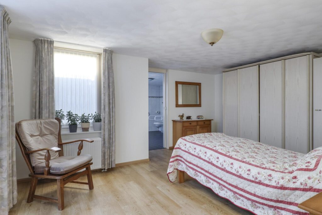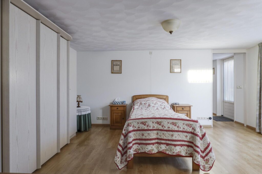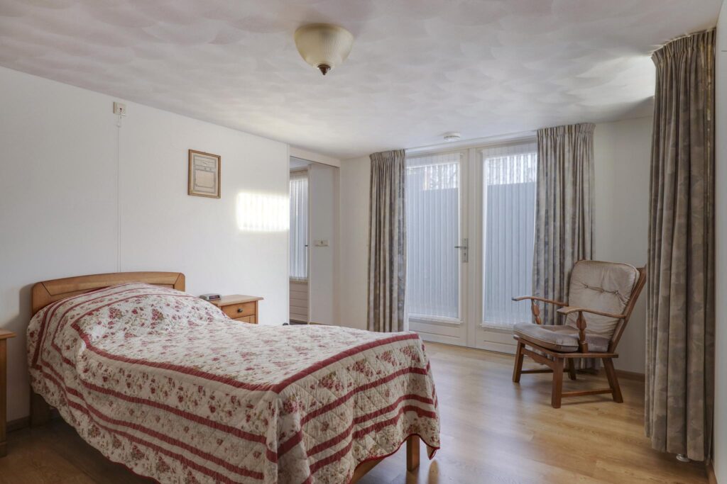 Een schuifdeur geeft toegang tot de slaapkamer op de begane grond. Met 16m2 is dit een bijzonder ruime slaapkamer waar je met gemak een 2-persoons bed en een grote linnenkast kwijt kunt. Leuk detail zijn de dubbele terrasdeuren waardoor je het buitenleven eenvoudig bij je kamer betrekt.