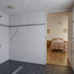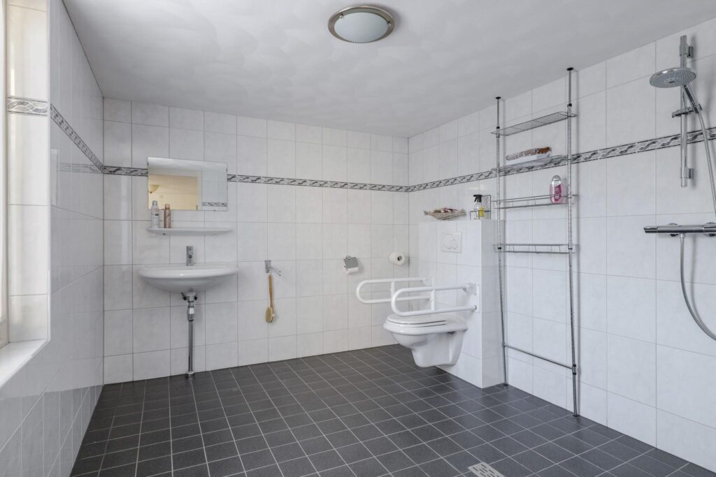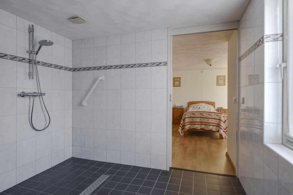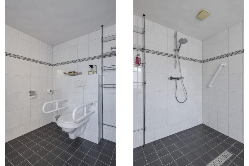 Achterin de slaapkamer loop je door naar de (afsluitbare) badkamer. De indeling bestaat uit een douchegelegenheid, een zwevend wandcloset en een wastafel met spiegel. Deze badkamer is nog relatief jong en wat meteen opvalt is de ruime opzet. Hierdoor is de badkamer ook rolstoelvriendelijk te noemen.