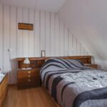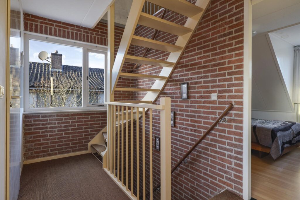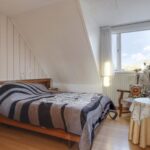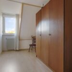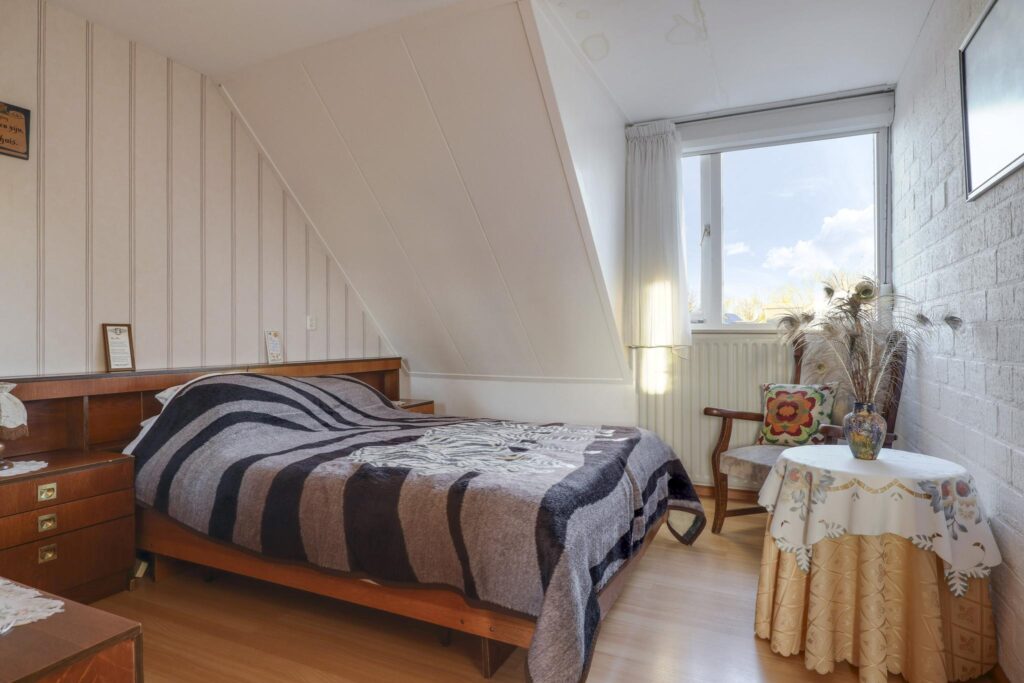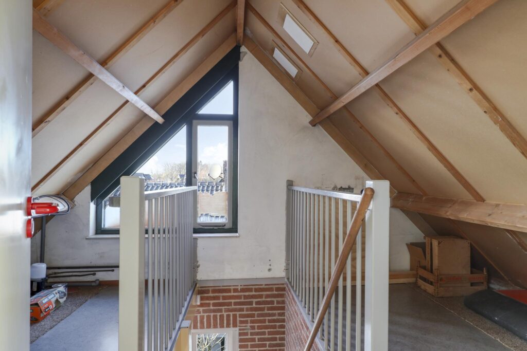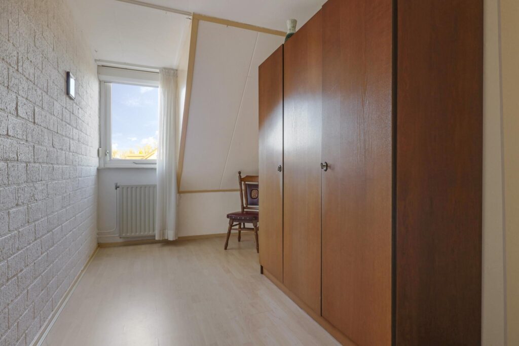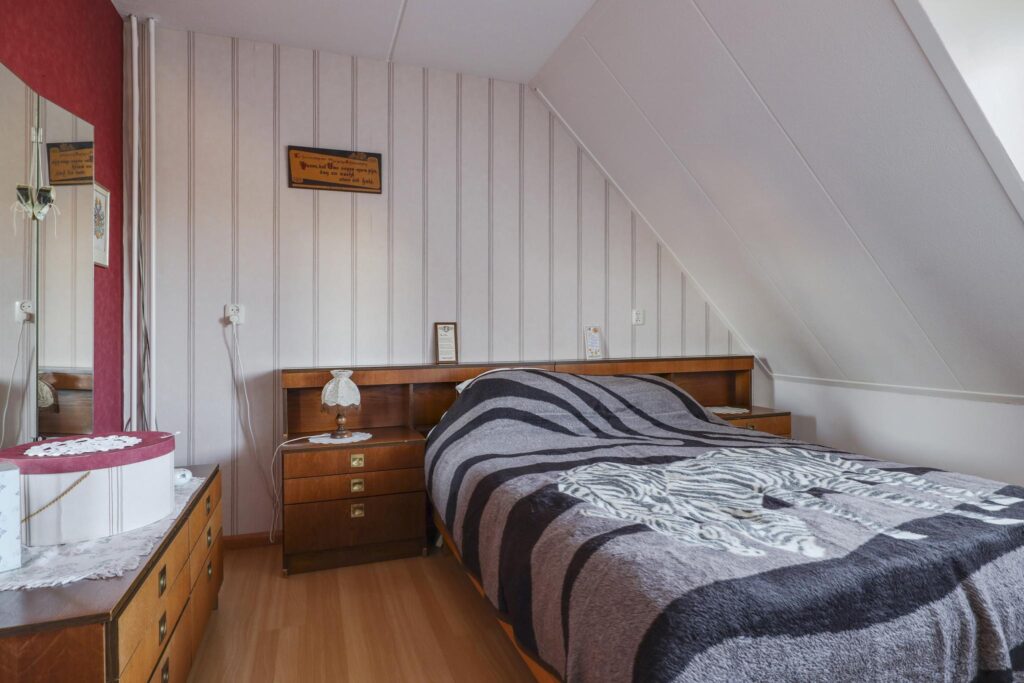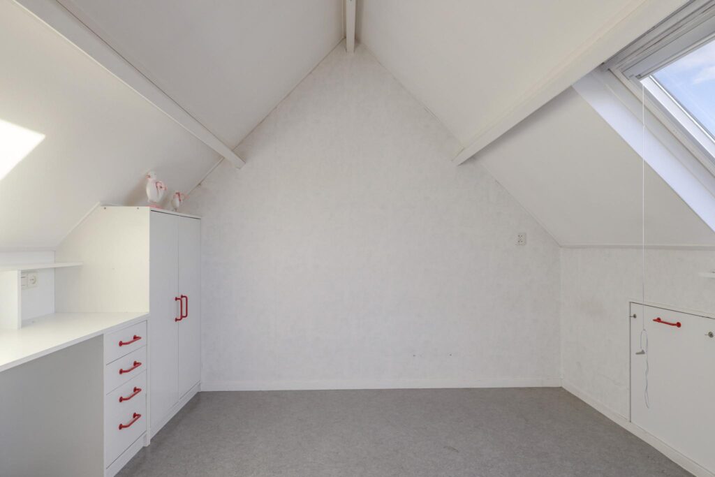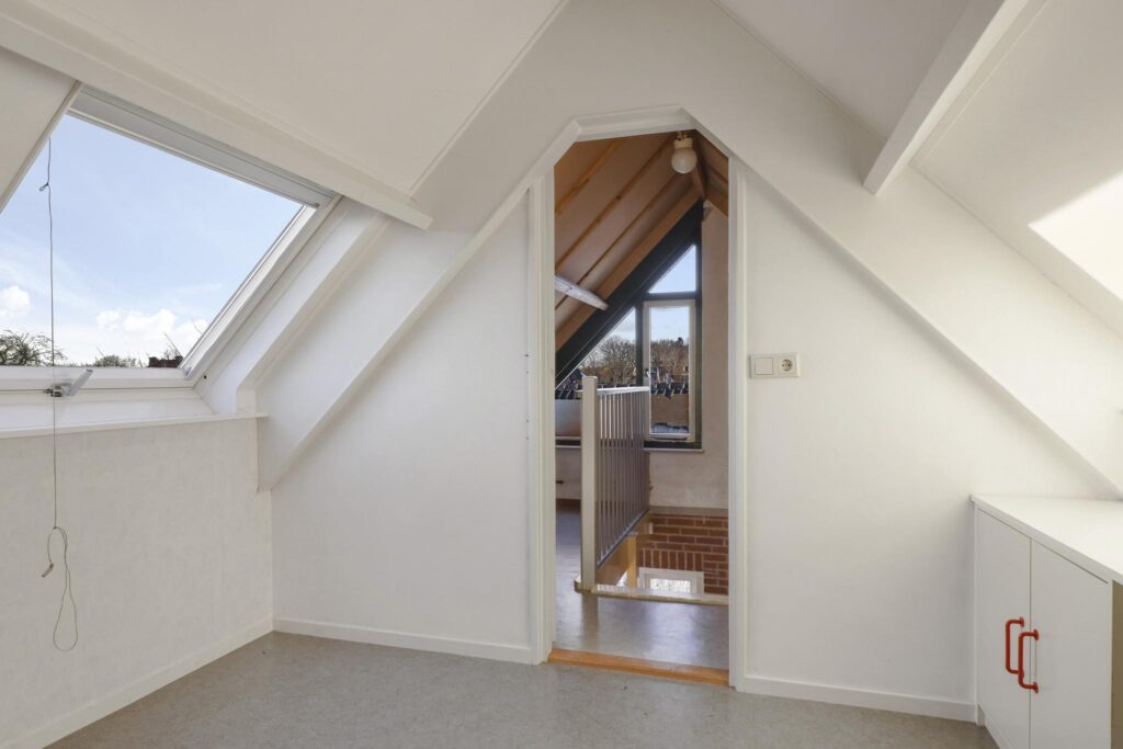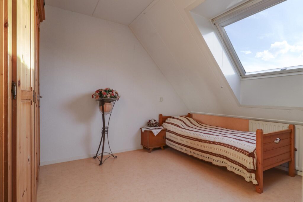 Een vaste trap maakt de 2e verdieping toegankelijk. Deze woonlaag is nog verrassend ruim, mede door de nok die op 2,5 meter hoogte ligt. Hier is een scheidingswand geplaatst waardoor de voorzolder is opgedeeld van een 4e slaapkamer. Deze slaapkamer is erg fijn om erbij te hebben aangezien je het voor verschillende doeleinden kunt inrichten. Als logeer- of werkkamer bijvoorbeeld maar je kunt ook aan verschillende hobby’s denken. Er is een groot dakvenster aanwezig alsmede opbergruimte achter de knieschotten.