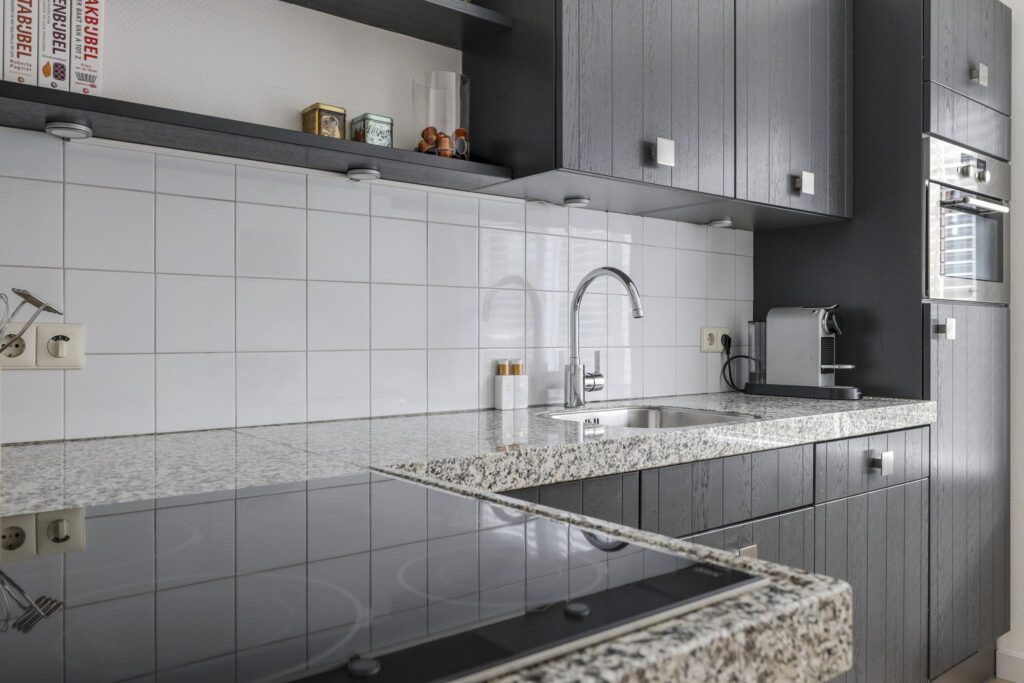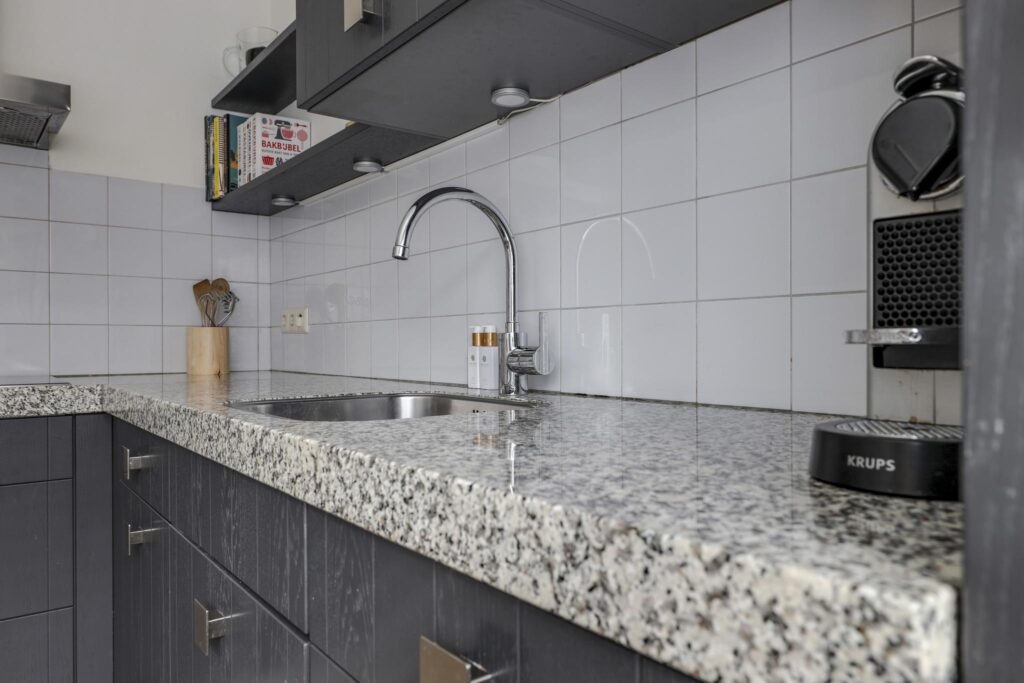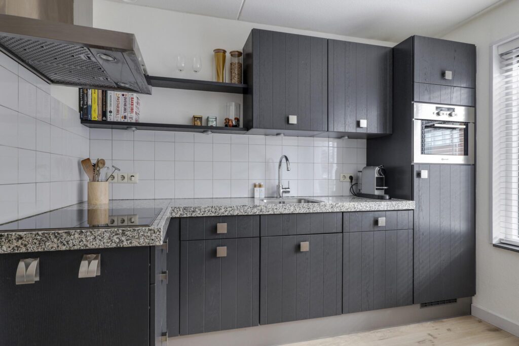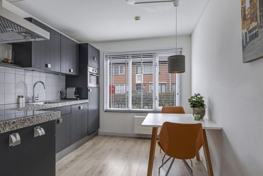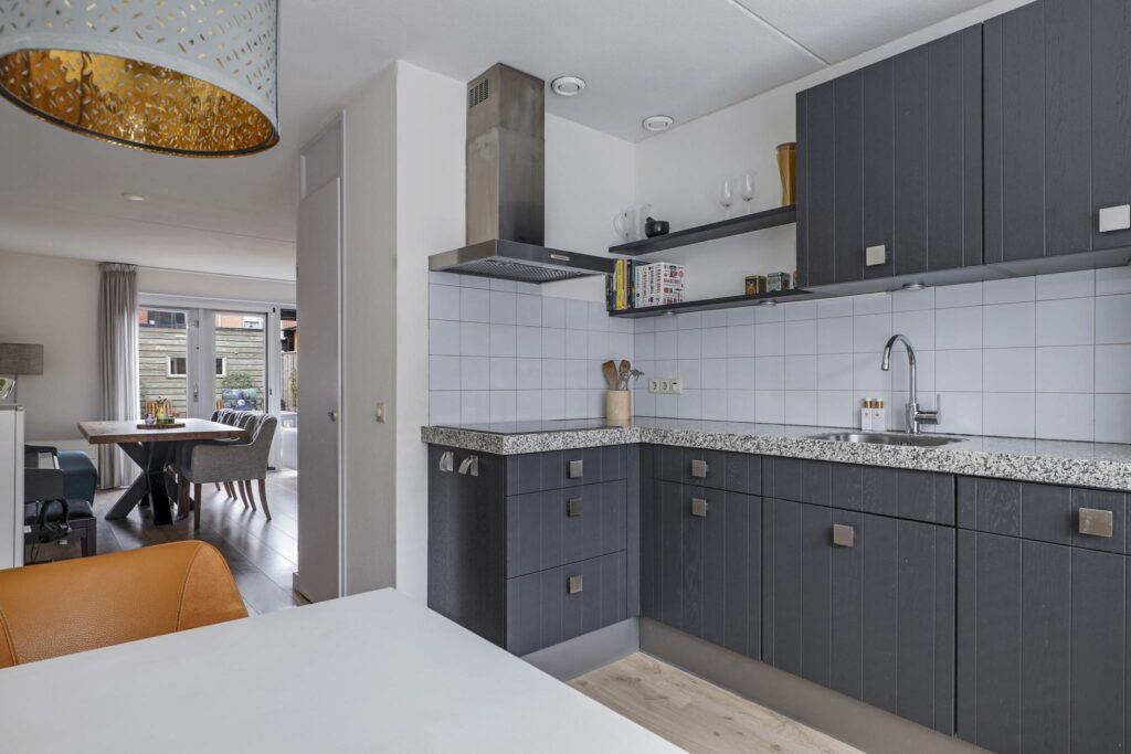 Aan de voorzijde van de woning is de keuken gesitueerd. Deze ruimte biedt plaats voor een 4-persoons eettafel waardoor je geen eethoek in de woonkamer hoeft te plaatsen. De keuken is in een hoekopstelling geplaatst met antracietkleurige houten fronten en voorzien van alle wenselijke inbouwapparatuur. Daarbij moet je denken aan een vaatwasser, koelkast, combi-oven/magnetron, 4-pits inductie kookplaat en afzuigschouw. Wat meteen opvalt is het dikke natuurstenen aanrechtblad van graniet welke stijlvol op de kleurstelling van de houten keuken is afgestemd. De keuken is compleet met draaicarrousel, spotverlichting en bijpassende wandschappen waardoor de keuken leuk is aan te kleden met accessoires.